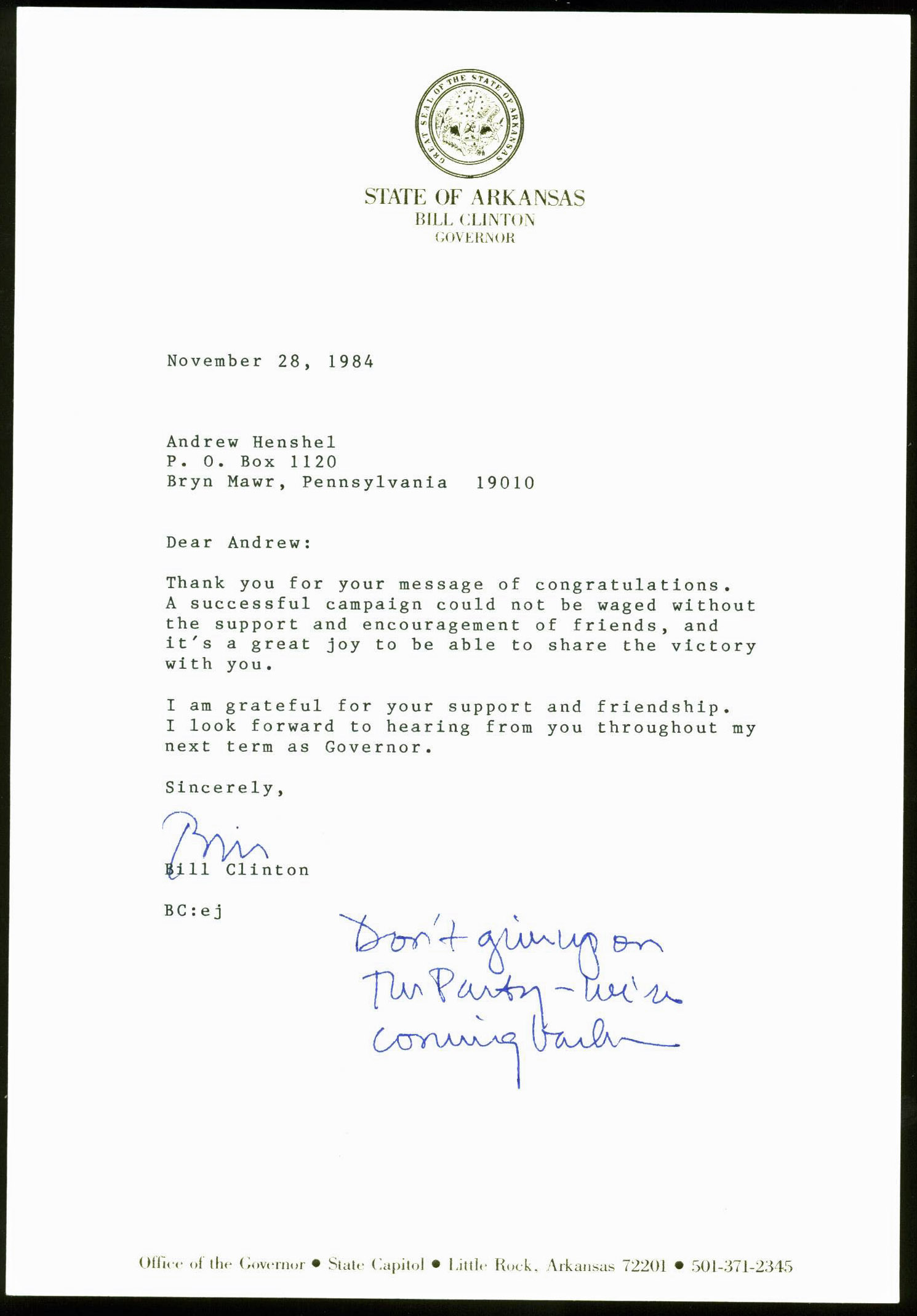 This is a 7.25x10.5 1984 Letter as Governor of AR Authentic Signed that has been Personally Signed & Autographed by Bill Clinton. This item is 100% Authentic to include a Certificate of Authenticity (COA) / hologram by PSA/DNA #Y06747.Press Pass Collectibles offers a 100% Lifetime Guarantee on all Autographed & Signed Bill Clinton memorabilia.