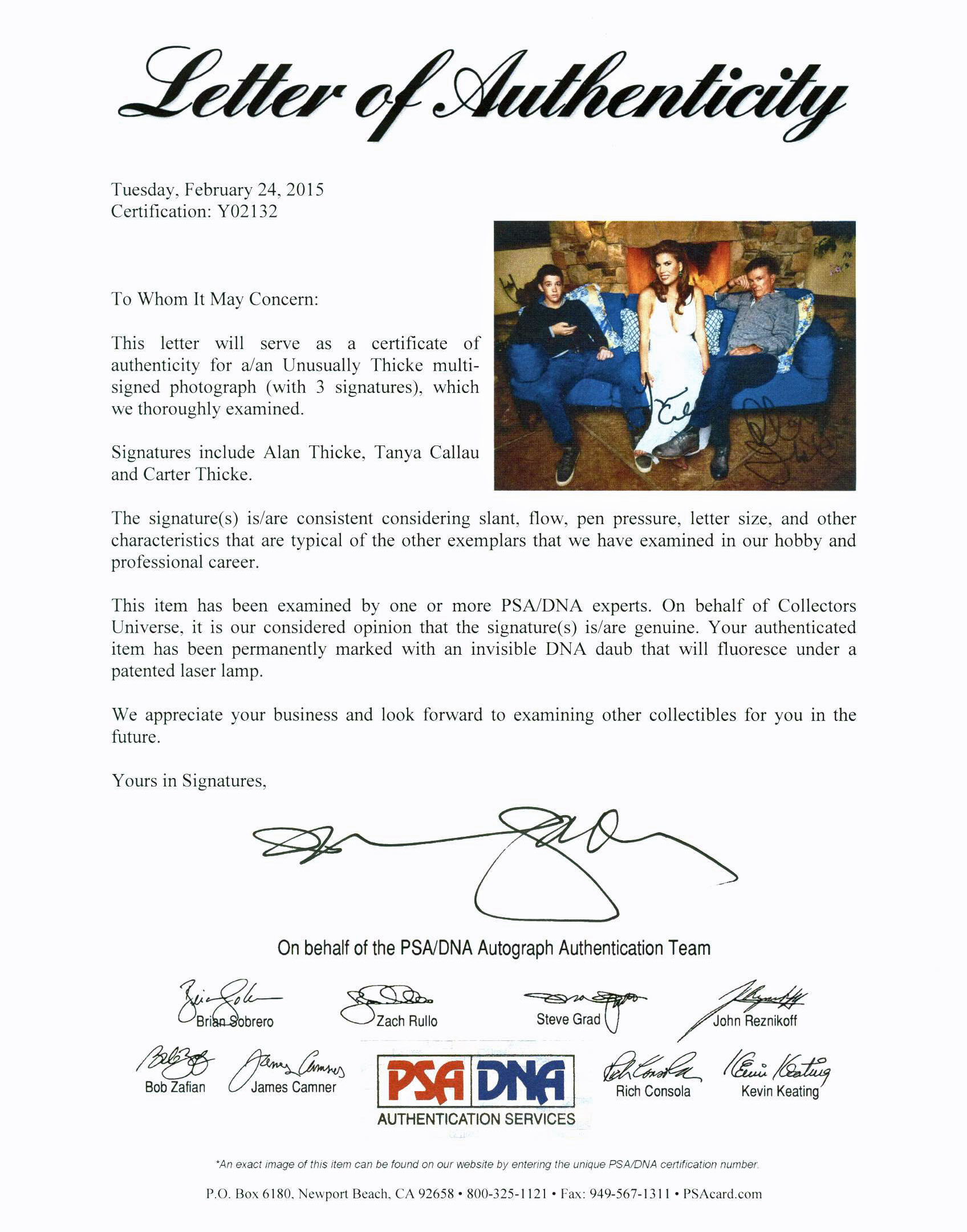 This is a Authentic Signed 8X10 Photo that has been Personally Signed & Autographed by Alan Thicke, Carter Thicke & Tanya Callau. This item is 100% Authentic to include a Certificate of Authenticity (COA) / hologram by PSA/DNA #Y02132.Press Pass Collectibles offers a 100% Lifetime Guarantee on all Autographed & Signed Alan Thicke, Carter Thicke & Tanya Callau memorabilia.