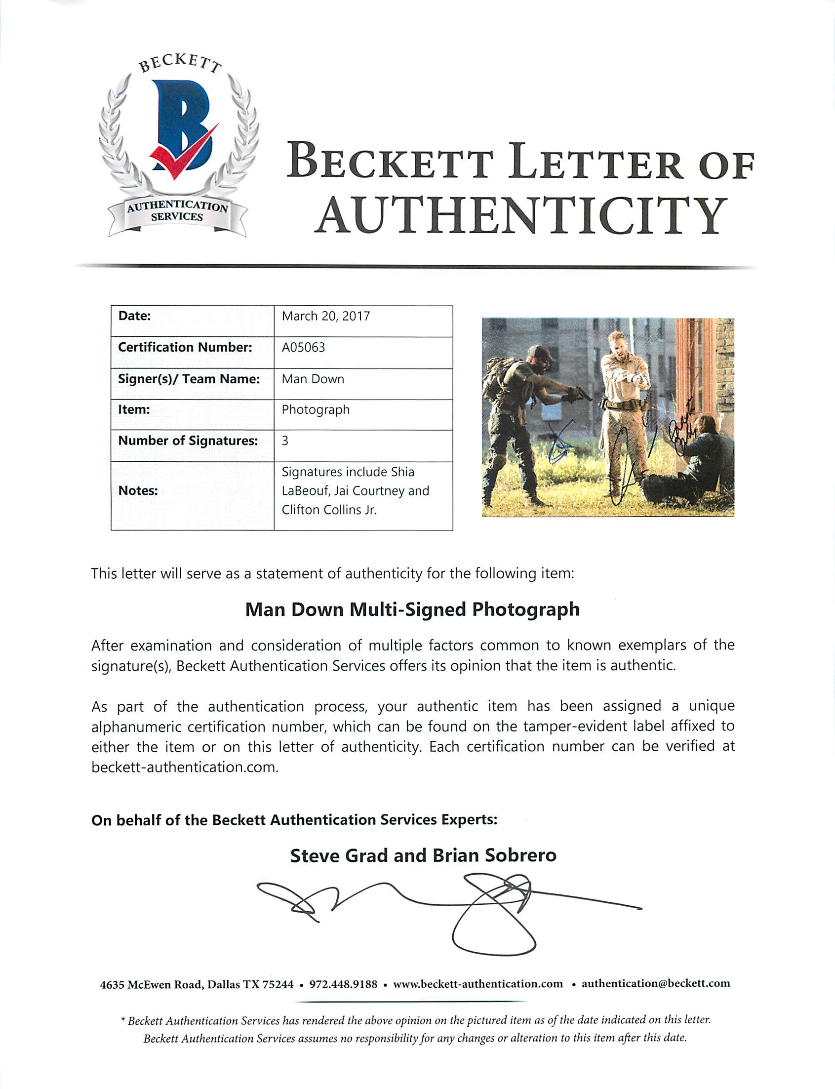 This is a Authentic Signed 11X14 Photo that has been Personally Signed & Autographed by Shia LaBeouf, Jai Courtney, Clifton Collins Jr. This item is 100% Authentic to include a Certificate of Authenticity (COA) / hologram by Beckett Authentication Services #A05063. Press Pass Collectibles offers a 100% Lifetime Guarantee on all Autographed & Signed Shia LaBeouf, Jai Courtney, Clifton Collins Jr memorabilia. Industry-Leading Autograph Experts Unite with an Iconic Hobby Brand: Introducing Beckett Authentication Services (BAS)The most respected autograph authentication experts in the world have teamed up with one of the most respected brands in collectibles. Beckett Authentication Services (BAS) is led by renowned autograph expert Steve Grad of Pawn Stars fame, who has spent the last 15 years as the principal authenticator for PSA/DNA. During his tenure, Grad used his expertise not only to build the brand and reputation of PSA/DNA, but also to help establish third party authentication as a universally accepted and respected practice in the hobby. Grad has examined and authenticated some of the finest autographed relics to ever surface in the market, and his opinion is regarded as the "gold standard" among collectors, dealers and auction houses across the world. Since 2013, Grad has also served as an autograph expert for Pawn Stars on The History Channel, and will continue to appear on the popular show representing BAS. Joining Grad on the BAS authentication team is Brian Sobrero. An authenticator with PSA/DNA since 2009, Sobrero's extensive experience in the autograph business combined with his unique skill set have quickly propelled him to becoming one of the most respected opinions in the autograph industry. Together, the team of Steve Grad and Brian Sobrero, combined with Beckett --a pillar of integrity in the collectibles marketplace -- makes Beckett Authentication Services the new leading force in autograph authentication.