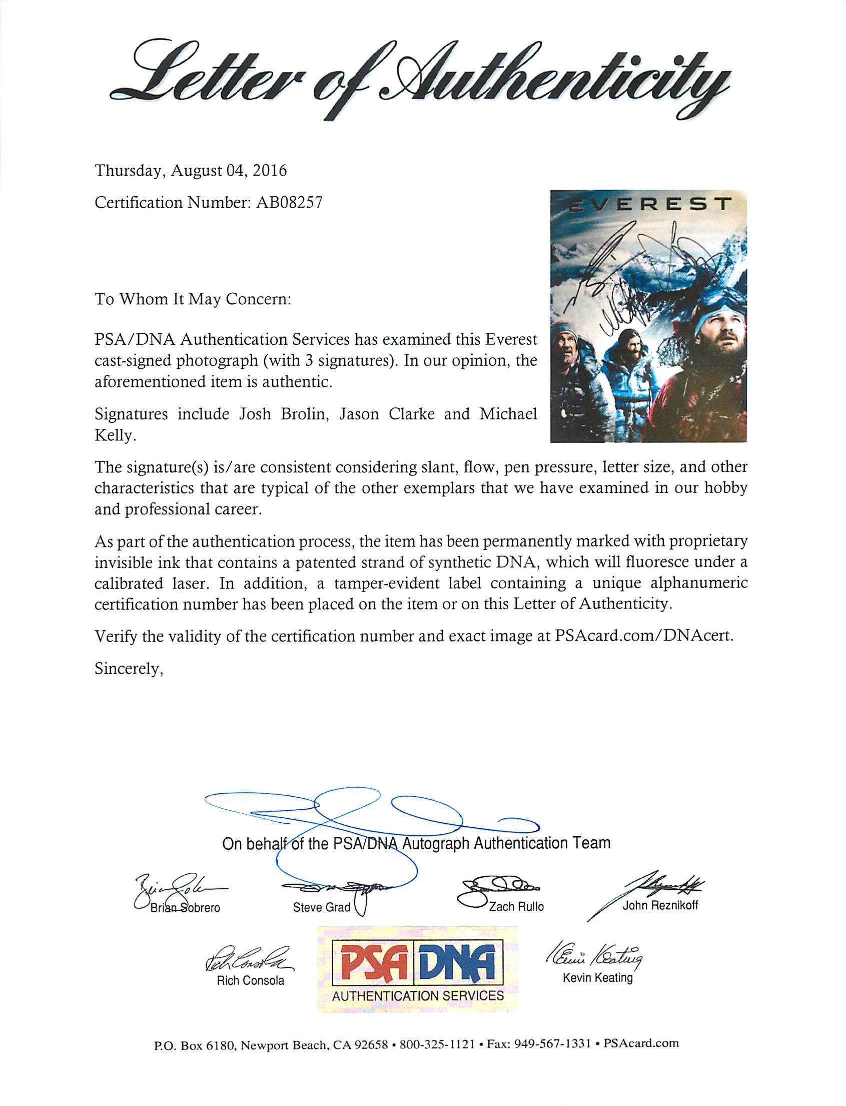 This is a Authentic Signed 11X14 Photo that has been Personally Signed & Autographed by Josh Brolin, Jason Clarke & Michael Kelly. This item is 100% Authentic to include a Certificate of Authenticity (COA) / hologram by PSA/DNA #AB08257.Press Pass Collectibles offers a 100% Lifetime Guarantee on all Autographed & Signed Josh Brolin, Jason Clarke & Michael Kelly memorabilia.
