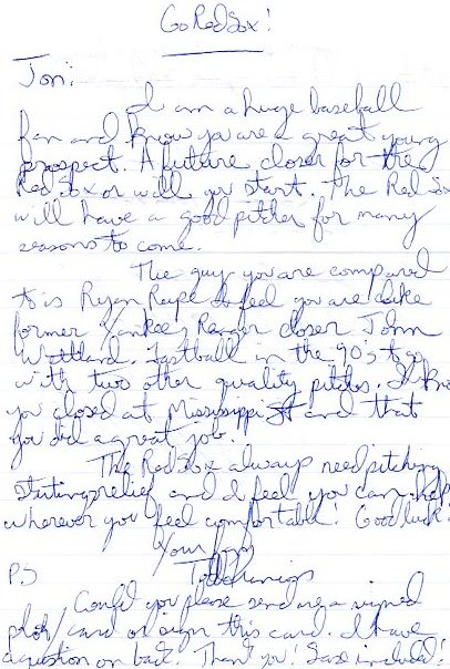 This PHILLIES JONATHAN PAPELBON SIGNED 6X9 MINOR LEAGUE LETTER PSA/DNA #F89975 has been certified authentic. This is a handwritten letter by a fan, to Papelbon while he was in the minors. Papelbon wrote a short note at the end and signed the letter. It will include the PSA/DNA numbered hologram and matching Certificate of Authenticity.