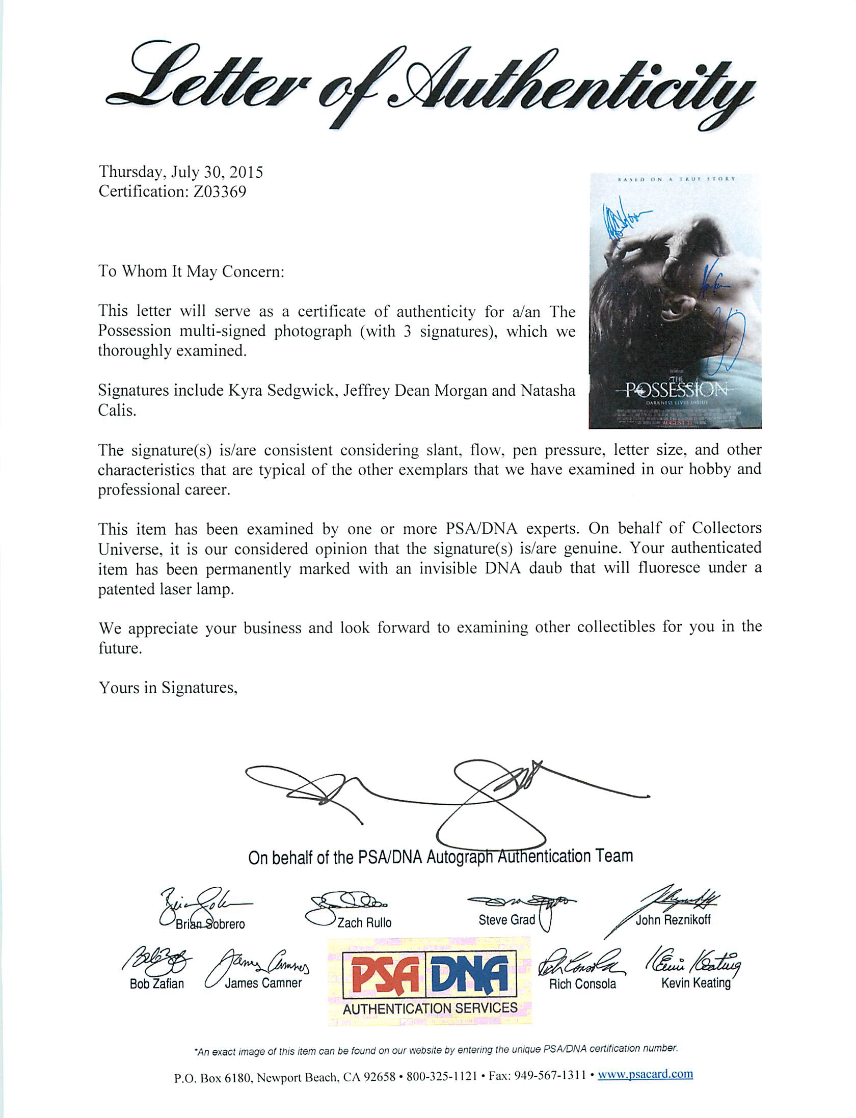 This is an Authentic Signed 12x18 Photo that has been Personally Signed & Autographed by The Possession Cast (3) Kyra Sedgwick, Jeffrey Dean Morgan & Natasha Calis. This item is 100% Authentic to include a Certificate of Authenticity (COA) / hologram by PSA/DNA #Z03369.Press Pass Collectibles offers a 100% Lifetime Guarantee on all Autographed & Signed The Possession Cast (3) memorabilia.