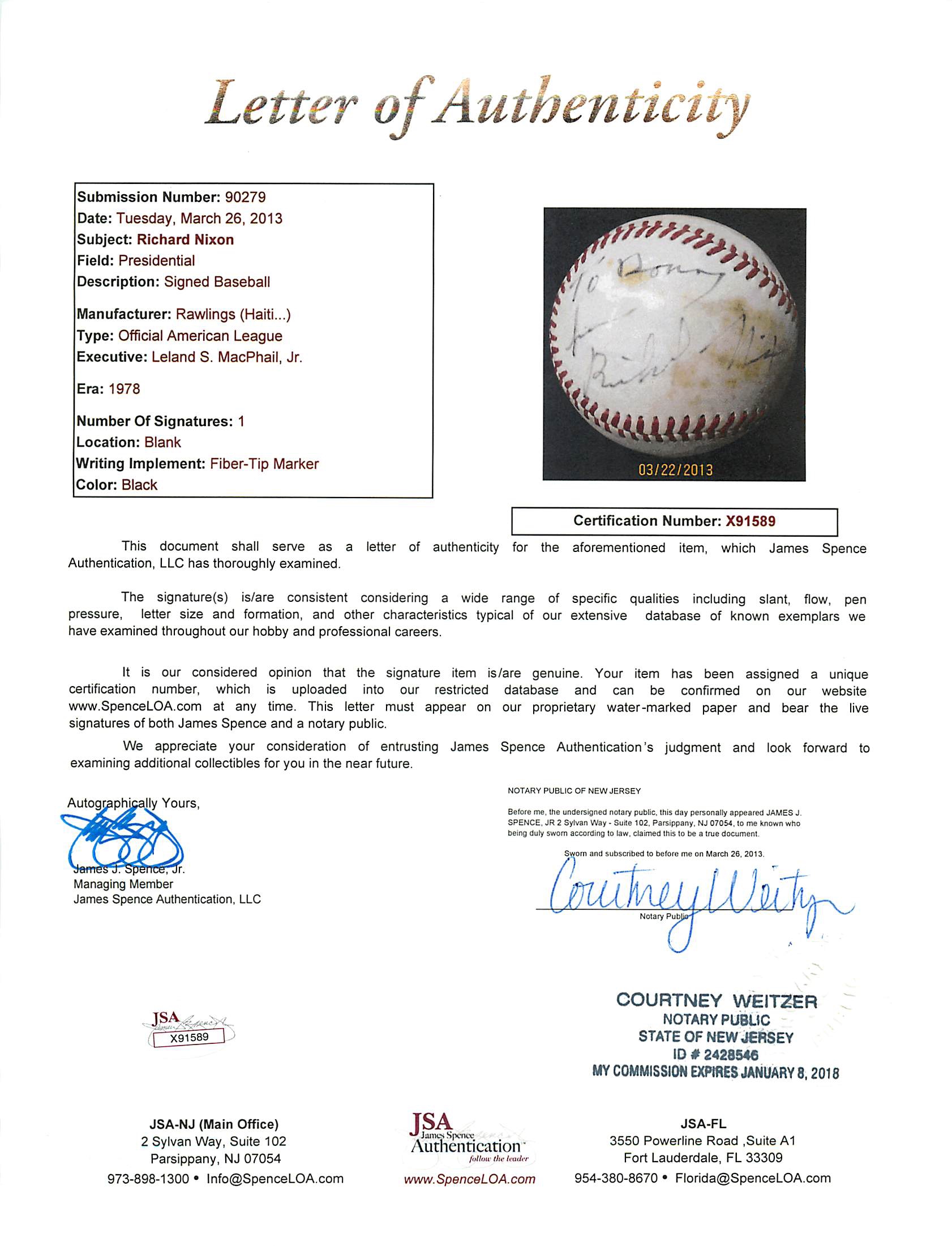 This is a Signed Authentic OML Baseball that has been Personally Signed & Autographed by Richard Nixon. Nixon added "To Donny From". This item is 100% Authentic to include a Certificate of Authenticity (COA) / hologram by JSA #X91589.Press Pass Collectibles offers a 100% Lifetime Guarantee on all Autographed & Signed Richard Nixon memorabilia.