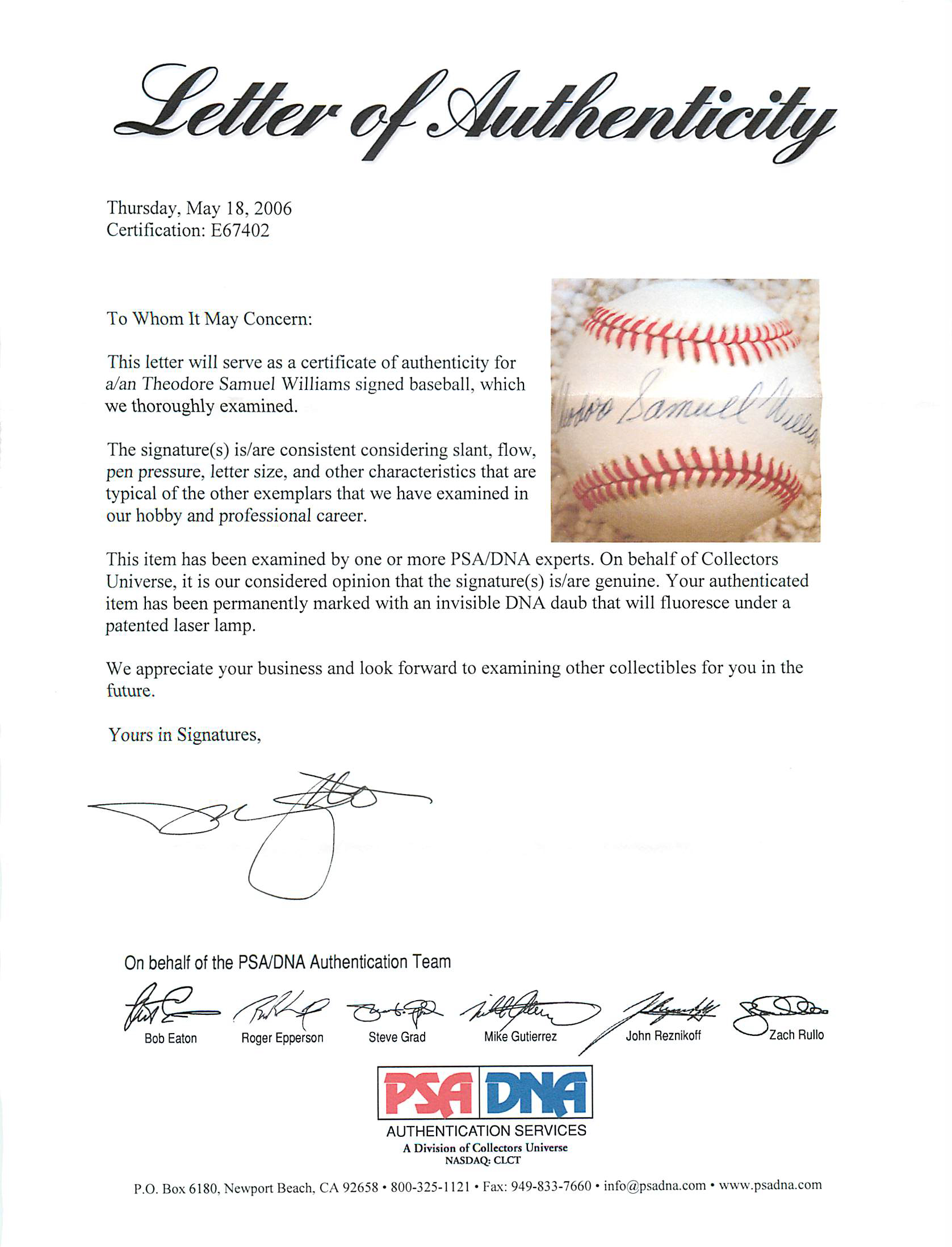 This is a Signed Authentic OAL Baseball that has been Personally Signed & Autographed by Ted "Theodore Samuel" Williams. This item is 100% Authentic to include a Certificate of Authenticity (COA) / hologram by PSA/DNA #E67402.Press Pass Collectibles offers a 100% Lifetime Guarantee on all Autographed & Signed Ted "Theodore Samuel" Williams memorabilia.