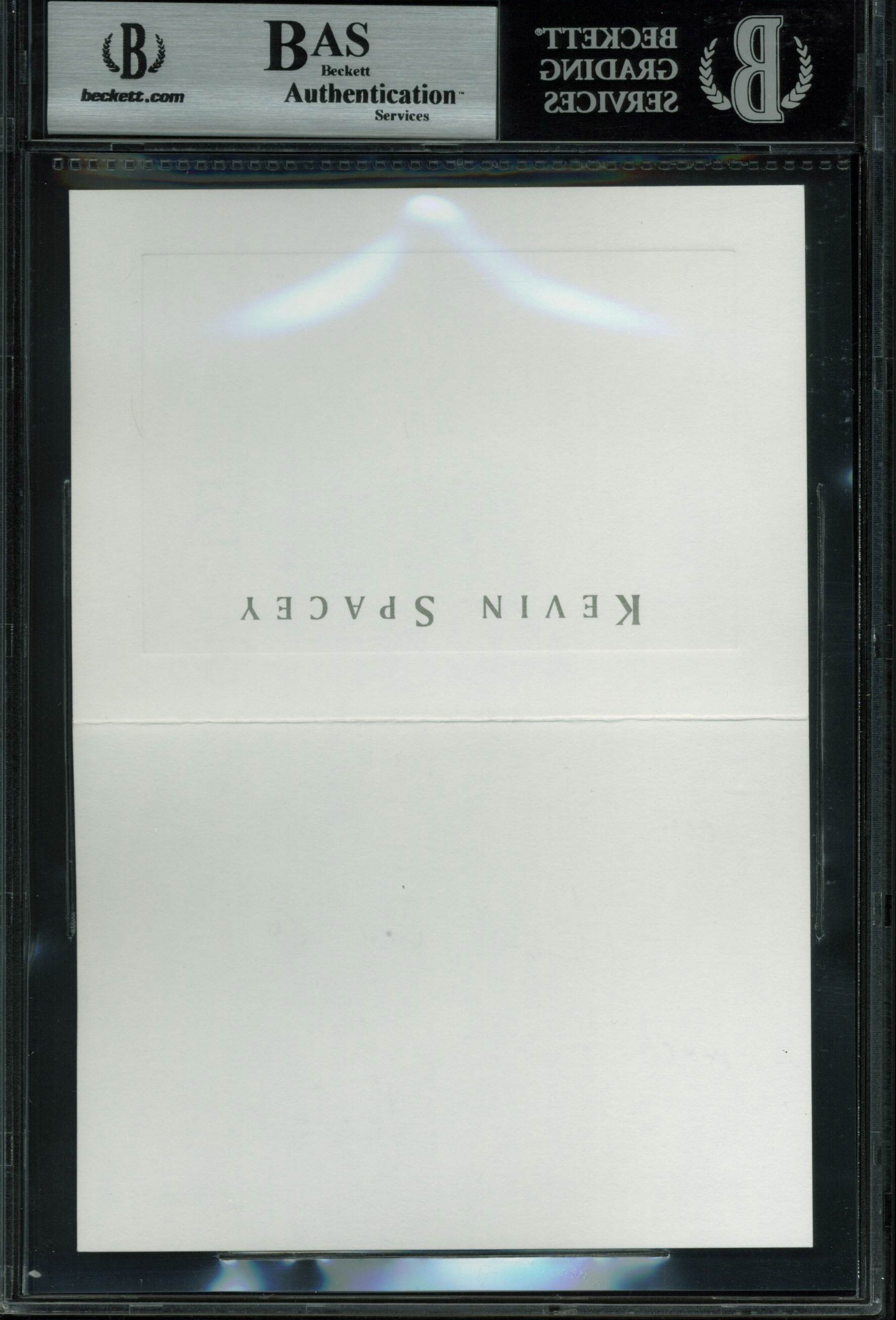 This is a 3.5x5 Thank You Card Authentic Signed that has been Personally Signed & Autographed by Kevin Spacey. This item is 100% Authentc, it comes slabbed and authenticated by Beckett Authentication Services. Press Pass Collectibles offers a 100% Lifetime Guarantee on all Autographed & Signed Kevin Spacey memorabilia. Industry-Leading Autograph Experts Unite with an Iconic Hobby Brand: Introducing Beckett Authentication Services (BAS)The most respected autograph authentication experts in the world have teamed up with one of the most respected brands in collectibles. Beckett Authentication Services (BAS) is led by renowned autograph expert Steve Grad of Pawn Stars fame, who has spent the last 15 years as the principal authenticator for PSA/DNA. During his tenure, Grad used his expertise not only to build the brand and reputation of PSA/DNA, but also to help establish third party authentication as a universally accepted and respected practice in the hobby. Grad has examined and authenticated some of the finest autographed relics to ever surface in the market, and his opinion is regarded as the "gold standard" among collectors, dealers and auction houses across the world. Since 2013, Grad has also served as an autograph expert for Pawn Stars on The History Channel, and will continue to appear on the popular show representing BAS. Joining Grad on the BAS authentication team is Brian Sobrero. An authenticator with PSA/DNA since 2009, Sobrero's extensive experience in the autograph business combined with his unique skill set have quickly propelled him to becoming one of the most respected opinions in the autograph industry. Together, the team of Steve Grad and Brian Sobrero, combined with Beckett --a pillar of integrity in the collectibles marketplace -- makes Beckett Authentication Services the new leading force in autograph authentication.