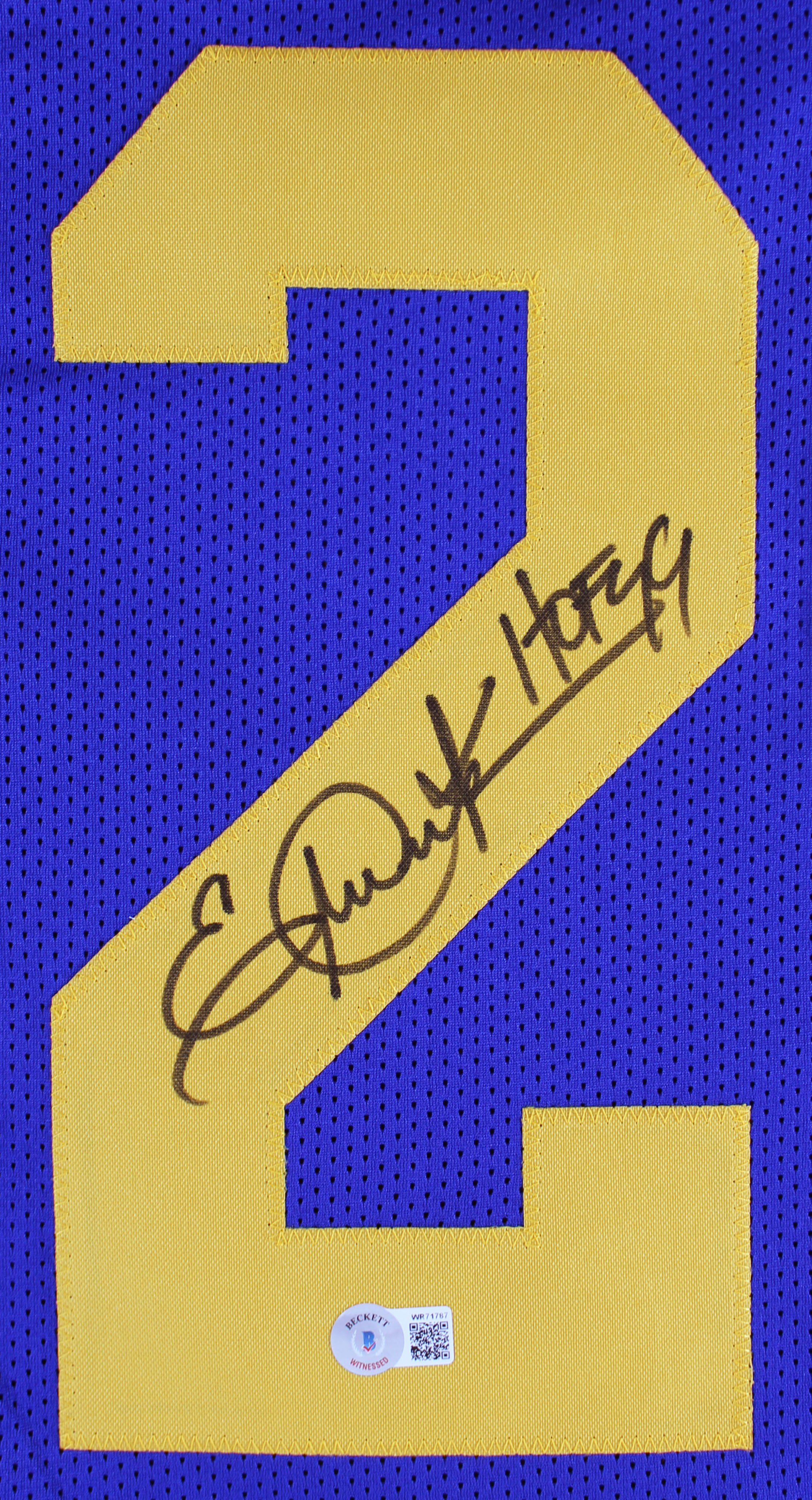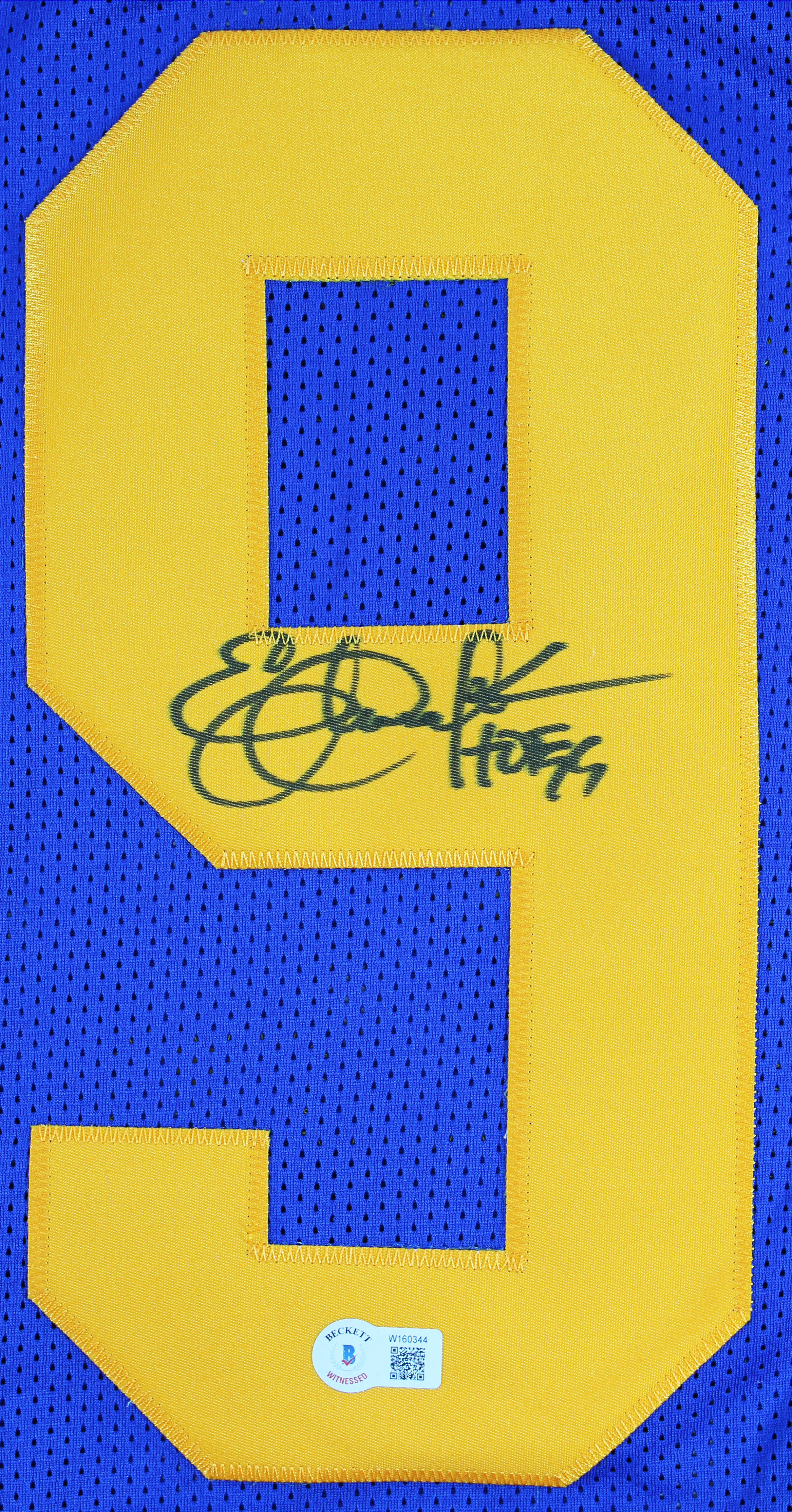 This is a "HOF 99" Authentic Signed Blue Jersey that has been Personally Signed & Autographed by Eric Dickerson of the Los Angeles Rams. This item is 100% Authentic to include a hologram by Beckett Authentication Services. This item will come with the new Beckett Authentication hologram that has a scannable QR code rather than the traditional COA. If you would like to have a COA, you are welcome to reach out to Beckett for a printed certification once you receive your item. This is a BAS Witnessed Protection Program item which means a Beckett Authentication Service representative was present when this item was being signed. This is a stock item. We conducted an autograph signing with Eric Dickerson where multiples of the same item were signed. While the photographs are representative of this item, the size, placement and strength of the signature may vary. Each item is hand signed, therefore, each autograph is unique. This item can be verified through BAS Witnessed. This is a size XL custom stitched non-branded jersey.