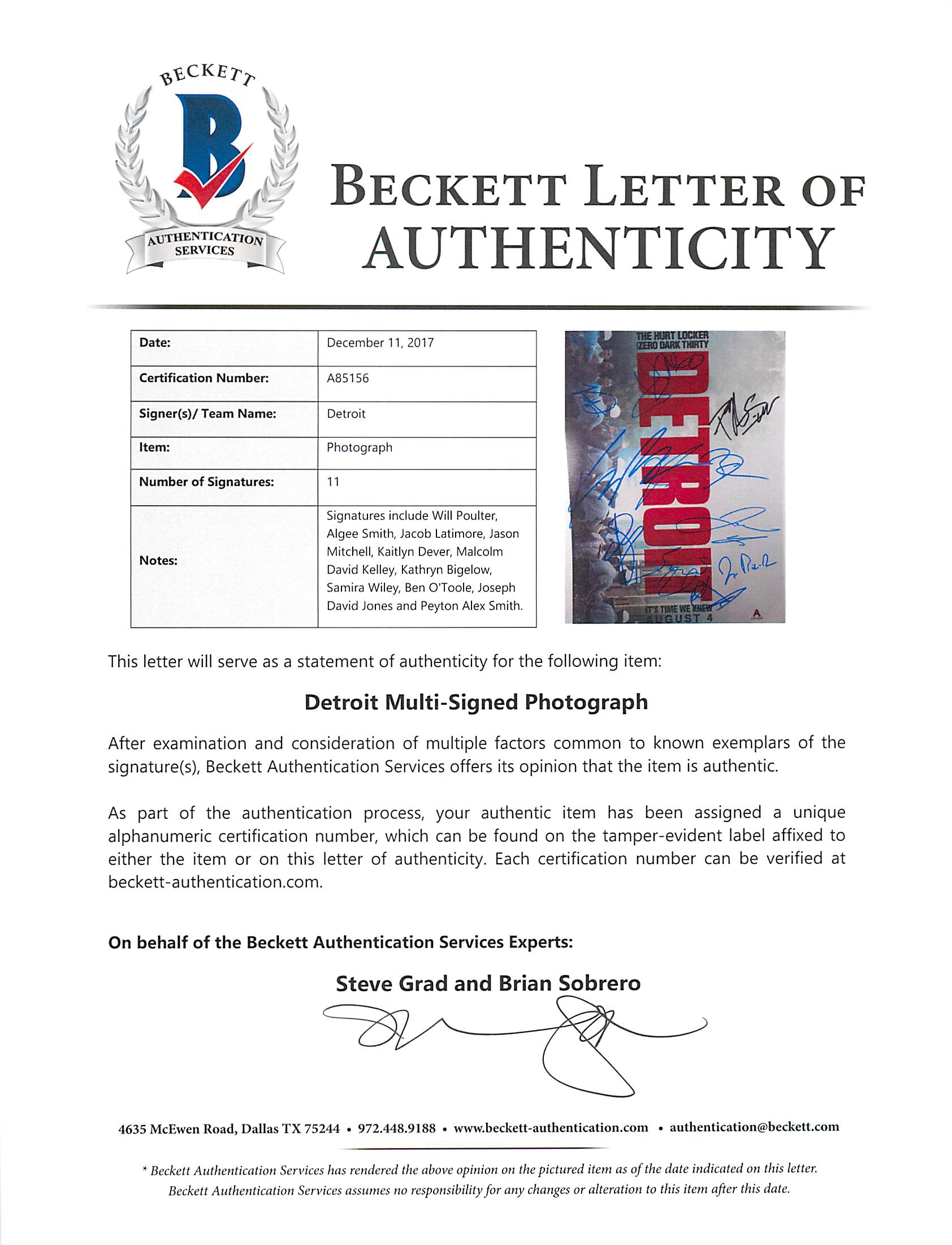 This Autographed 11x14 Photo has been Personally Signed by Kathryn Bigelow, Will Poulter, Algee Smith, Jacob Latimore, Jason Mitchell, Kaitlyn Dever, Malcom David Kelley, Samira Wiley, Ben O'Toole, Joseph David Jones & Peyton Alex Smith of Detroit. This item is 100% Authentic to include a Certificate of Authenticity (COA) / hologram by Beckett Authentication Services.The authenticity can be verified on Beckett Authentication Services website. Press Pass Collectibles only offers Authentic Autographs by Kathryn Bigelow, Will Poulter, Algee Smith, Jacob Latimore, Jason Mitchell, Kaitlyn Dever, Malcom David Kelley, Samira Wiley, Ben O'Toole, Joseph David Jones & Peyton Alex Smith through Signings, In-Person Signings or Private Collections to include a 100% money back Lifetime Authenticity Guarantee.