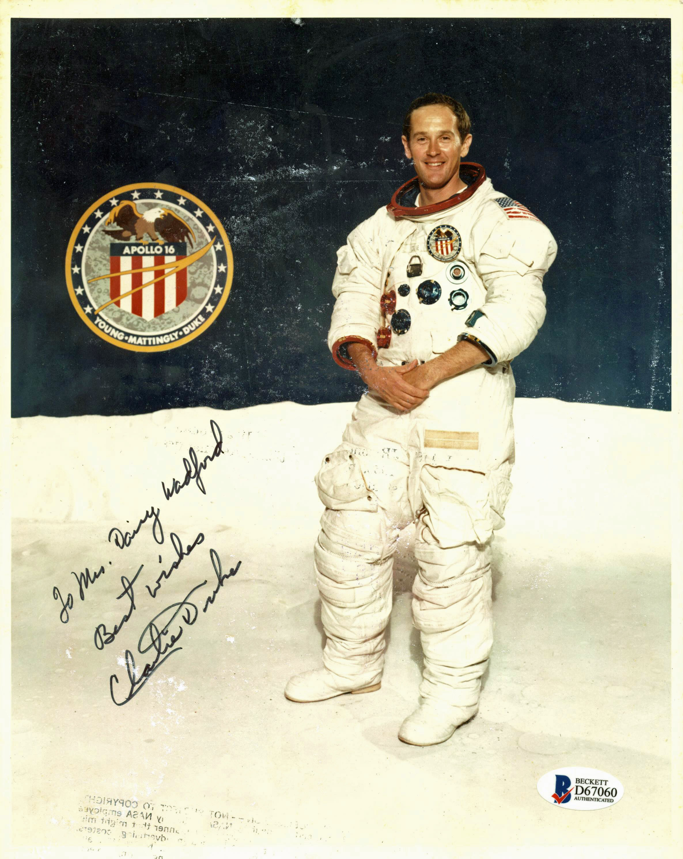 This Autographed 8x10 Photo with the inscription of "To Mrs. Daisy Wadford, Best Wishes" has been Personally Signed by Charles Duke. This item is 100% Authentic to include a Certificate of Authenticity (COA) / hologram by Beckett Authentication Services.The authenticity can be verified on Beckett Authentication Services website. Press Pass Collectibles only offers Authentic Autographs by Charles Duke through Signings, In-Person Signings or Private Collections to include a 100% money back Lifetime Authenticity Guarantee.