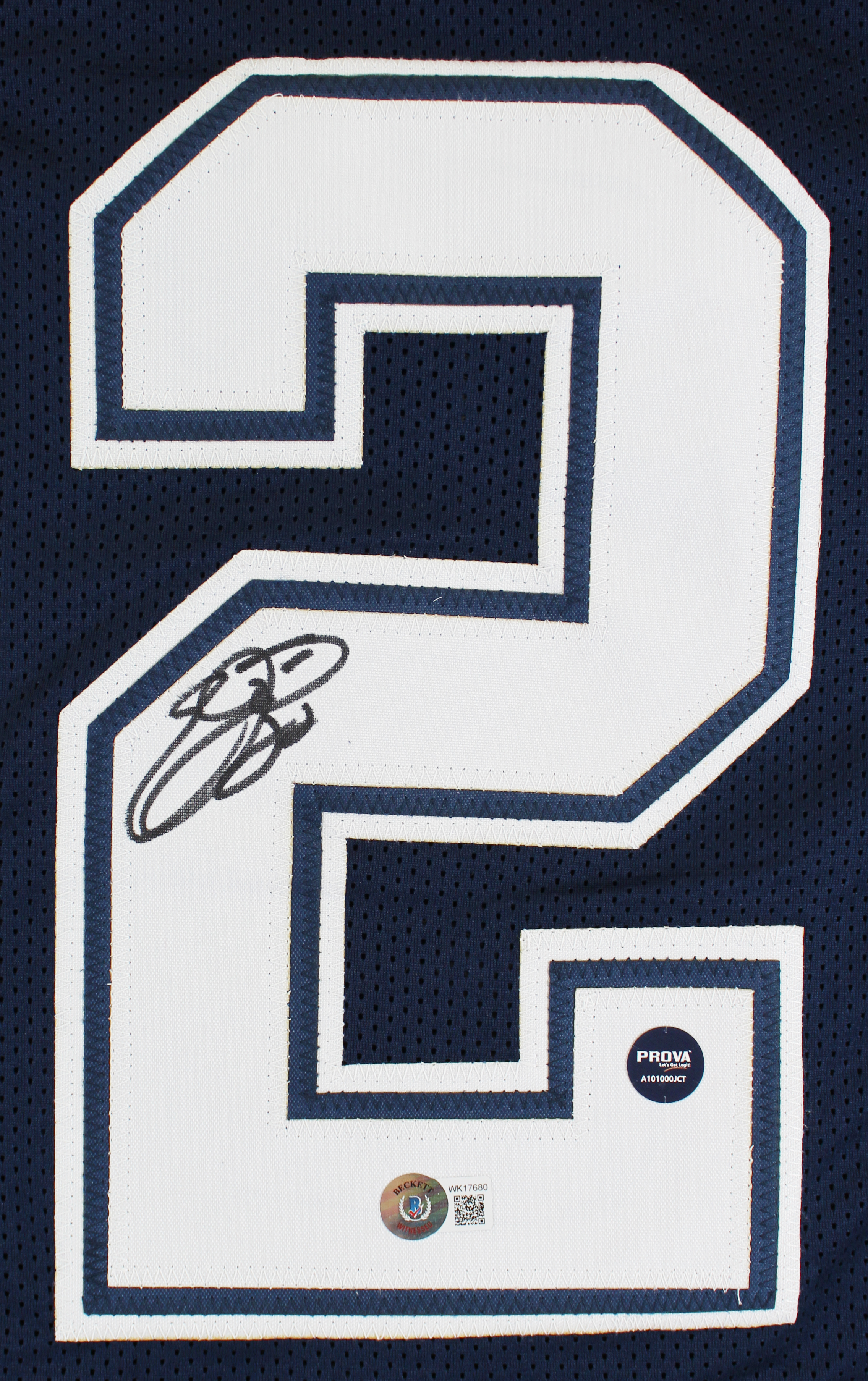 This Autographed Navy Jersey has been Personally Signed by Emmitt Smith of the Dallas Cowboys. This item may come with the new Beckett Authentication hologram that has a scannable QR code rather than the traditional COA. If you would like to have a COA, you are welcome to reach out to Beckett for a printed certification once you receive your item. This is a BAS Witnessed Protection Program item which means a Beckett Authentication Service representative was present when this item was being signed. This is a stock item. We conducted an autograph signing with Emmitt Smith and we have several of these available. The one you will receive will be of equal quality to the one pictured. This item can be verified through BAS Witnessed. This is a X-Large sized, non-branded, custom-stitched Jersey. Press Pass Collectibles only offers Authentic Autographs by Emmitt Smith through Signings, In-Person Signings or Private Collections to include a 100% money back Lifetime Authenticity Guarantee.
