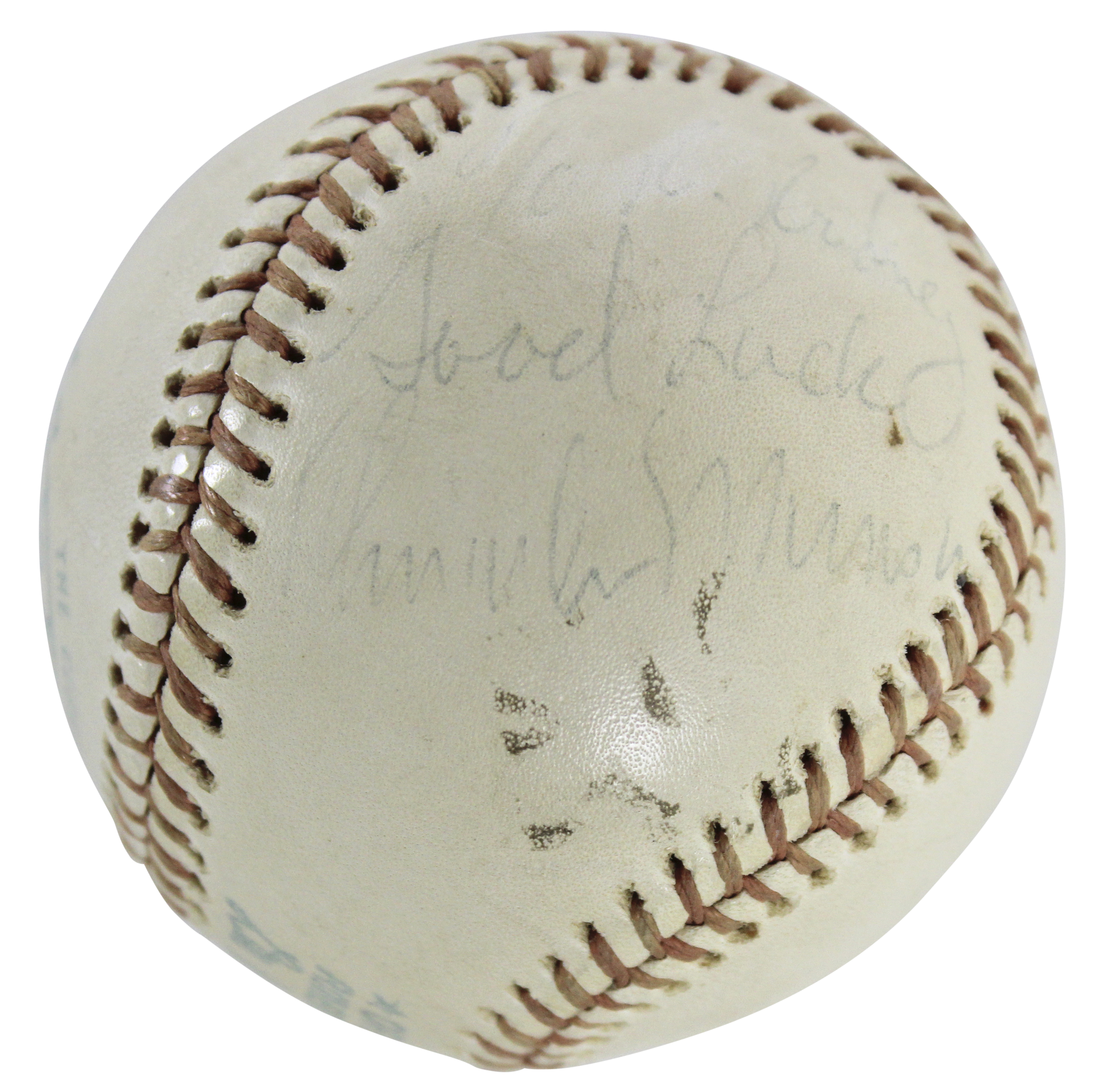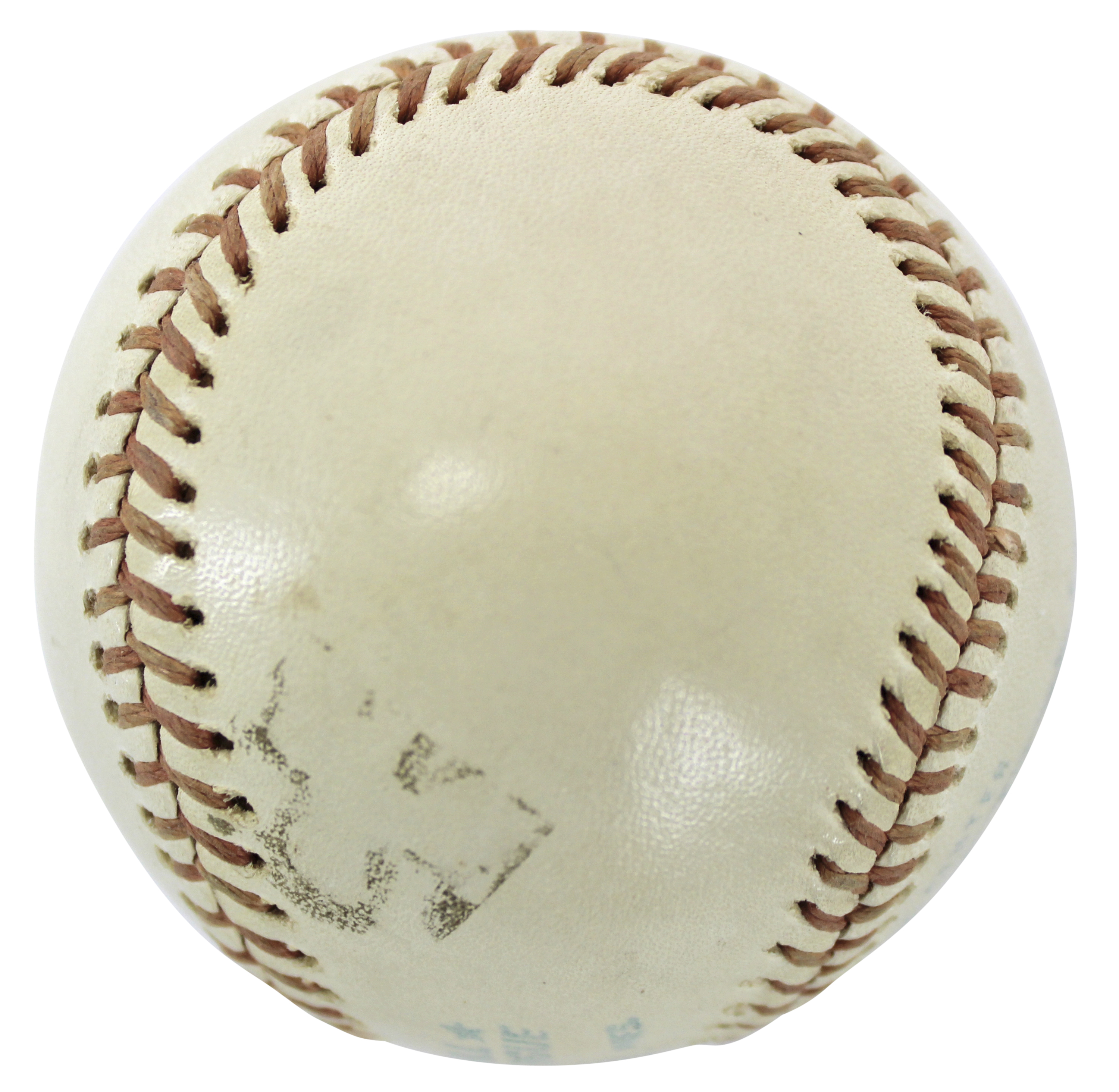 This Autographed Lee MacPhail Oal Baseball with the inscription of "Good Luck" has been Personally Signed by Thurman Munson of the New York Yankees. This item is 100% Authentic to include a Certificate of Authenticity (COA) / hologram by JSA. The authenticity can be verified on JSA website. Press Pass Collectibles only offers Authentic Autographs by Thurman Munson through Signings, In-Person Signings or Private Collections to include a 100% money back Lifetime Authenticity Guarantee.