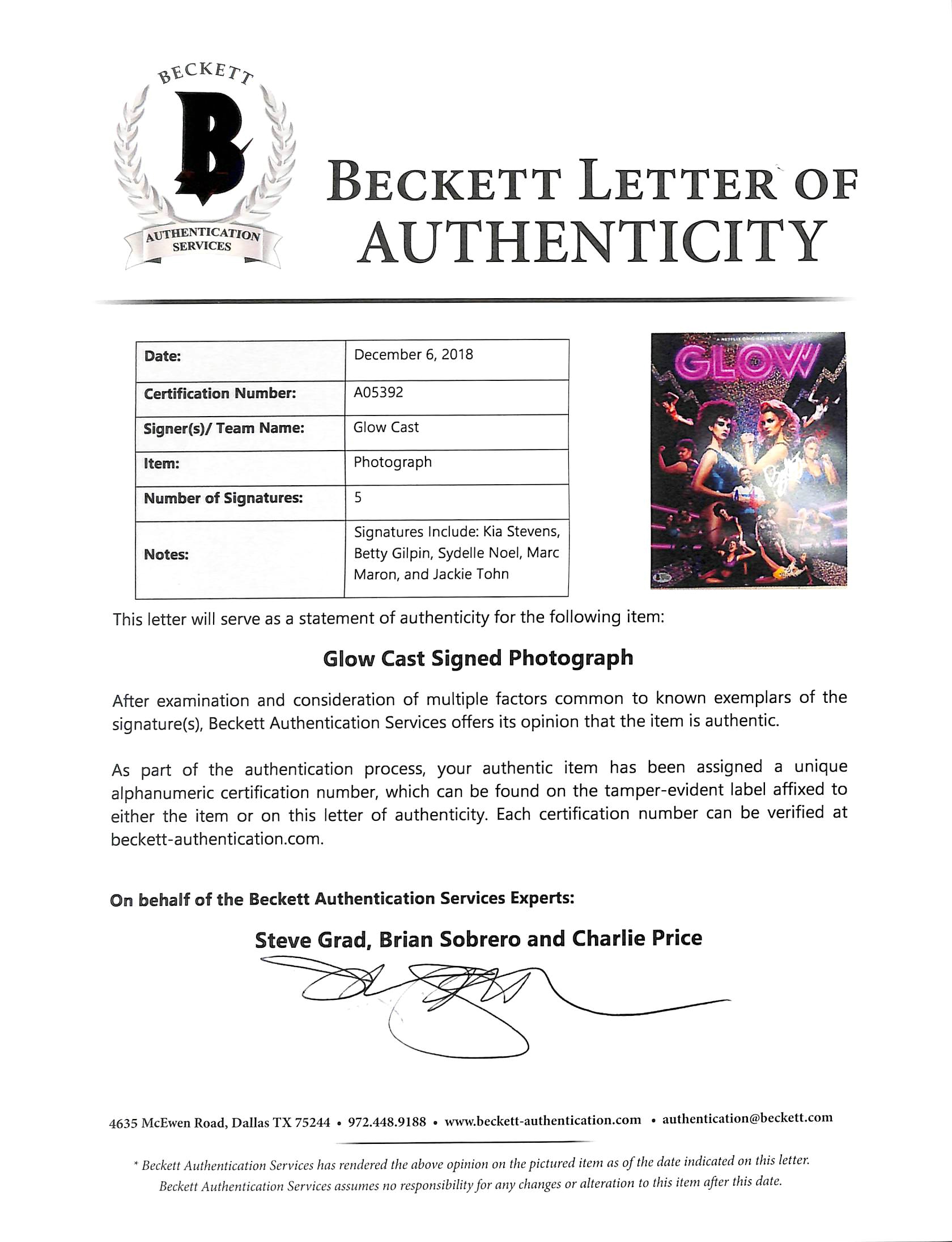 This Autographed 11x14 Photo has been Personally Signed by Marc Maron, Kia Stevens, Betty Gilpin, Sydelle Noel & Jackie Tohn of Glow. This item is 100% Authentic to include a Certificate of Authenticity (COA) / hologram by Beckett Authentication Services.The authenticity can be verified on Beckett Authentication Services website. Press Pass Collectibles only offers Authentic Autographs by Marc Maron, Kia Stevens, Betty Gilpin, Sydelle Noel & Jackie Tohn through Signings, In-Person Signings or Private Collections to include a 100% money back Lifetime Authenticity Guarantee.