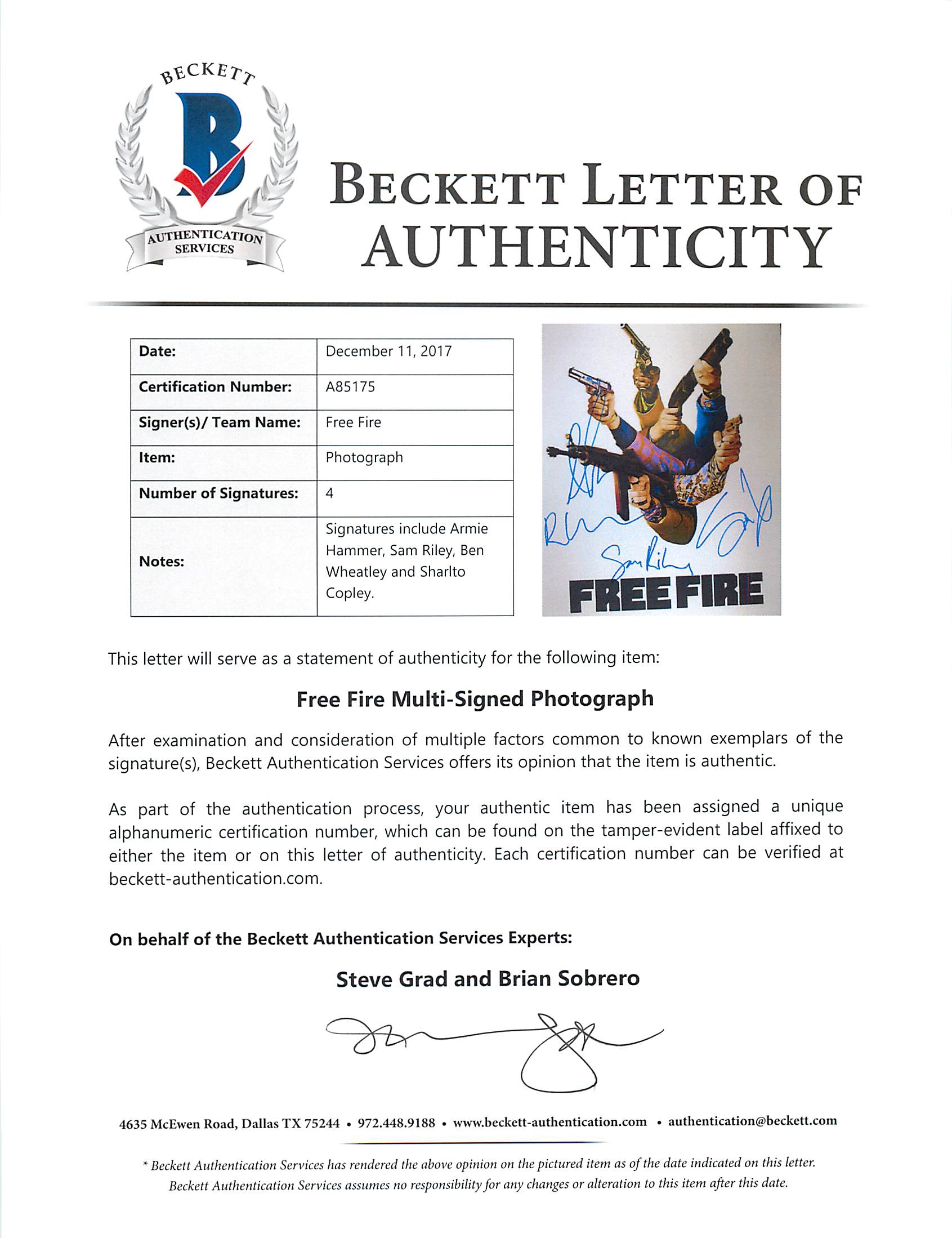This Autographed 11x14 Photo has been Personally Signed by Armie Hammer, Sam Riley, Ben Wheatley & Sharlto Copley of Free Fire. This item is 100% Authentic to include a Certificate of Authenticity (COA) / hologram by Beckett Authentication Services.The authenticity can be verified on Beckett Authentication Services website. Press Pass Collectibles only offers Authentic Autographs by Armie Hammer, Sam Riley, Ben Wheatley & Sharlto Copley through Signings, In-Person Signings or Private Collections to include a 100% money back Lifetime Authenticity Guarantee.