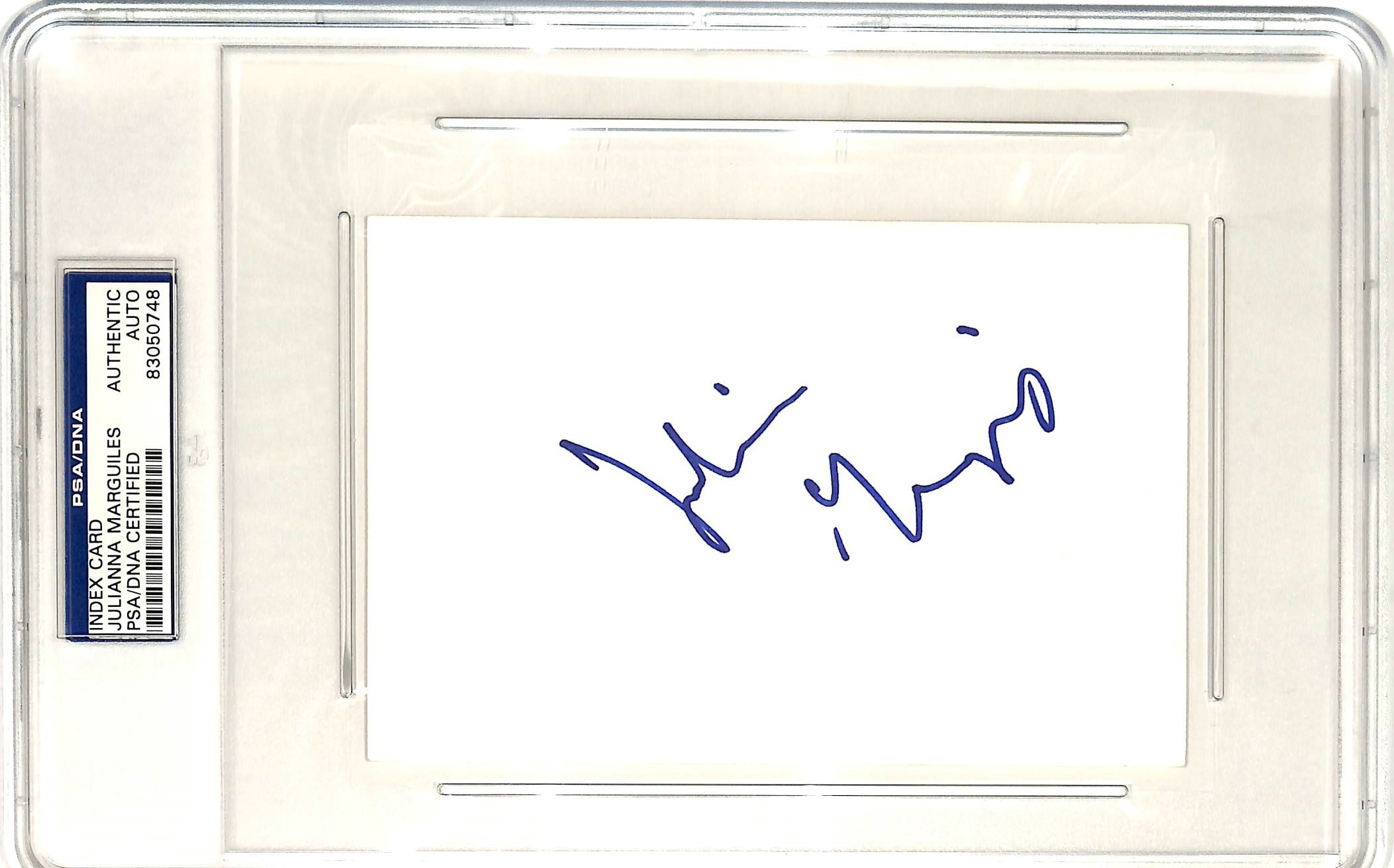 This Autographed 4x6 Index Card has been Personally Signed by Julianna Marguiles of ER. This item is 100% Authentic, it comes slabbed and authenticated by PSA/DNA. The authenticity can be verified on Professional Sports Authenticator website. Press Pass Collectibles only offers Authentic Autographs by Julianna Marguiles through Signings, In-Person Signings or Private Collections to include a 100% money back Lifetime Authenticity Guarantee.