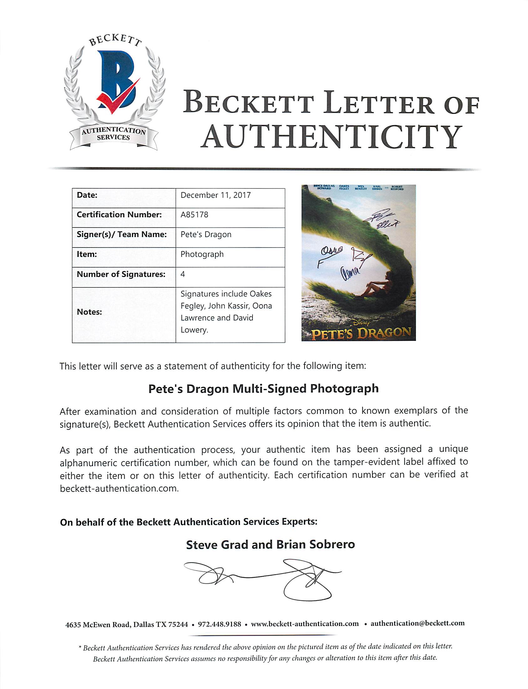 This Autographed 11x14 Photo has been Personally Signed by Oakes Fegley, John Kassir, Oona Lawrence & David Lowery of Pete's Dragon. This item is 100% Authentic to include a Certificate of Authenticity (COA) / hologram by Beckett Authentication Services.The authenticity can be verified on Beckett Authentication Services website. Press Pass Collectibles only offers Authentic Autographs by Oakes Fegley, John Kassir, Oona Lawrence & David Lowery through Signings, In-Person Signings or Private Collections to include a 100% money back Lifetime Authenticity Guarantee.