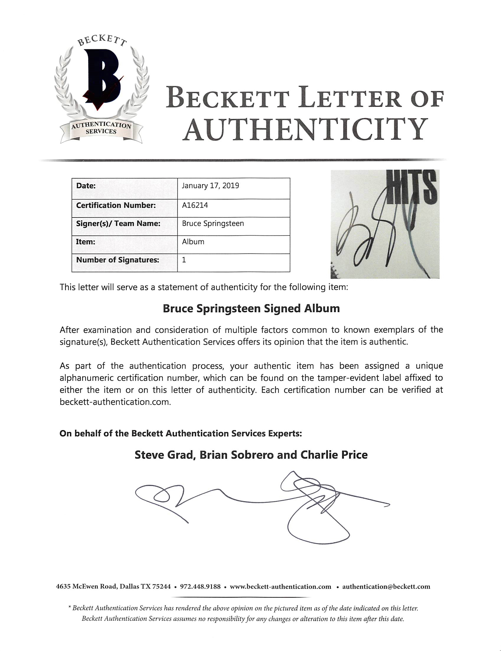 This Autographed Greatest Hits Album Cover (without vinyl) has been Personally Signed by Bruce Springsteen. This item is 100% Authentic to include a Certificate of Authenticity (COA) / hologram by Beckett Authentication Services.The authenticity can be verified on Beckett Authentication Services website. Please refer to photos for condition prior to purchase. Press Pass Collectibles only offers Authentic Autographs by Bruce Springsteen through Signings, In-Person Signings or Private Collections to include a 100% money back Lifetime Authenticity Guarantee.