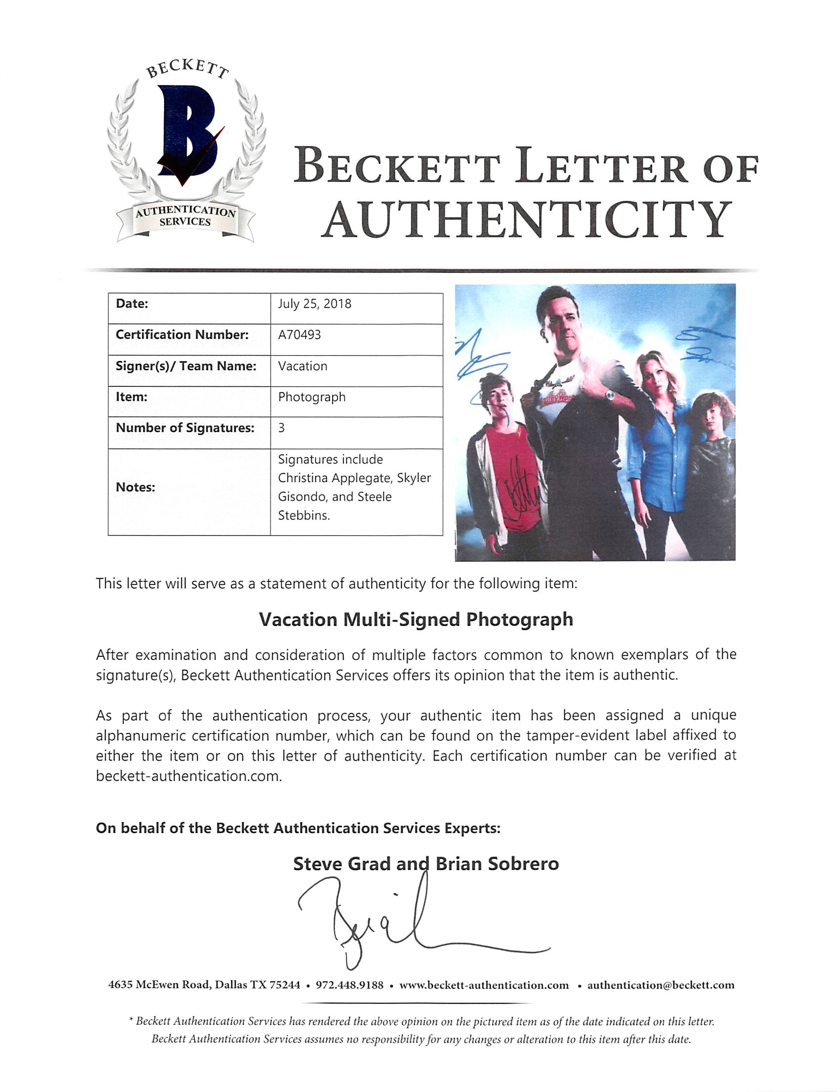 Vacation (3) Applegate, Gisondo & Stebbins Signed 11x14 Photo BAS #A70493