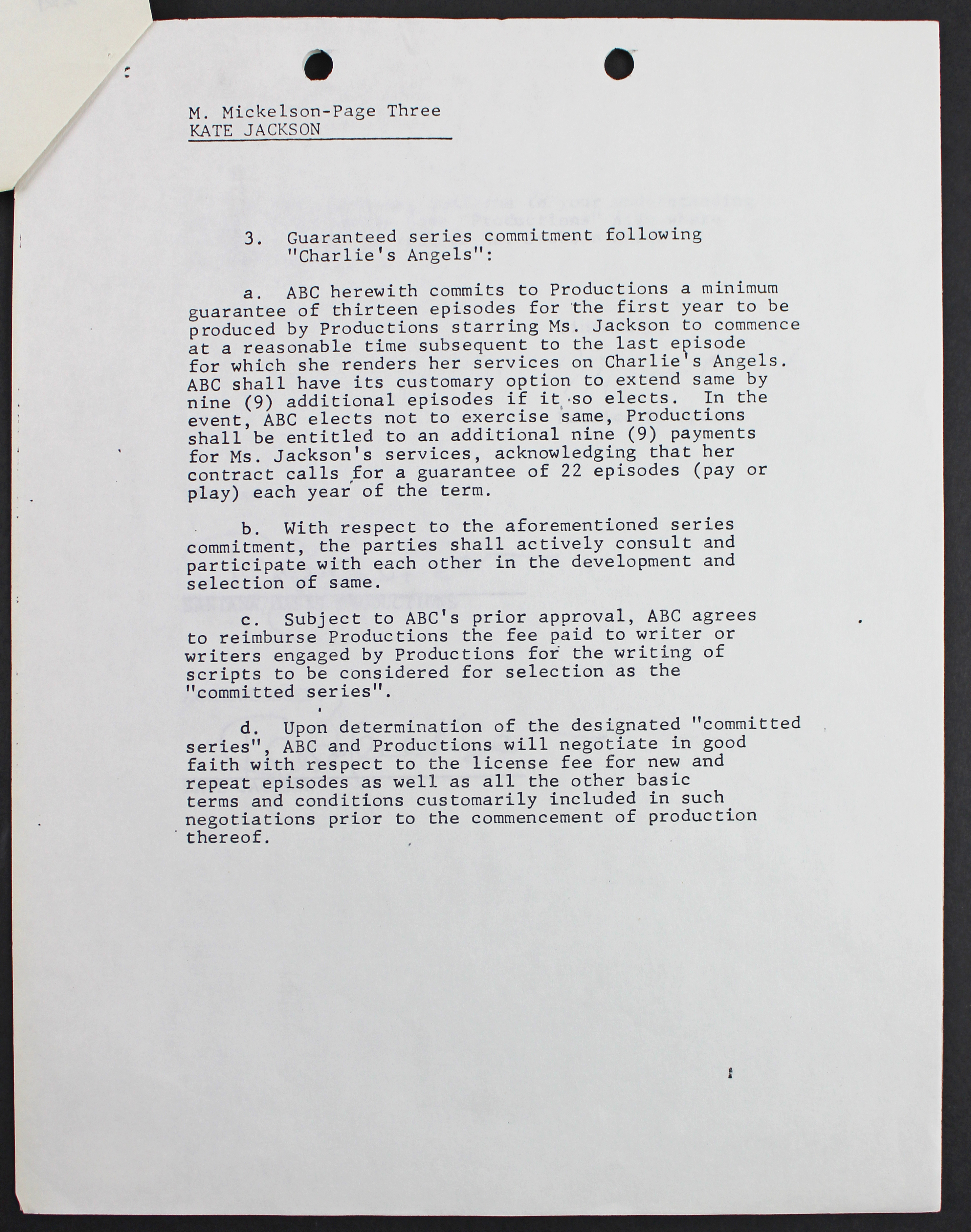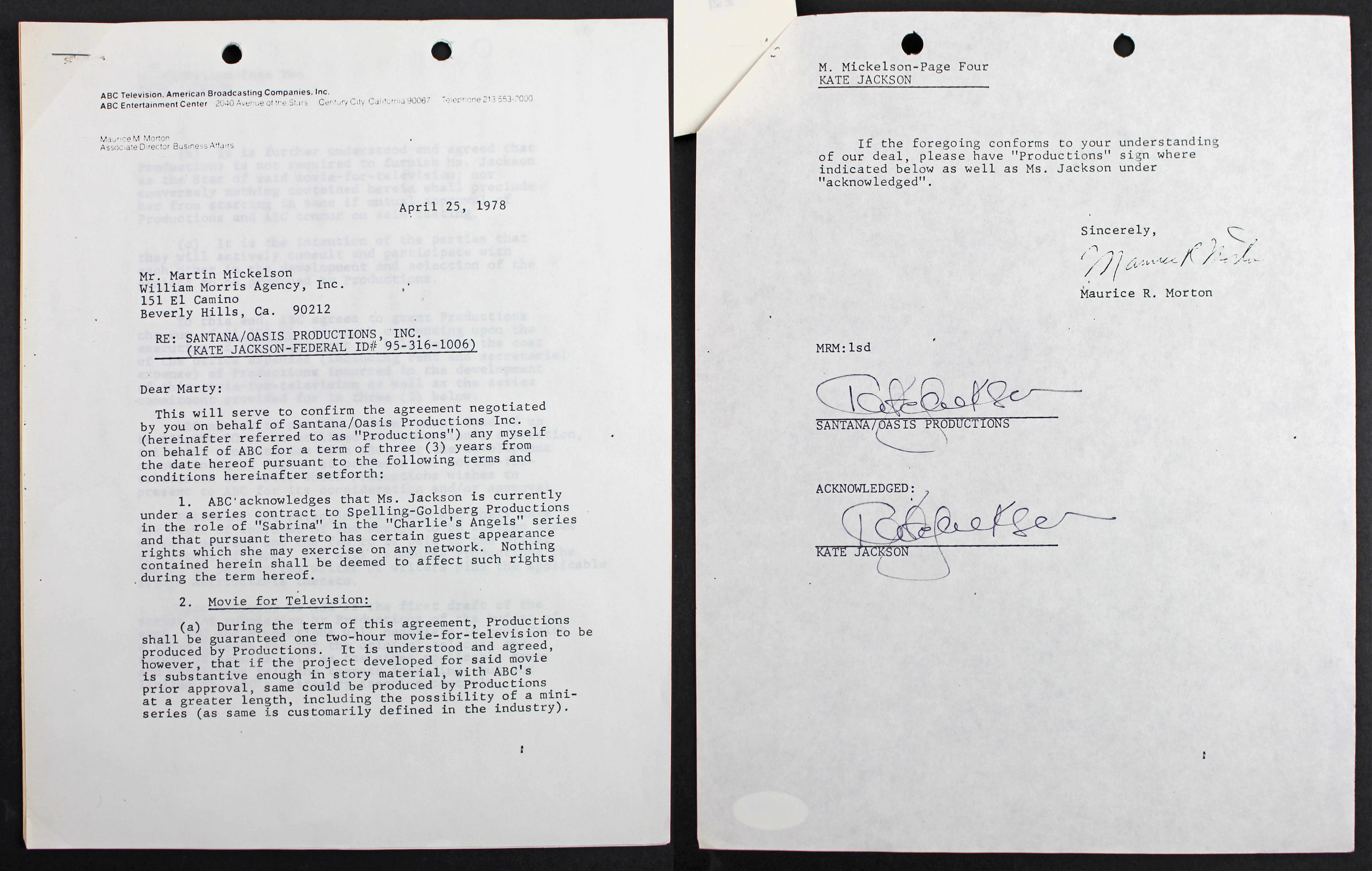 This Double Autographed 4 Page Dated April 28, 1978 Contract has been Personally Signed by Kate Jackson of Charlie's Angels. This item is 100% Authentic and comes with a PSA/DNA Certification Card and a matching numbered Hologram. The authenticity can be verified on Professional Sports Authenticator website. This 4 page contract is for a development deal between ABC and Kate Jackson to develop a new 2 hour made for tv movie, miniseries or show. The development of the show was to be created after the conclusion of Mrs. Jackson's commitments to Charlie's Angels. This contract was signed while Charlie's Angels was still running, but this is not a Charlie's Angels contract.