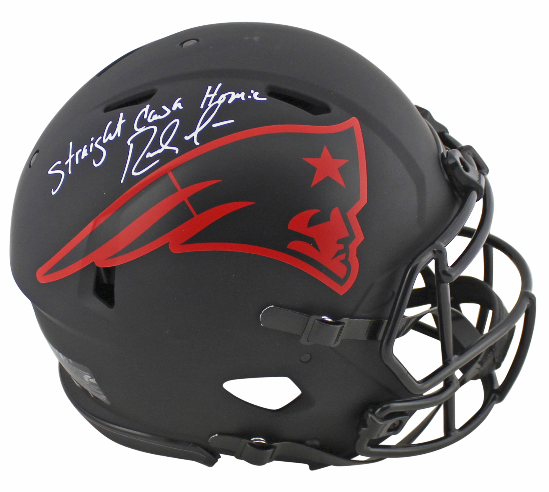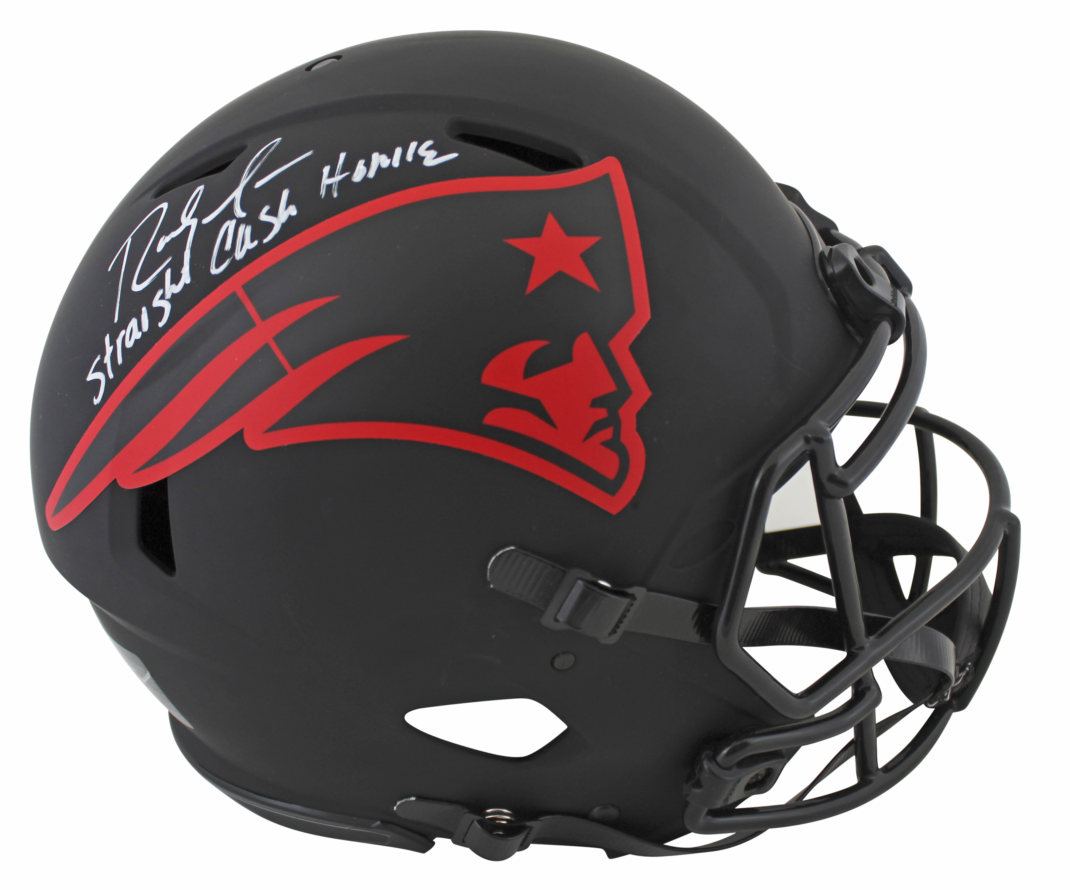 This Autographed Alternate Eclipse Riddell Authentic Proline F/S Speed Helmet with the inscription of "Straight Cash Homie" has been Personally Signed by Randy Moss of the New England Patriots. This item is 100% Authentic to include a Certificate of Authenticity (COA) / hologram by Beckett Authentication Services. This is a BAS Witnessed Protection Program item which means a Beckett Authentication Service representative was present when this item was being signed. This is a stock item. We conducted an autograph signing with Randy Moss and we have several of these available. The one you will receive will be of equal quality to the one pictured. This item can be verified through BAS Witnessed.