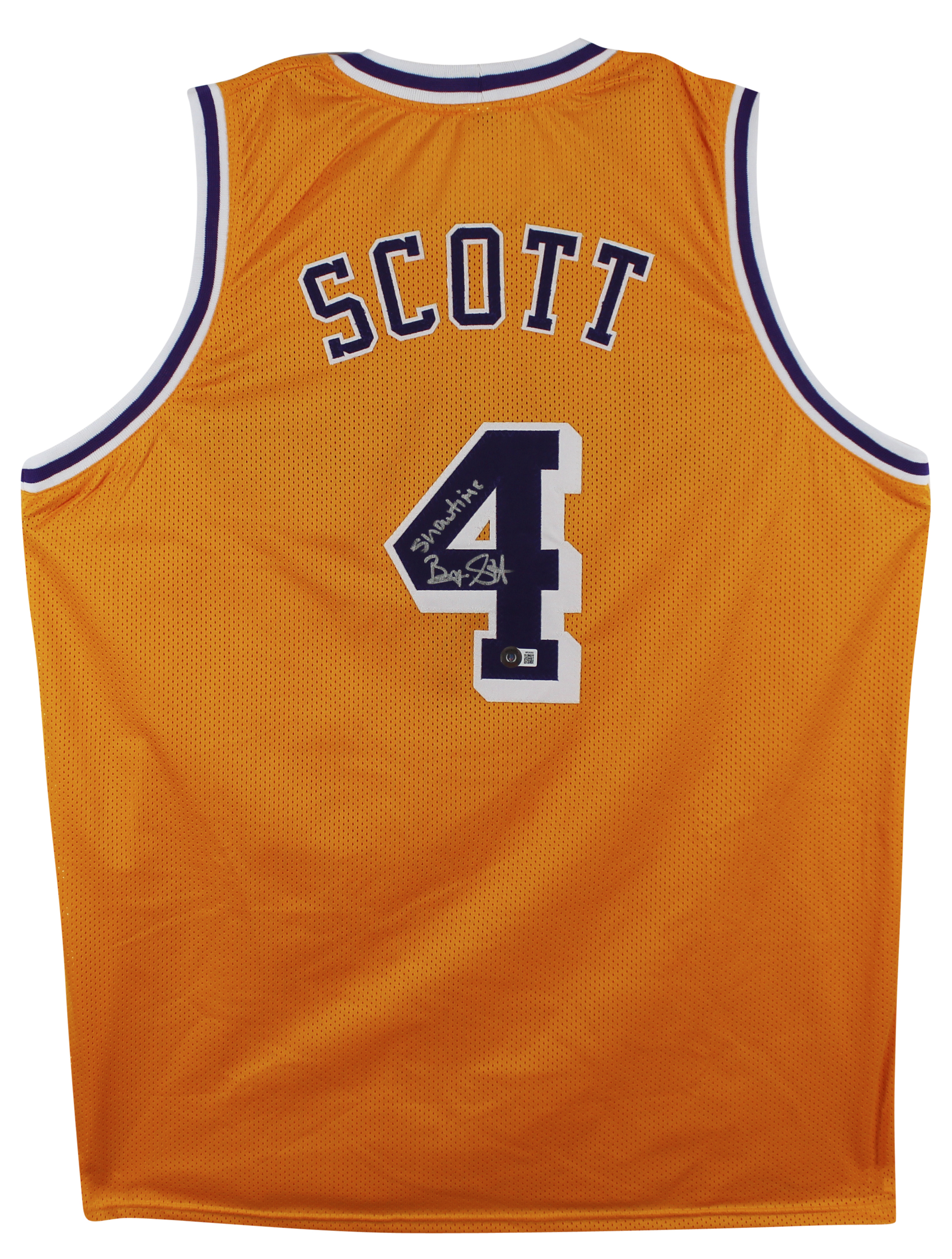 This Autographed Yellow Jersey with the inscription of "Showtime" has been Personally Signed by Byron Scott of the Los Angeles Lakers. This item is 100% Authentic to include a hologram by Beckett Authentication Services. This item will come with an affixed Beckett Authentication Services (BAS) authentication sticker, which includes a scannable QR code to verify authenticity. Please note that Beckett no longer provides serial-numbered COA cards, and the attached BAS sticker will serve as the complete authentication for this item. This is a BAS Witnessed Protection Program item which means a Beckett Authentication Service representative was present when this item was being signed. We conducted an autograph signing with Byron Scott where multiples of the same item were signed. While the photographs are representative of this item, the size, placement and strength of the signature may vary. Each item is hand signed, therefore, each autograph is unique. This item can be verified through BAS Witnessed. This is a X-Large sized, non-branded, custom-stitched Jersey.