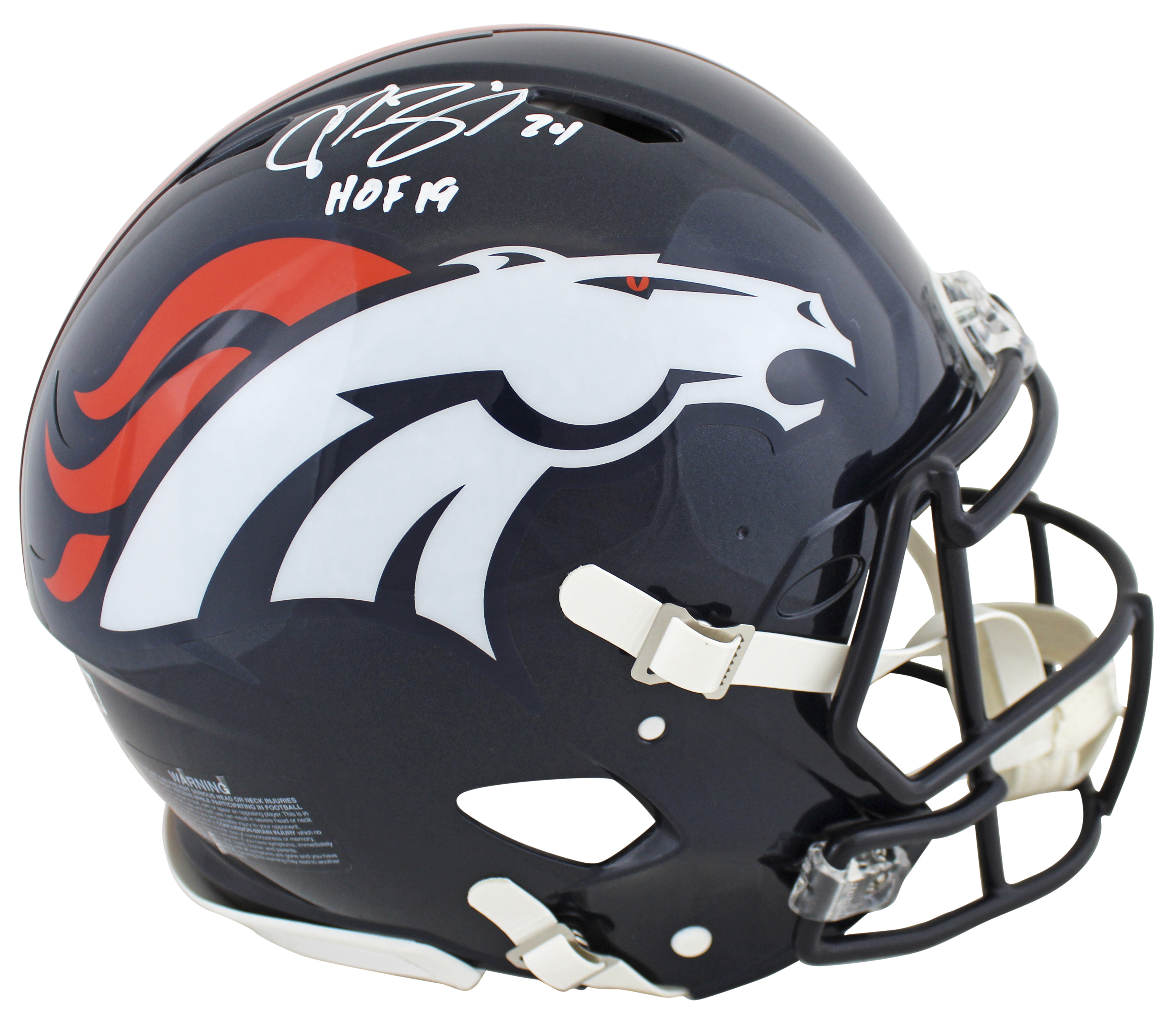 This Autographed Authentic Full Size Speed Proline Helmet with the inscription of "HOF 19" has been Personally Signed by Champ Bailey of the Denver Broncos. This item is 100% Authentic to include a hologram by Beckett Authentication Services. This item will come with the new Beckett Authentication hologram that has a scannable QR code rather than the traditional COA. If you would like to have a COA, you are welcome to reach out to Beckett for a printed certification once you receive your item. This is a BAS Witnessed Protection Program item which means a Beckett Authentication Service representative was present when this item was being signed. We conducted an autograph signing with Champ Bailey where multiples of the same item were signed. While the photographs are representative of this item, the size, placement and strength of the signature may vary. Each item is hand signed, therefore, each autograph is unique. This item can be verified through BAS Witnessed.