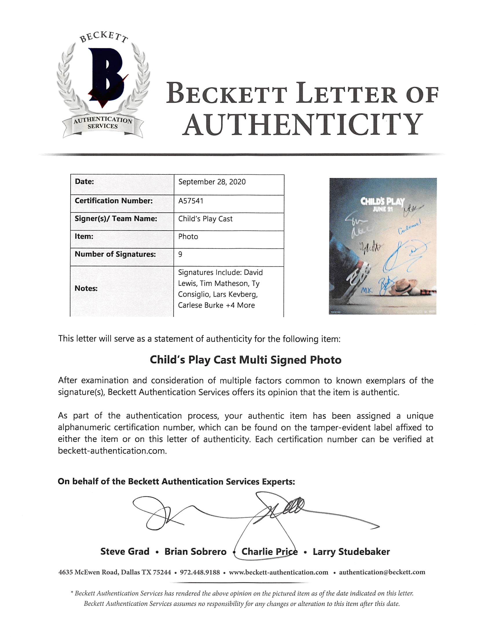 This Autographed 11x14 Photo has been Personally Signed by David Lewis, Tim Matheson, Ty Consiglio, Lars Kevberg, Carlese Burke, Bear McCreary, Marlon Kazadi, Tyler Burton Smith +1 More of Child's Play. This item is 100% Authentic to include a Certificate of Authenticity (COA) / hologram by Beckett Authentication Services. The authenticity can be verified on Beckett Authentication Services website.