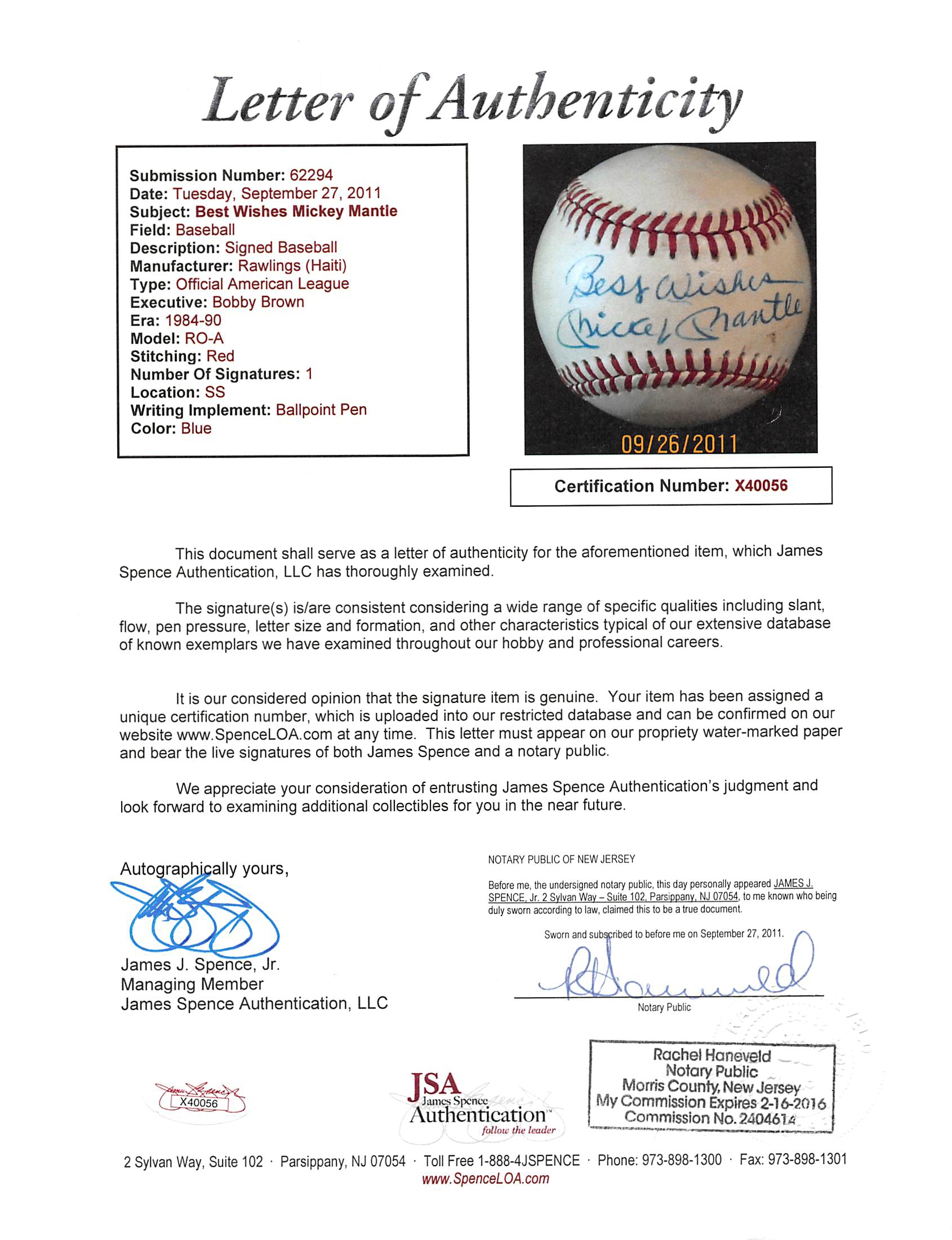 This Autographed Bobby Brown Oal Baseball with the inscription of "Best Wishes" has been Personally Signed by Mickey Mantle of the New York Yankees. This item is 100% Authentic to include a Certificate of Authenticity (COA) / hologram by JSA. The authenticity can be verified on JSA website.