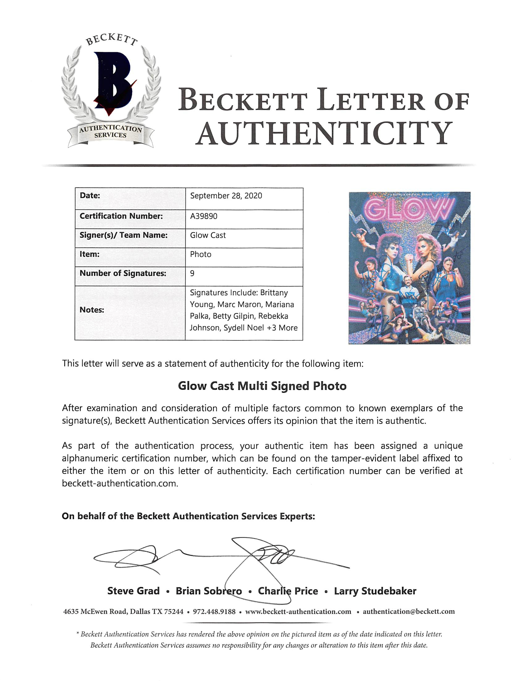 This Autographed 8x10 Photo has been Personally Signed by Brittany Young, Marc Maron, Mariana Palka, Betty Gilpin, Rebekka Johnson, Sydell Noel, Kia Stevens, Britt Baron & Kevin Kiley of Glow. This item is 100% Authentic to include a Certificate of Authenticity (COA) / hologram by Beckett Authentication Services. The authenticity can be verified on Beckett Authentication Services website.
