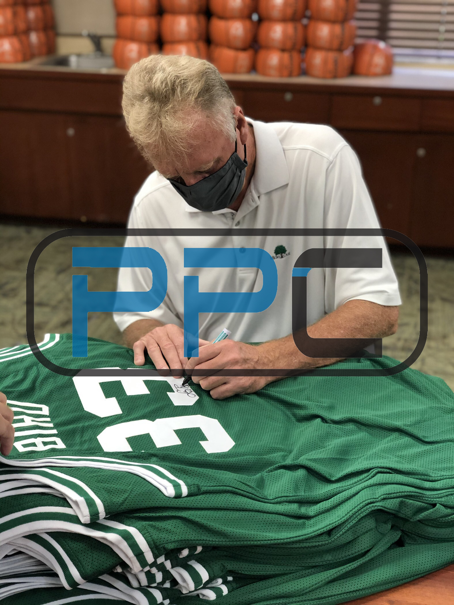 This Autographed Green Pro Style Jersey has been Personally Signed by Larry Bird of the Boston Celtics. This item is 100% Authentic to include a Certificate of Authenticity (COA) / hologram by Beckett Authentication Services. This is a stock item. We conducted an autograph signing with Larry Bird and we have several of these available. The one you will receive will be of equal quality to the one pictured. This item can be verified through BAS. This is a X-Large sized, non-branded, custom-stitched Jersey. The proof signing photo will not come with the item.