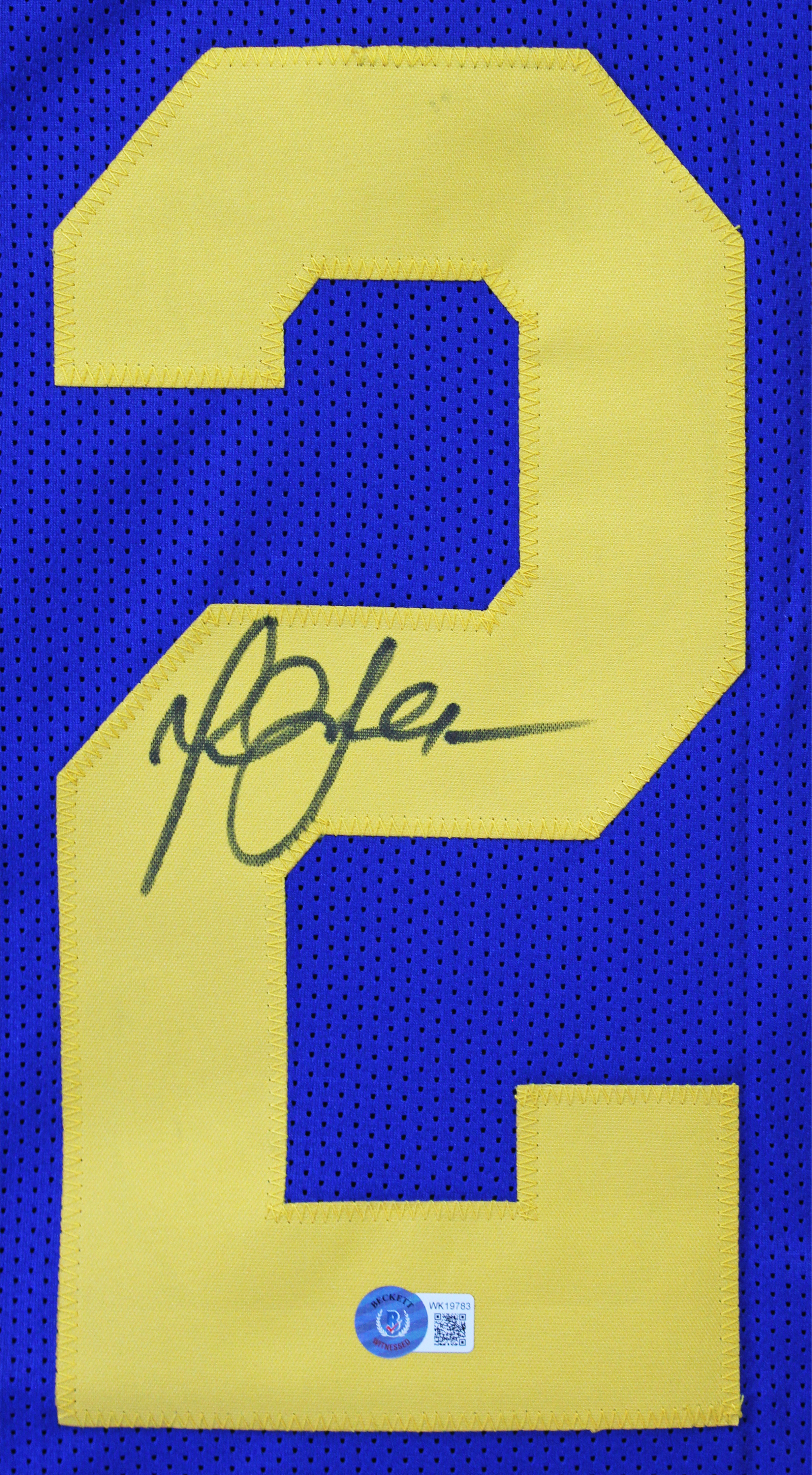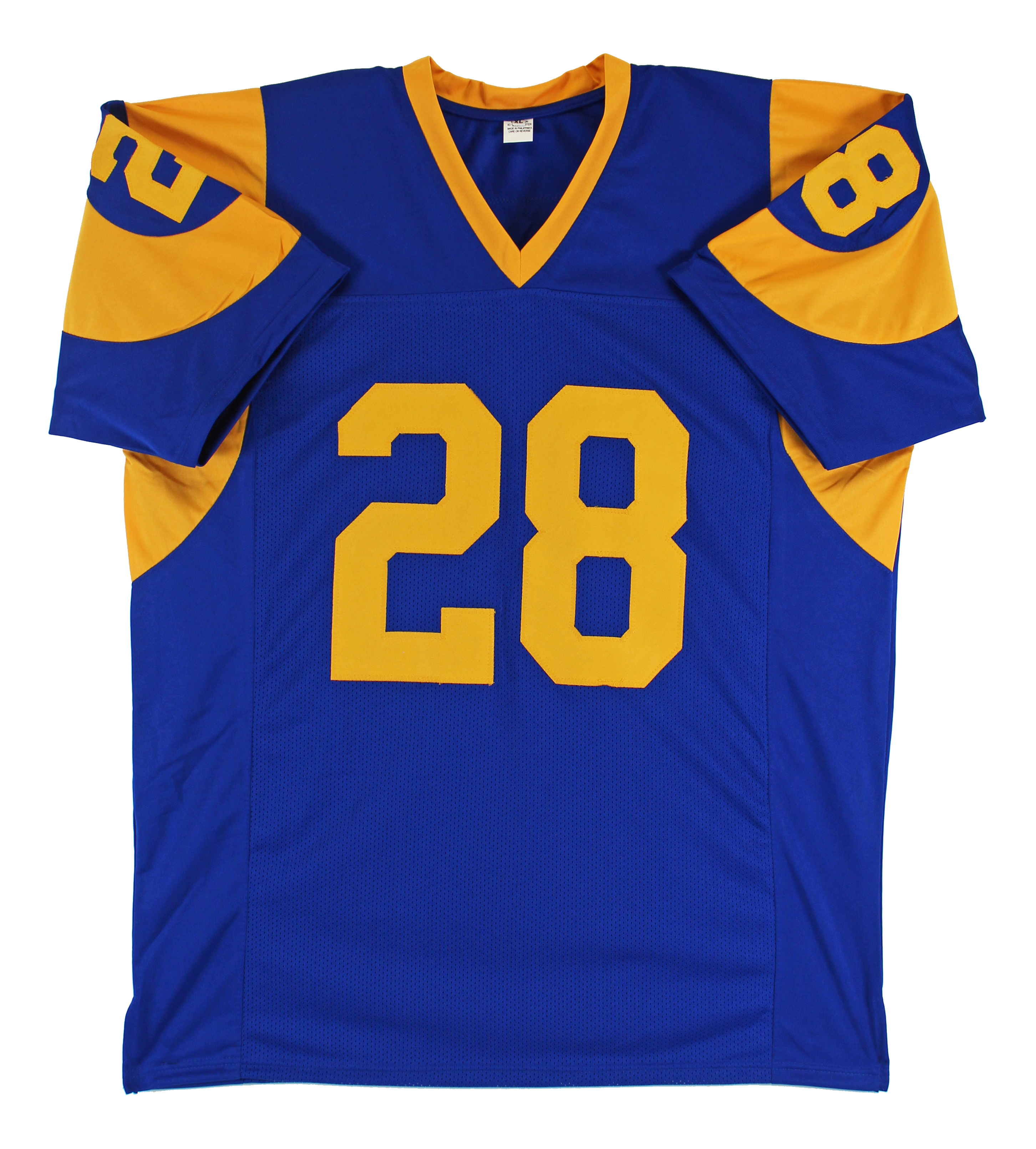 This Autographed Blue Jersey has been Personally Signed by Marshall Faulk of the St. Louis Rams. This item is 100% Authentic to include a hologram by Beckett Authentication Services. This item will come with the new Beckett Authentication hologram that has a scannable QR code rather than the traditional COA. If you would like to have a COA, you are welcome to reach out to Beckett for a printed certification once you receive your item. This is a BAS Witnessed Protection Program item which means a Beckett Authentication Service representative was present when this item was being signed. This is a stock item. We conducted an autograph signing with Marshall Faulk and we have several of these available. The one you will receive will be of equal quality to the one pictured. This item can be verified through BAS. This is a X-Large sized, non-branded, custom-stitched Jersey.