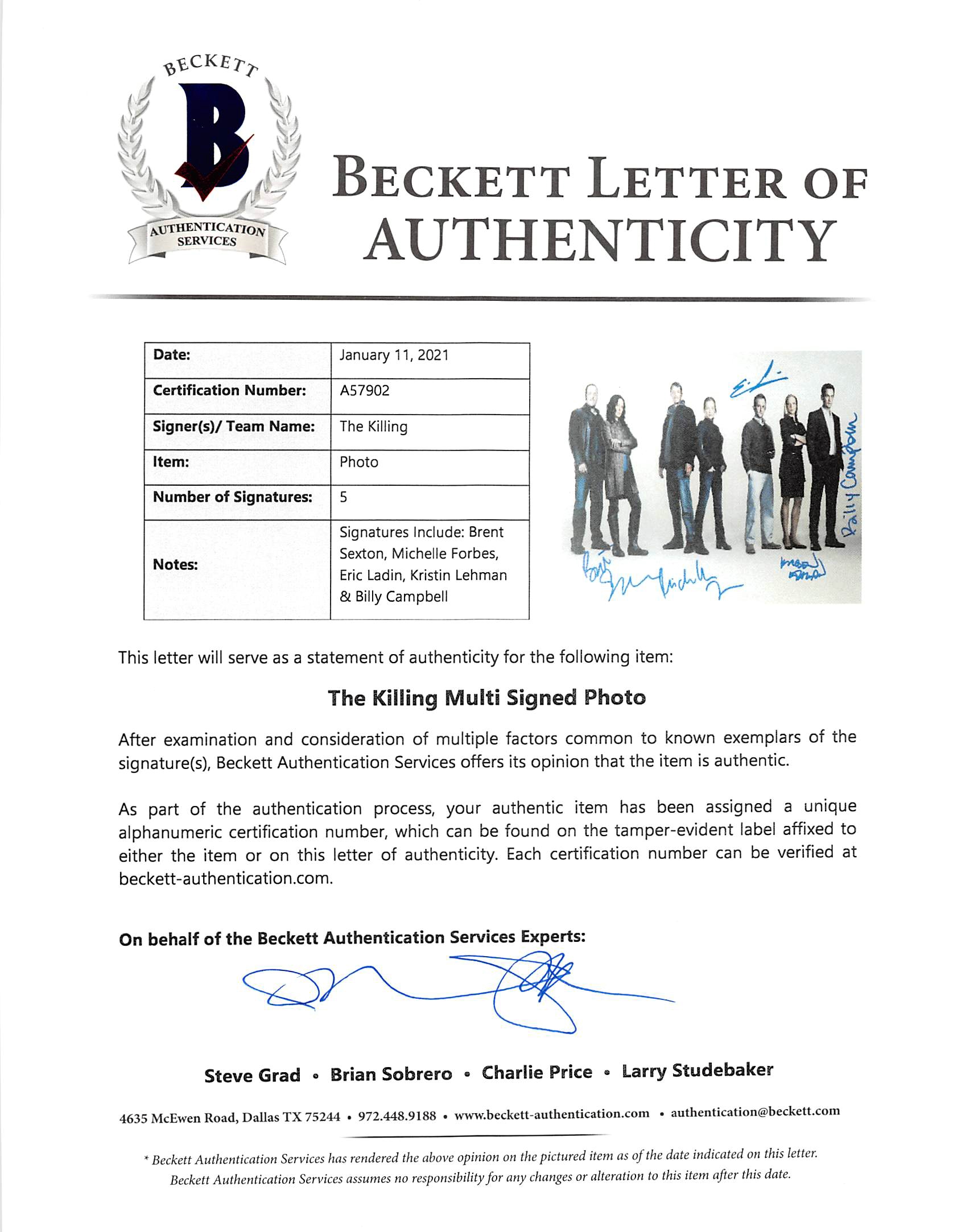 This Autographed 12x18 Photo has been Personally Signed by Brent Sexton, Michelle Forbes, Eric Ladin, Kristin Lehman & Billy Campbell of The Killing. This item is 100% Authentic to include a Certificate of Authenticity (COA) / hologram by Beckett Authentication Services. The authenticity can be verified on Beckett Authentication Services website.