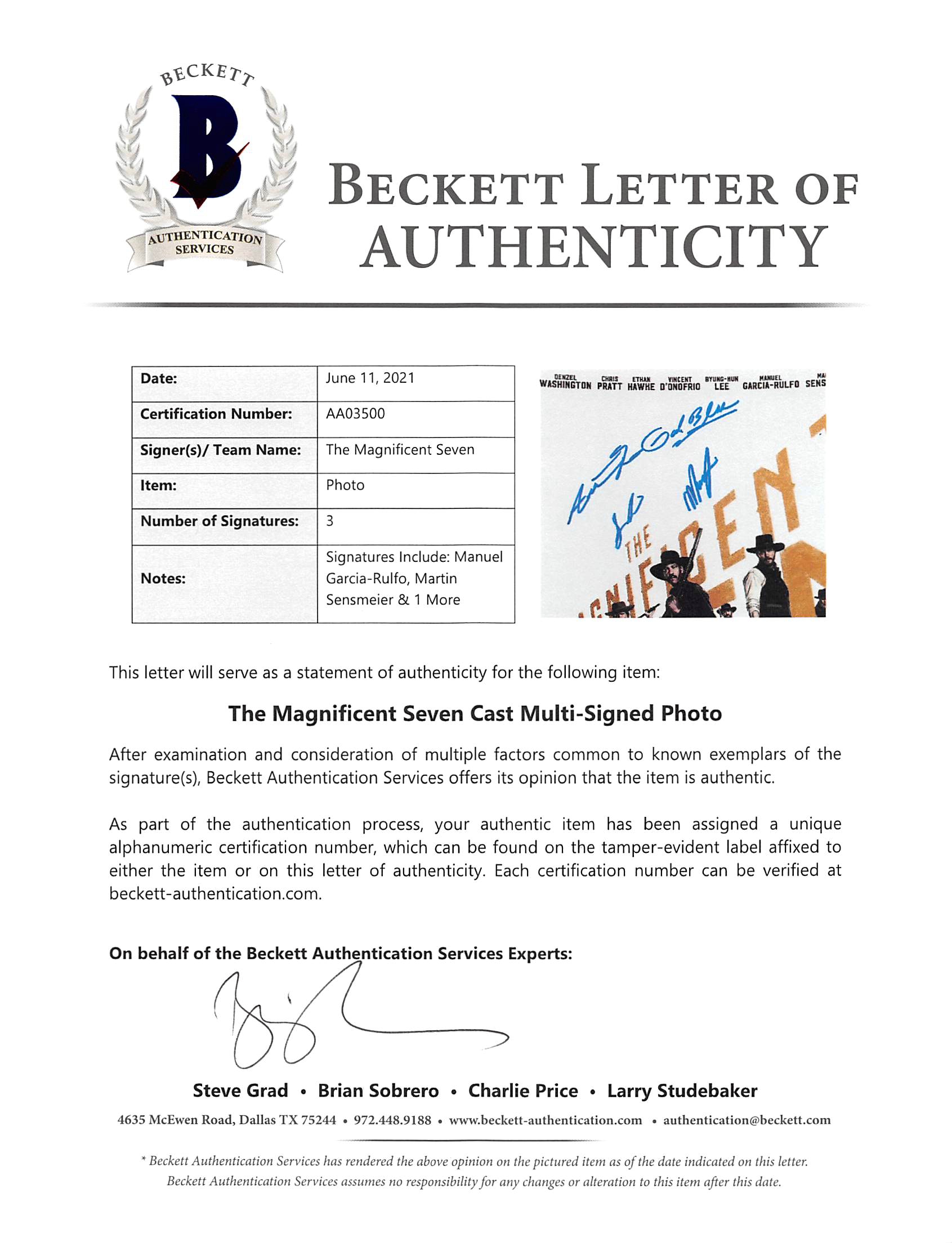 This Autographed 12x18 Photo has been Personally Signed by Manuel Garcia-Rulfo, Martin Sensmeier & 1 More of The Magnificent Seven. This item is 100% Authentic to include a Certificate of Authenticity (COA) / hologram by Beckett Authentication Services. The authenticity can be verified on Beckett Authentication Services website.