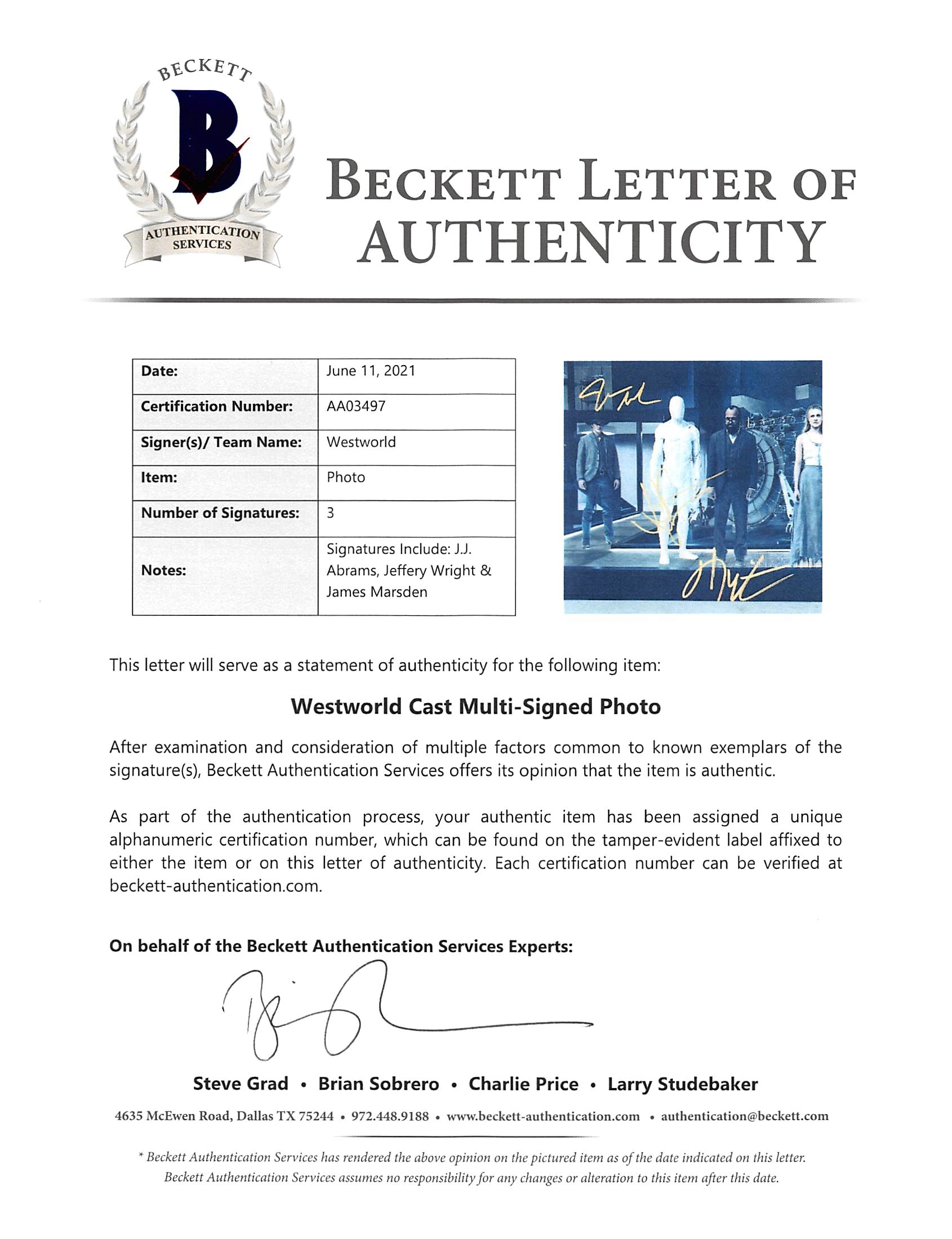This Autographed 12x18 Photo has been Personally Signed by J.J. Abrams, Jeffery Wright & James Marsden of Westworld. This item is 100% Authentic to include a Certificate of Authenticity (COA) / hologram by Beckett Authentication Services. The authenticity can be verified on Beckett Authentication Services website.