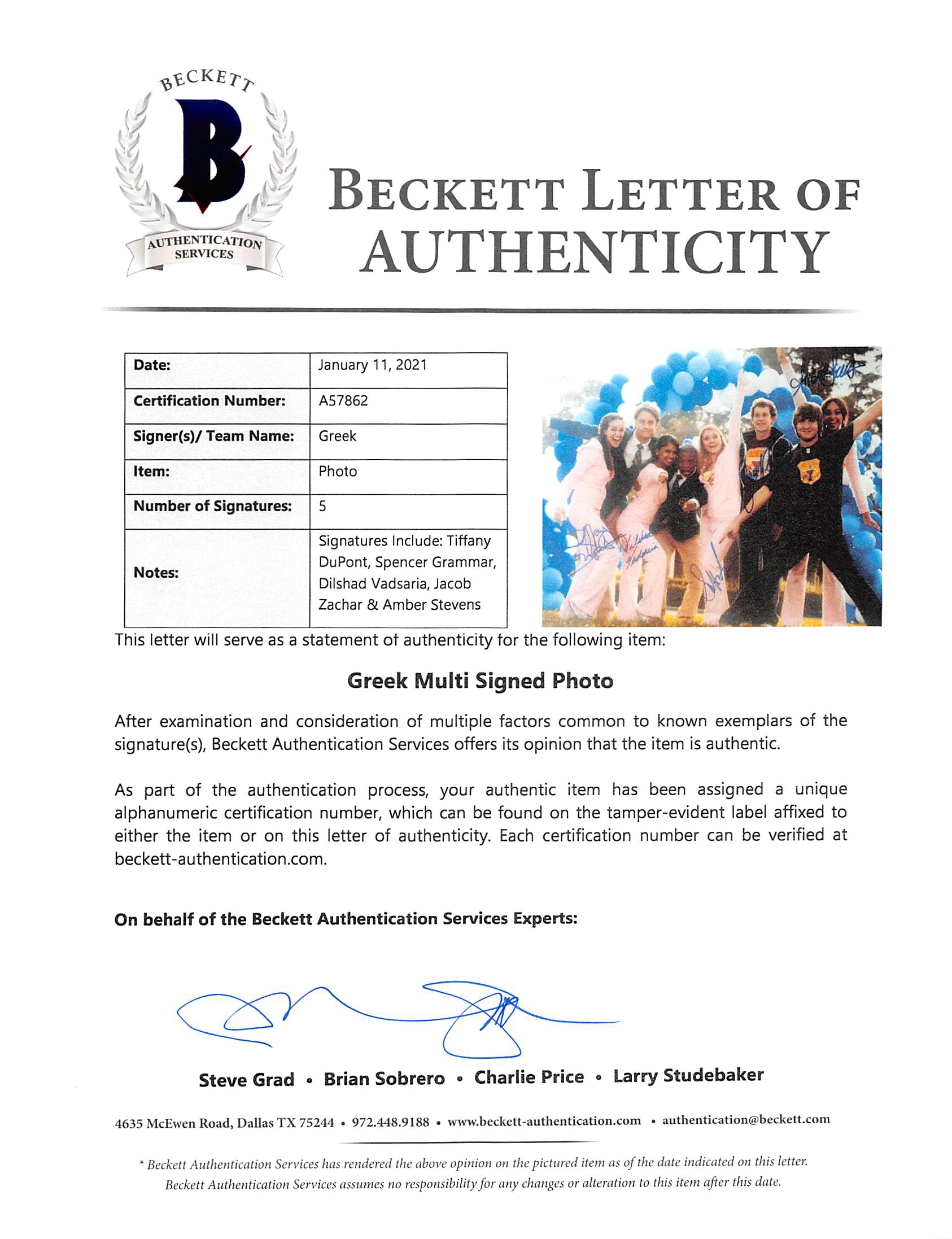This Autographed 11x14 Photo has been Personally Signed by Tiffany DuPont, Spencer Grammar, Dilshad Vadsaria, Jacob Zachar & Amber Stevens of Greek. This item is 100% Authentic to include a Certificate of Authenticity (COA) / hologram by Beckett Authentication Services. The authenticity can be verified on Beckett Authentication Services website. The corners on this photo are a little dinged up from handling, they are not crisp.