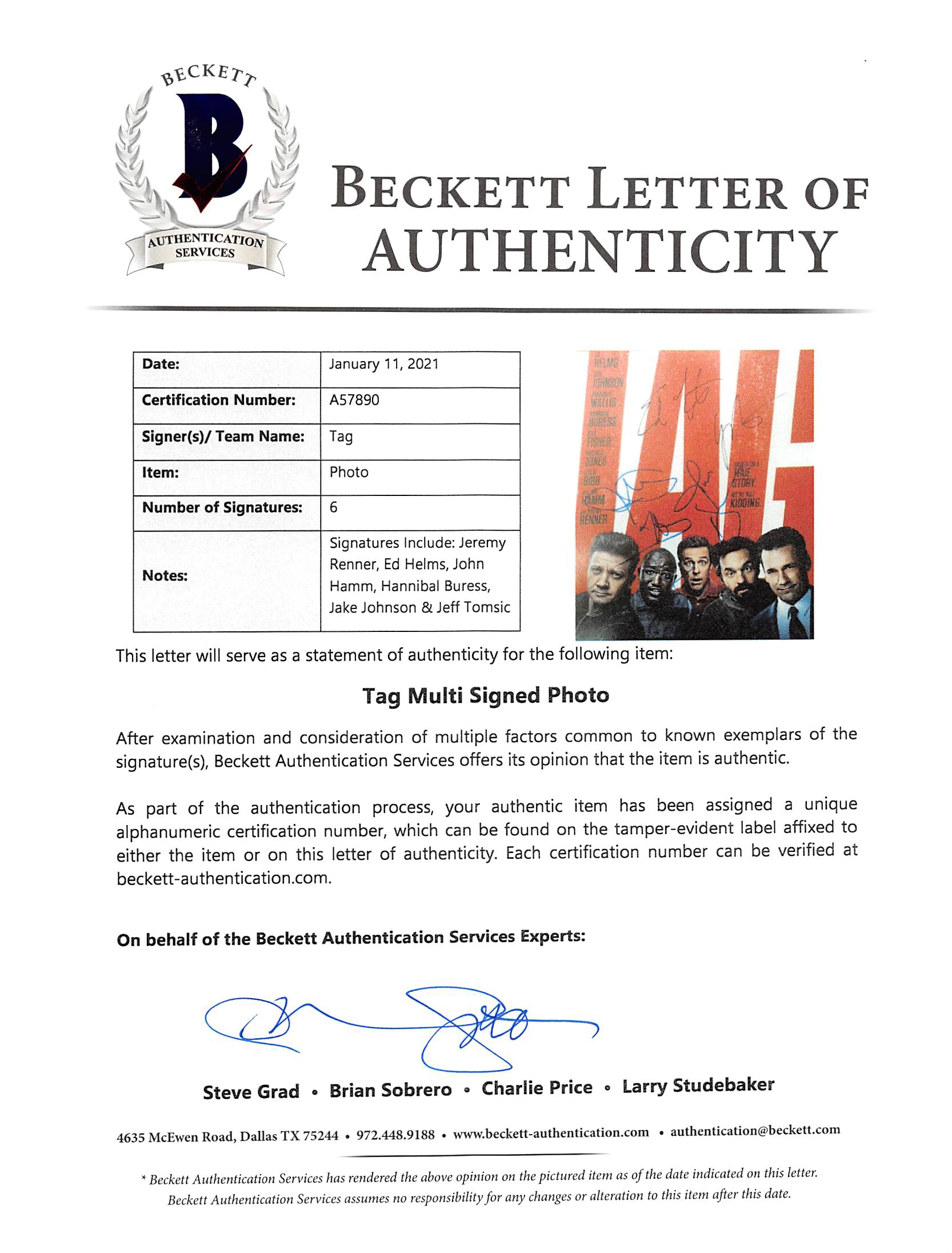 This Autographed 12x18 Photo has been Personally Signed by Jeremy Renner, Ed Helms, John Hamm, Hannibal Buress, Jake Johnson & Jeff Tomsic of TAG. This item is 100% Authentic to include a Certificate of Authenticity (COA) / hologram by Beckett Authentication Services. The authenticity can be verified on Beckett Authentication Services website.