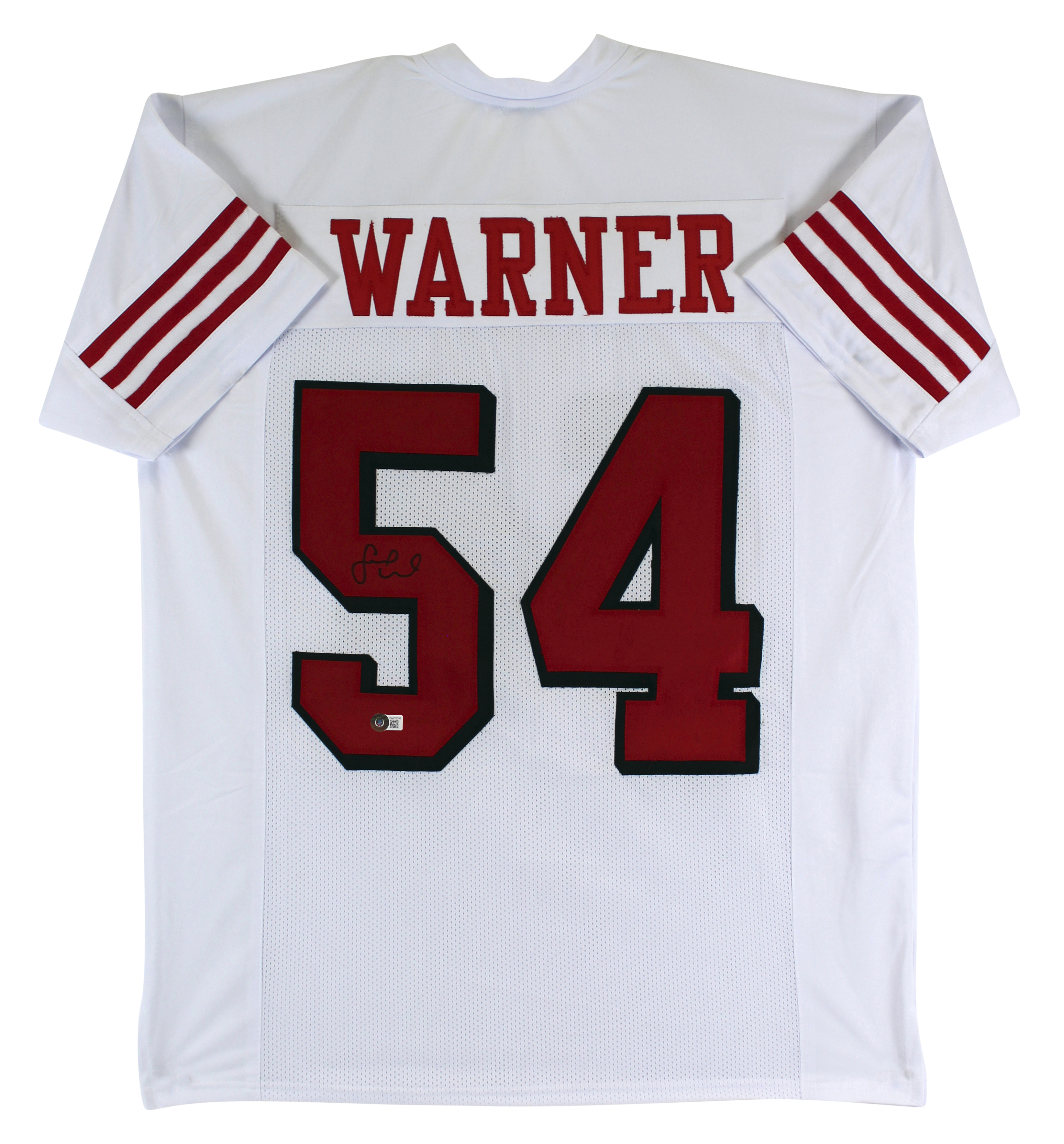 This Autographed w/ Dropshadow White Pro Style Jersey has been Personally Signed by Fred Warner of the San Francisco 49ers. This item may come with an affixed Beckett Authentication Services (BAS) authentication sticker, which includes a scannable QR code to verify authenticity. Please note that Beckett no longer provides serial-numbered COA cards, and the attached BAS sticker will serve as the complete authentication for this item. We conducted an autograph signing with Fred Warner where multiples of the same item were signed. While the photographs are representative of this item, the size, placement and strength of the signature may vary. Each item is hand signed, therefore, each autograph is unique. This item can be verified through BAS. This is a X-Large sized, non-branded, custom-stitched Jersey.