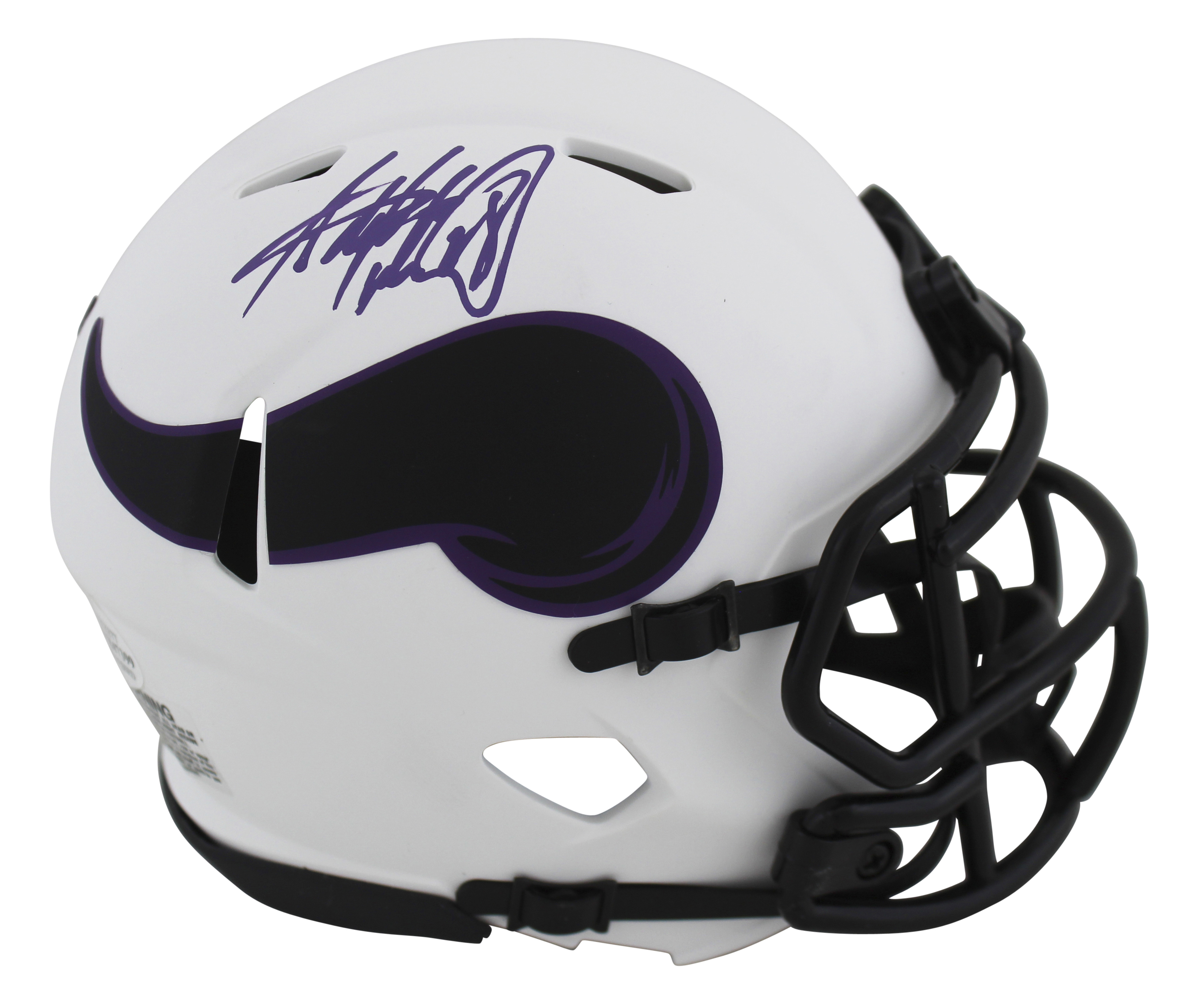 This Autographed Alternate Lunar Mini Helmet has been Personally Signed by Adrian Peterson of the Minnesota Vikings. This item is 100% Authentic to include a hologram by Beckett Authentication Services. This item will come with the new Beckett Authentication hologram that has a scannable QR code rather than the traditional COA. If you would like to have a COA, you are welcome to reach out to Beckett for a printed certification once you receive your item.This is a BAS Witnessed Protection Program item which means a Beckett Authentication Service representative was present when this item was being signed. This is a stock item. We conducted an autograph signing with Adrian Peterson and we have several of these available. The one you will receive will be of equal quality to the one pictured. This item can be verified through BAS Witnessed.