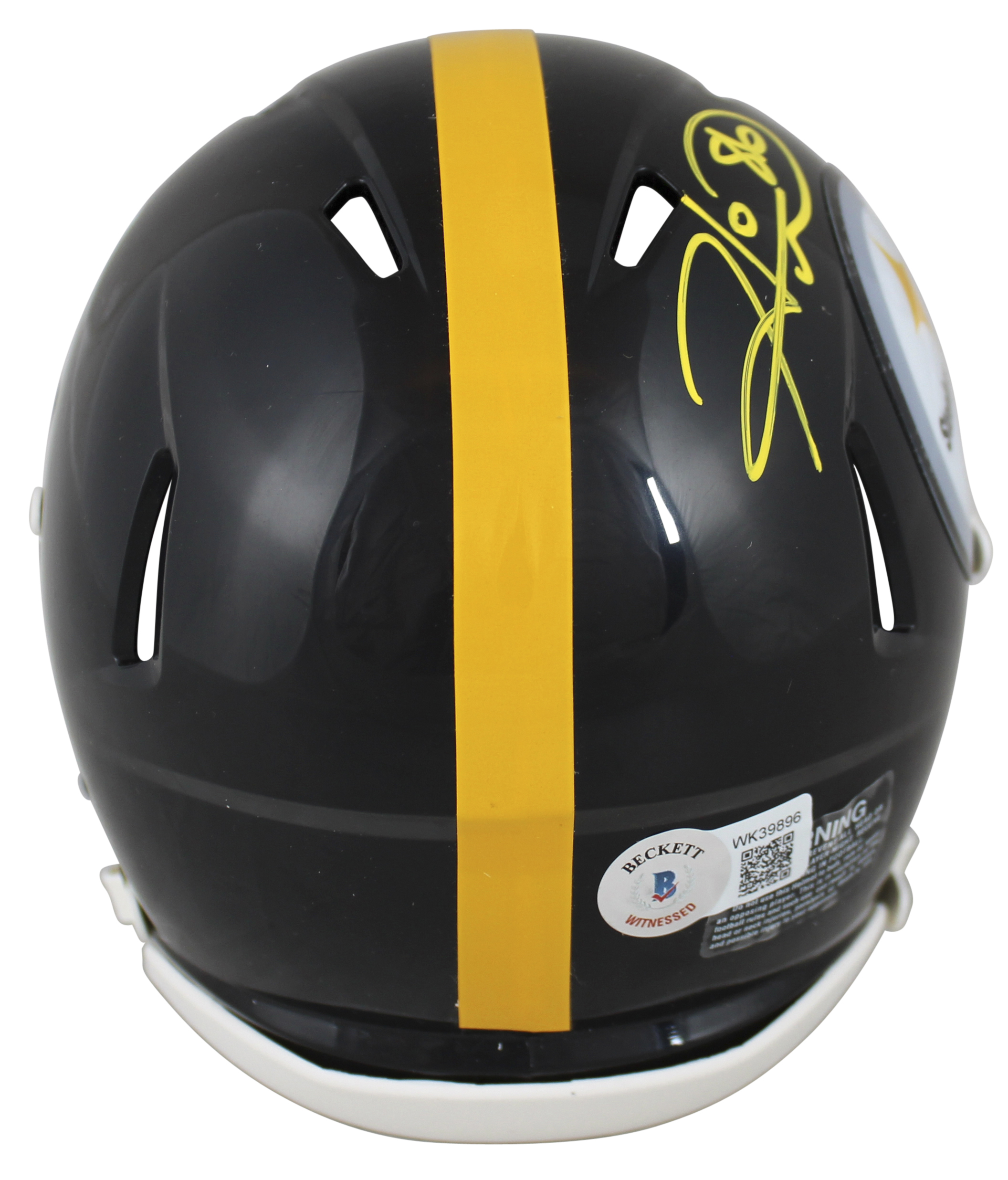 This Autographed w/ Yellow SIgnature Speed Mini Helmet has been Personally Signed by Hines Ward of the Pittsburgh Steelers. This item is 100% Authentic to include a hologram by Beckett Authentication Services. This item will come with the new Beckett Authentication hologram that has a scannable QR code rather than the traditional COA. If you would like to have a COA, you are welcome to reach out to Beckett for a printed certification once you receive your item. This is a BAS Witnessed Protection Program item which means a Beckett Authentication Service representative was present when this item was being signed. This is a stock item. We conducted an autograph signing with Hines Ward and we have several of these available. The one you will receive will be of equal quality to the one pictured. This item can be verified through BAS Witnessed.