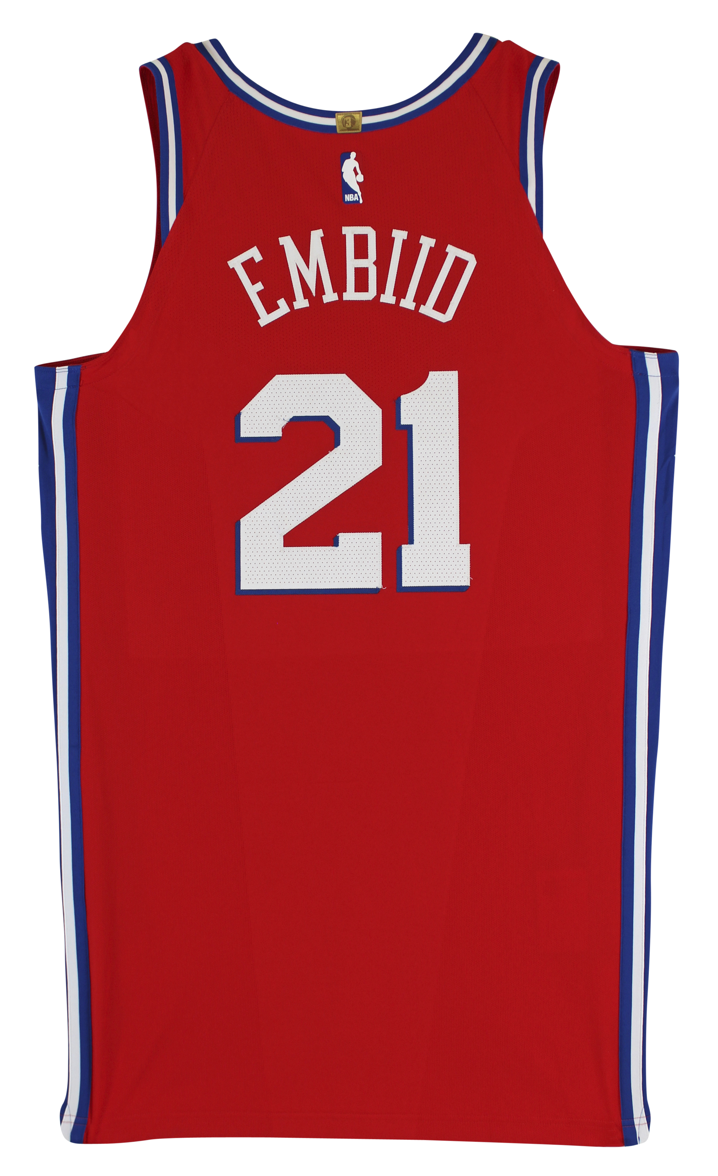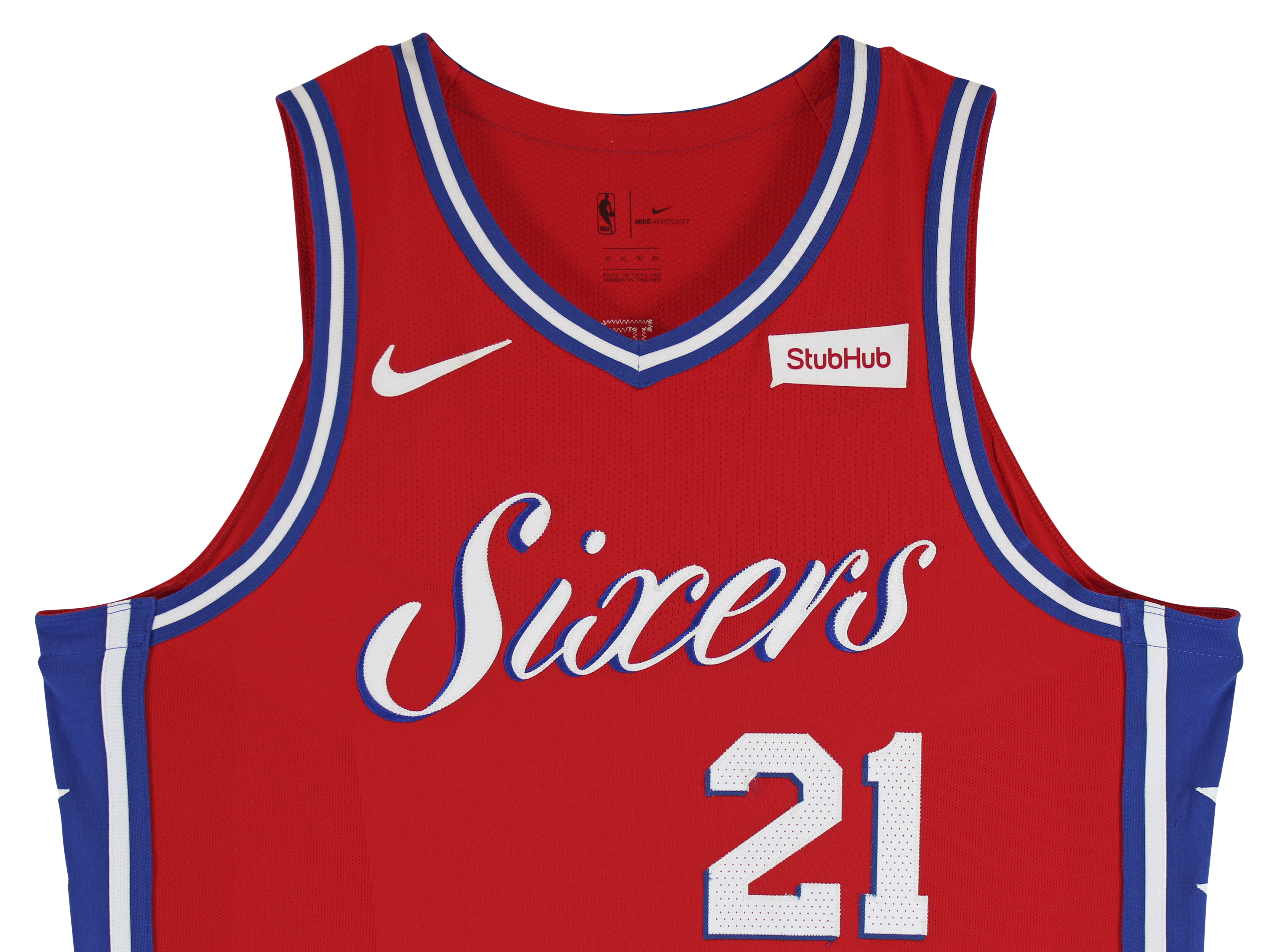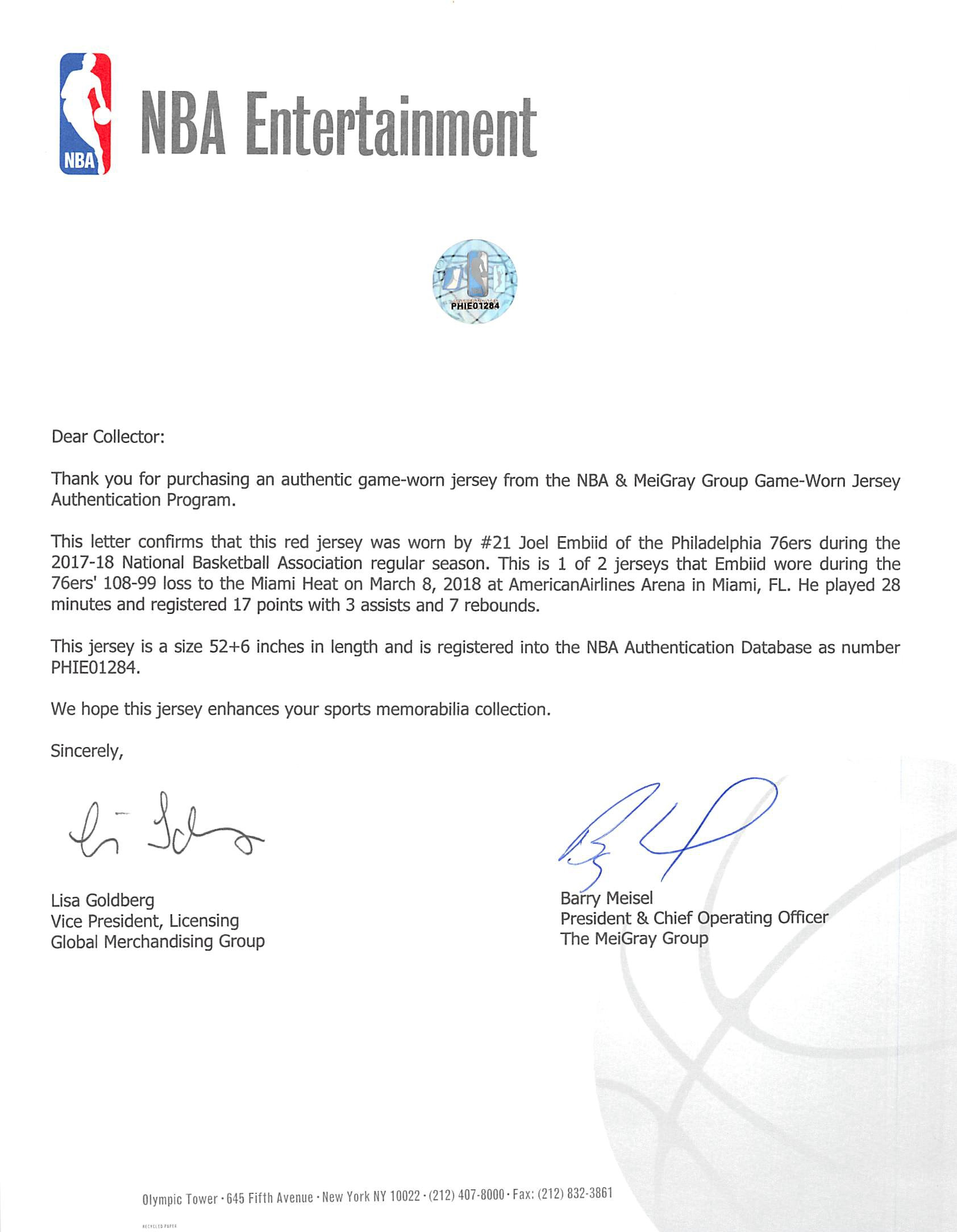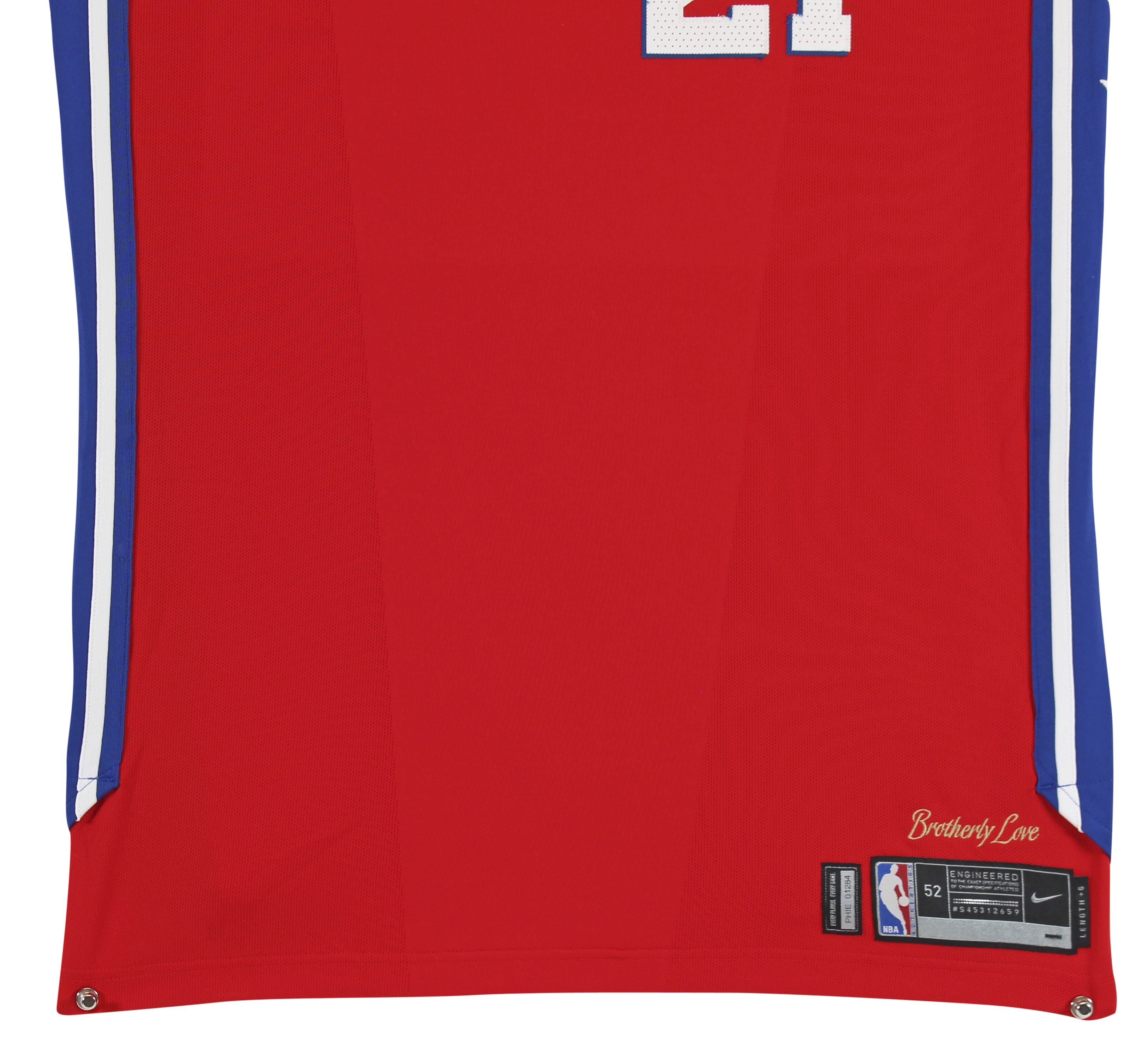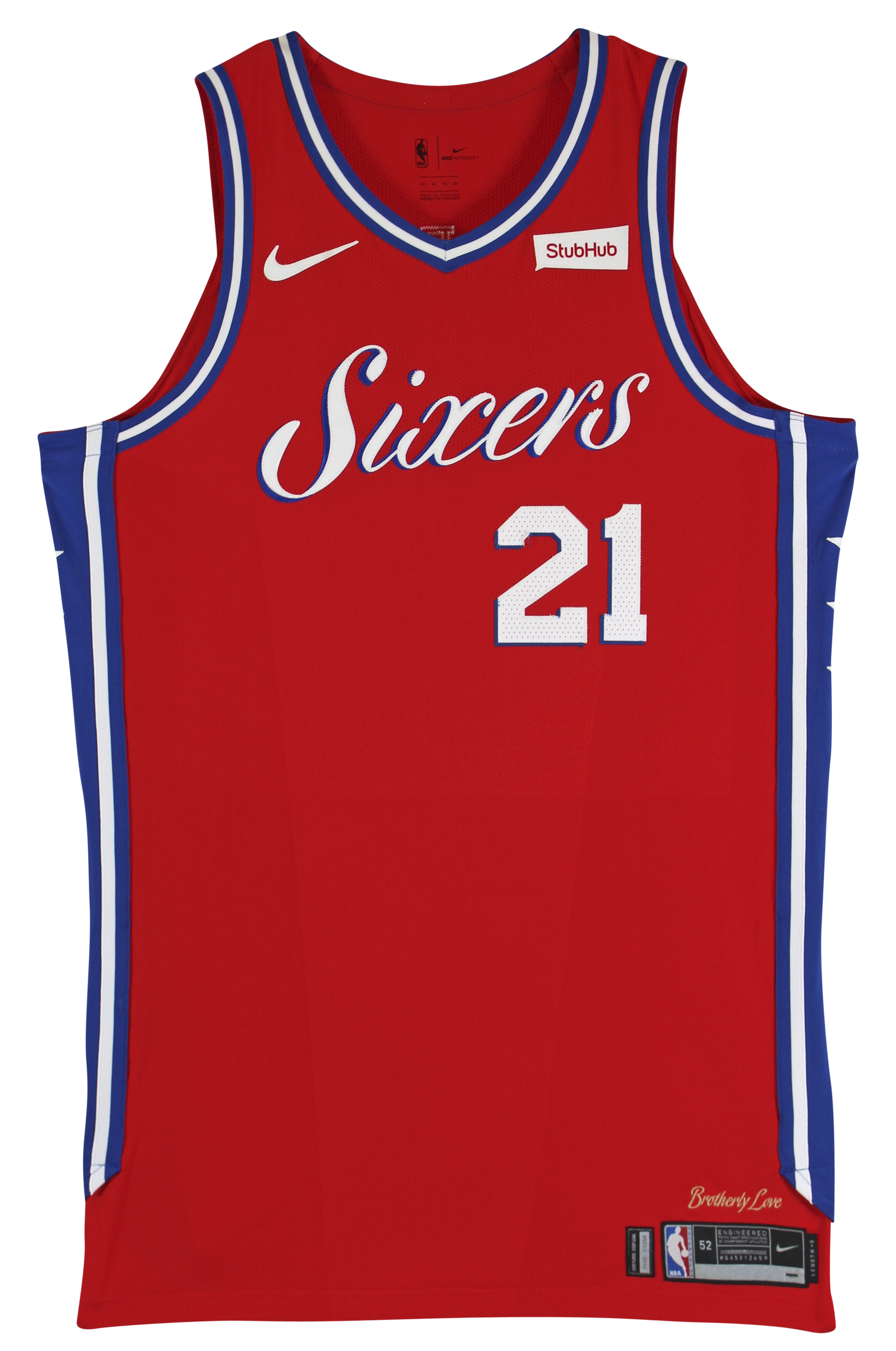 Joel Embiid wore this jersey during a game against the Miami Heat on March 8th, 2018. Embiid scored 17 points and added 7 rebounds in the contest. On the front left tail is the Nike manufacturer���s tag size ���52��� with an attached flag tag reading ���LENGTH +6���. Adjacent is an additional Nike tag reading ���PHIE01284���. Above this reads ���Brotherly Love��� embroidered in gold. On the left inseam is a Nike flag tag. Beneath this are jersey materials and washing instructions printed on. Further up the inseam is a black mic pocket. Printed beneath the rear collar reads ���Nike Areoswift��� along with the size ���52 XL���. On the upper left chest is the ���StubHub��� advertisement logo. On the upper right chest is a white Nike ���Swoosh��� logo. Across the chest reads ���Sixers��� in white on blue tackle twill. Adjacent below and on the back is the player number ���21��� in white perforated twill on blue tackle twill. Across the back is the player name ���EMBIID��� in white tackle twill. On the back collar is a gold tag reading the number ���3��� symbolizing the number of championships the 76ers have won. Below is an official ���NBA��� logo rubberized. This jersey is properly tagged, was presented to us as game-used and in our opinion shows appropriate use. Accompanied by an NBA LOA.