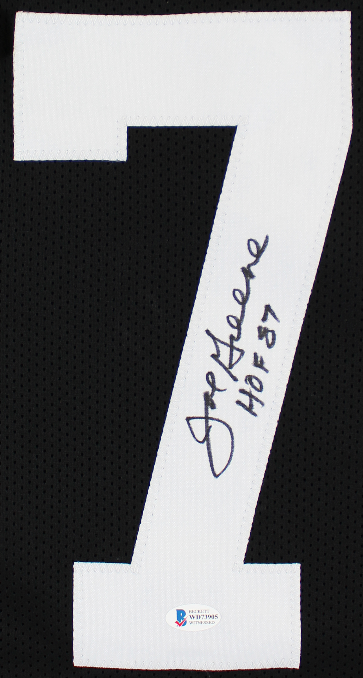 This Autographed Black Pro Style Framed Jersey with the inscription of "HOF 87" has been Personally Signed by Joe Greene of the Pittsburgh Steelers. This item may come with the new Beckett Authentication hologram that has a scannable QR code rather than the traditional COA. If you would like to have a COA, you are welcome to reach out to Beckett for a printed certification once you receive your item. This is a BAS Witnessed Protection Program item which means a Beckett Authentication Service representative was present when this item was being signed. This is a stock item. We conducted an autograph signing with Joe Greene and we have several of these available. The one you will receive will be of equal quality to the one pictured. This item can be verified through BAS Witnessed. This item has been professionally framed to overall dimensions of approximately 32 x 37 inches. This is a X-Large sized, non-branded, custom-stitched Framed Jersey.