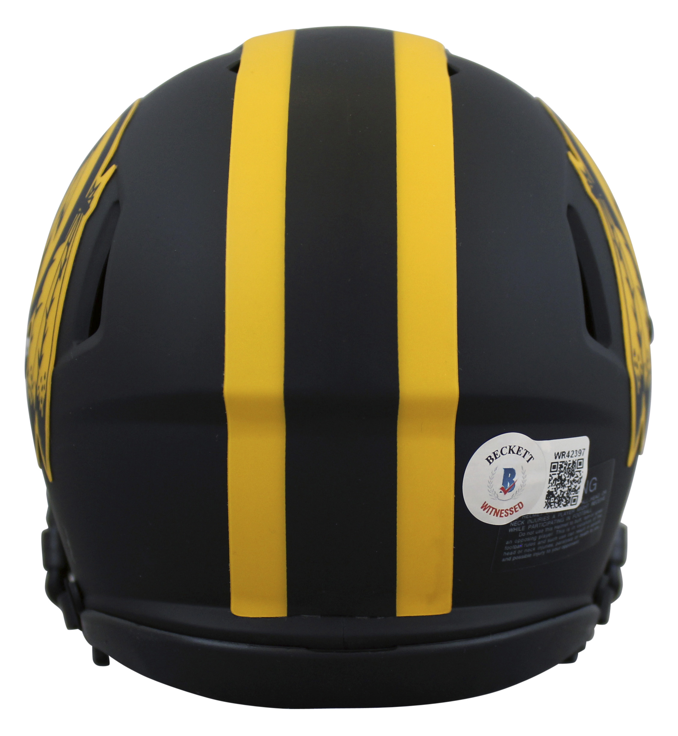 This Autographed Alternate Eclipse Speed Mini Helmet has been Personally Signed by John Riggins of the Washington Redskins. This item may come with the new Beckett Authentication hologram that has a scannable QR code rather than the traditional COA. If you would like to have a COA, you are welcome to reach out to Beckett for a printed certification once you receive your item. This is a BAS Witnessed Protection Program item which means a Beckett Authentication Service representative was present when this item was being signed. This is a stock item. We conducted an autograph signing with John Riggins and we have several of these available. The one you will receive will be of equal quality to the one pictured. This item can be verified through BAS Witnessed.