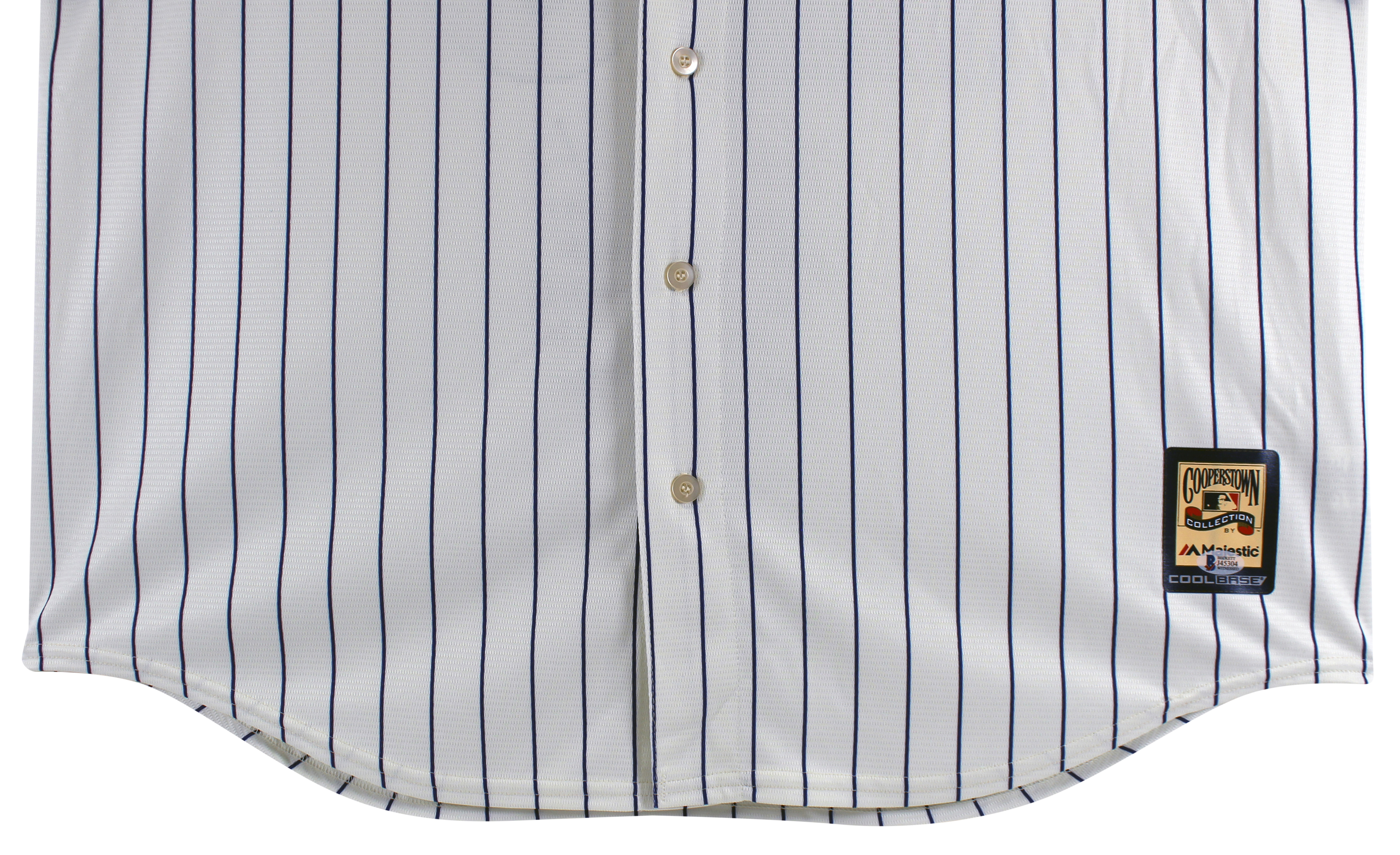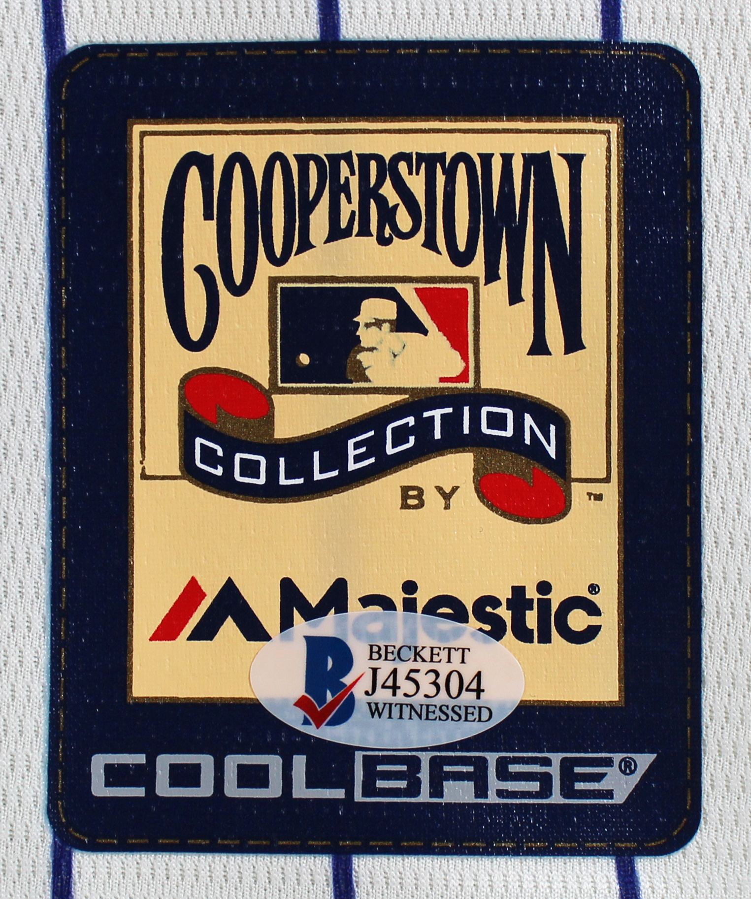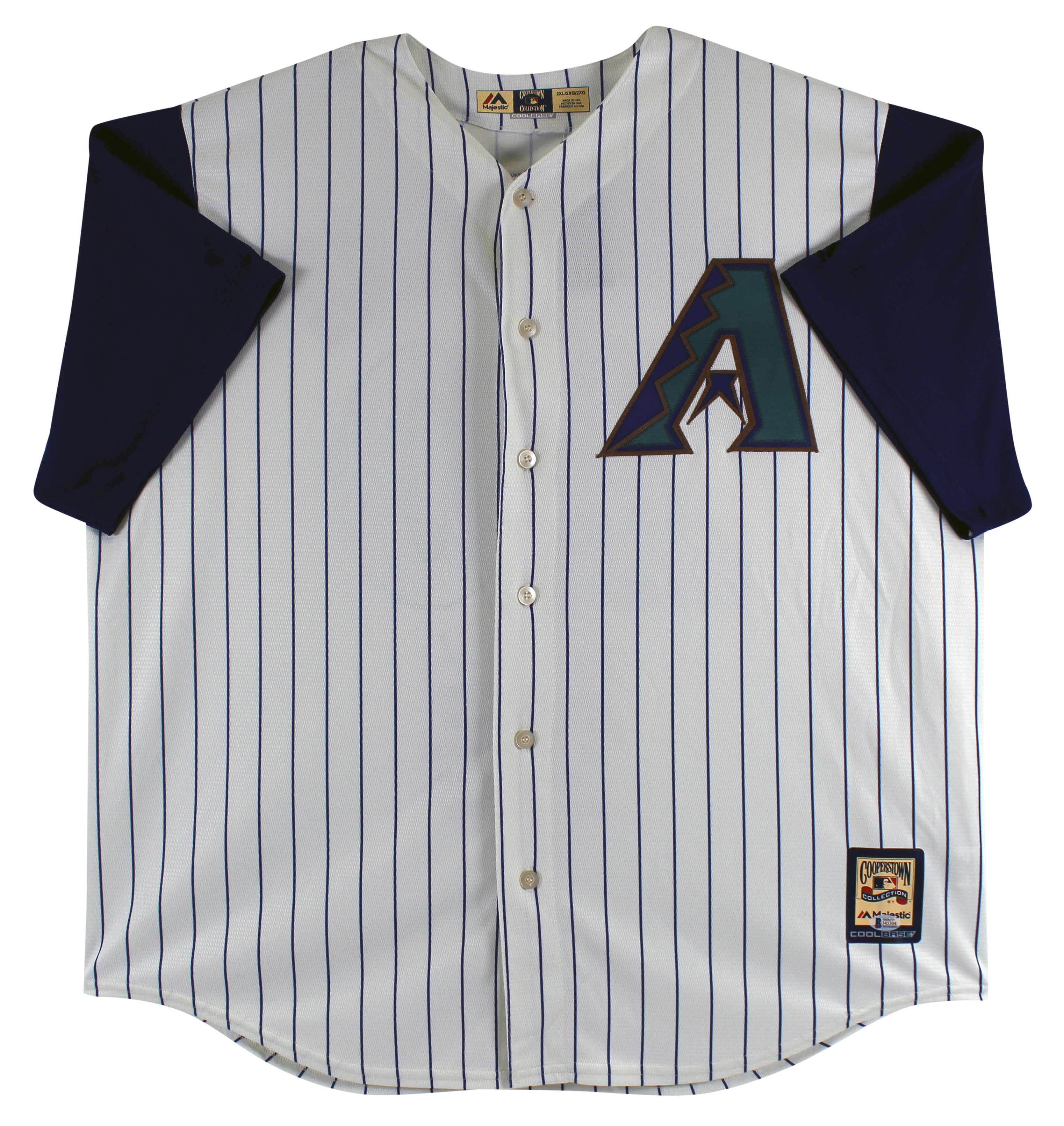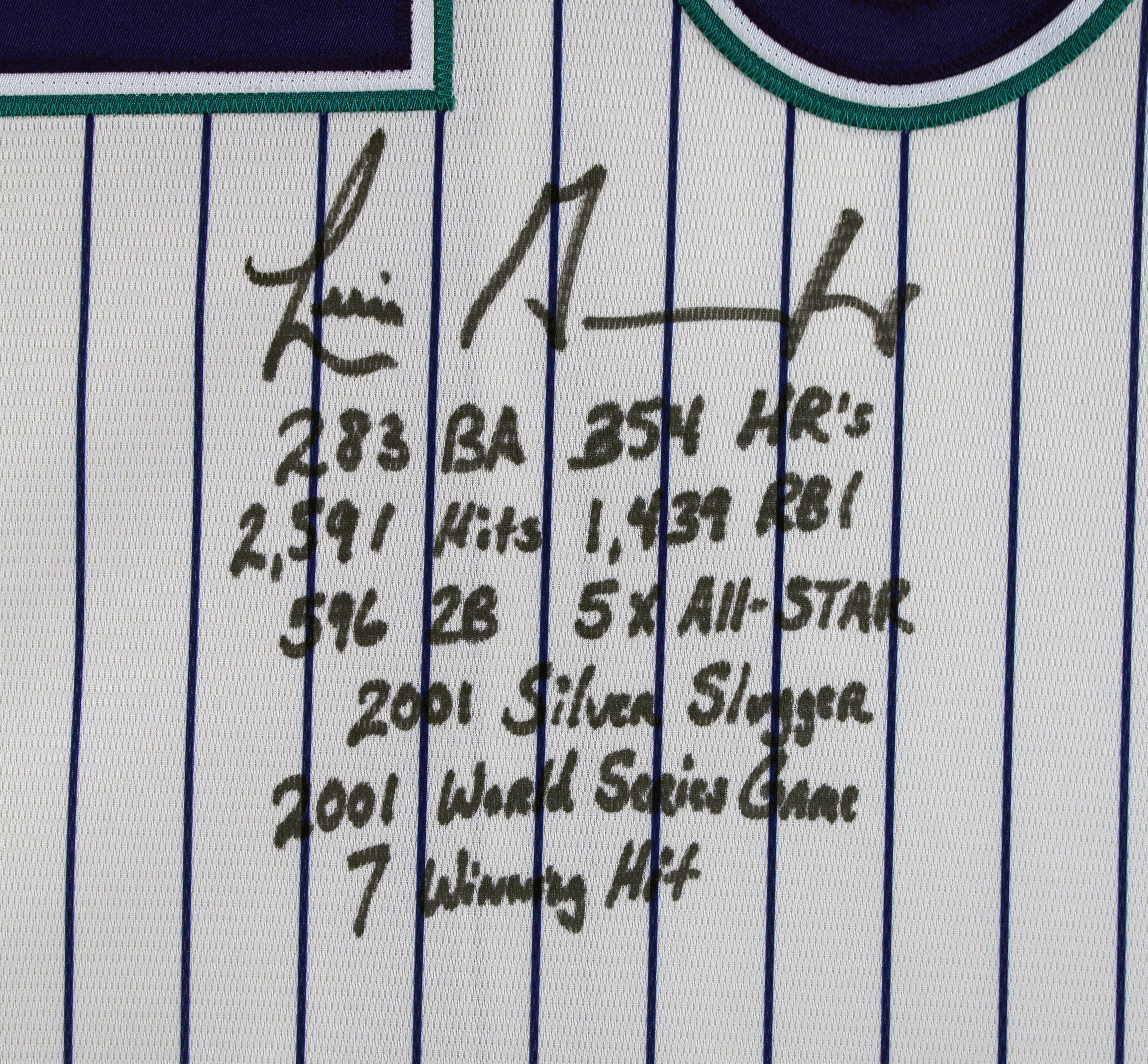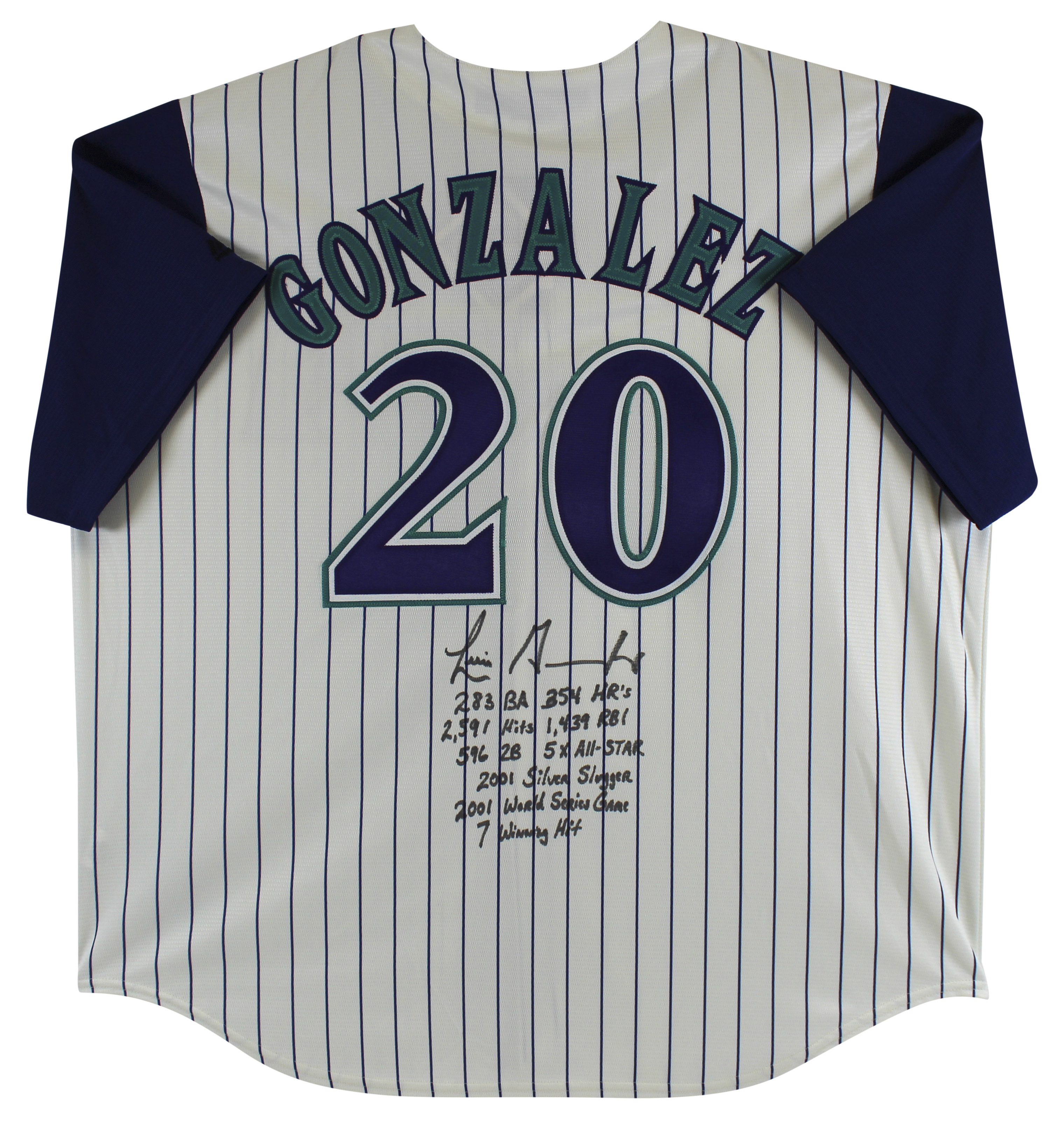 This Autographed Pinstripe Majestic Coolbase jersey with the inscription of ".283 BA, 354 HRs, 2,591 Hits, 1,439 RBI, 596 2B, 5X All Star, 2001 Silver Slugger, 2001 World Series Game 7 Game Winning Hit" has been Personally Signed by Luis Gonzalez of the Arizona Diamondbacks. This is a BAS Witnessed Protection Program item which means a Beckett Authentication Service representative was present when this item was being signed. We conducted an autograph signing with Luis Gonzalez where multiples of the same item were signed. While the photographs are representative of this item, the size, placement and strength of the signature may vary. Each item is hand signed, therefore, each autograph is unique. This item can be verified through BAS Witnessed.