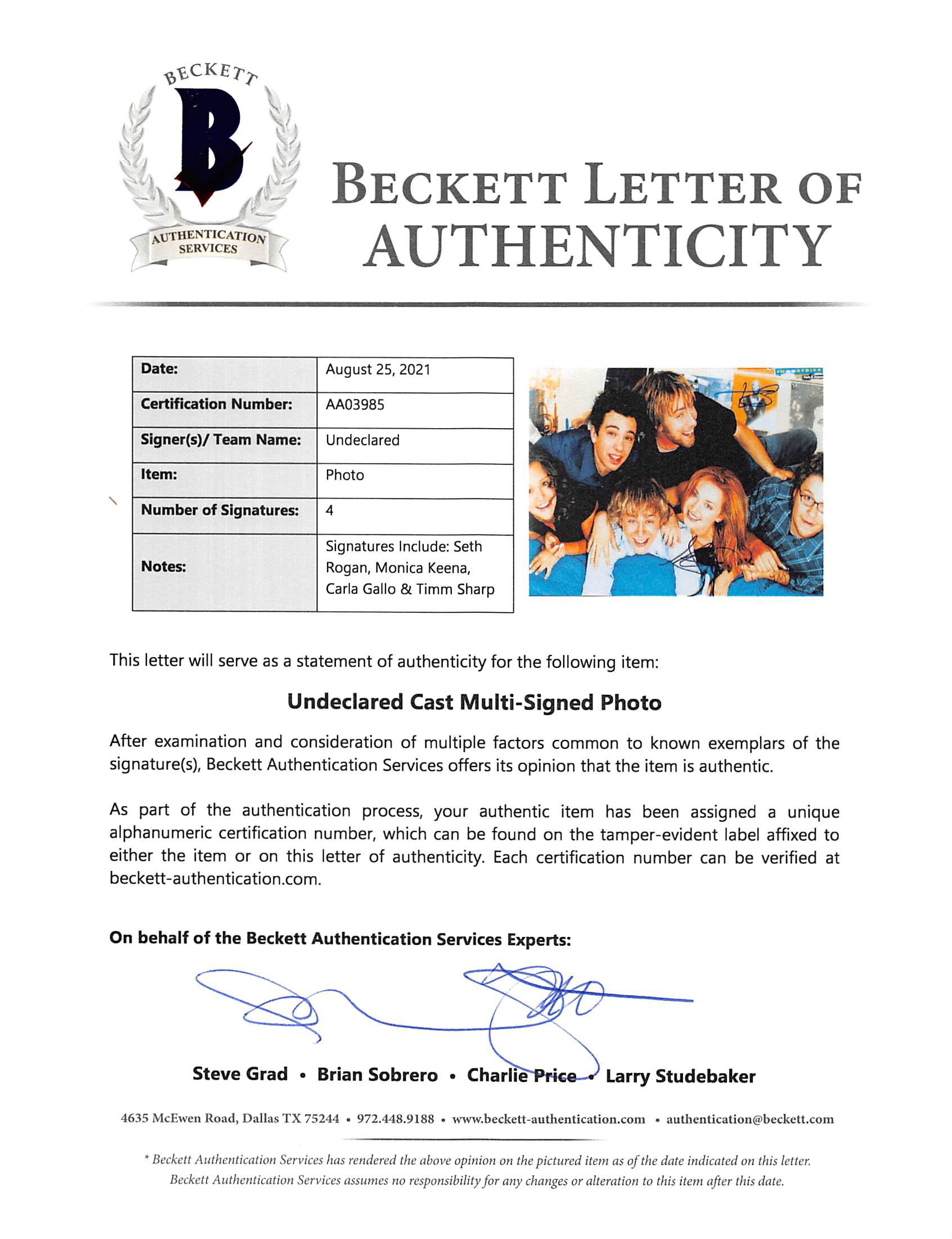 This Autographed 12x18 Photo has been Personally Signed by Seth Rogan, Monica Keena, Carla Gallo & Timm Sharpe of Undeclared. This item is 100% Authentic to include a Certificate of Authenticity (COA) / hologram by Beckett Authentication Services. The authenticity can be verified on Beckett Authentication Services website.