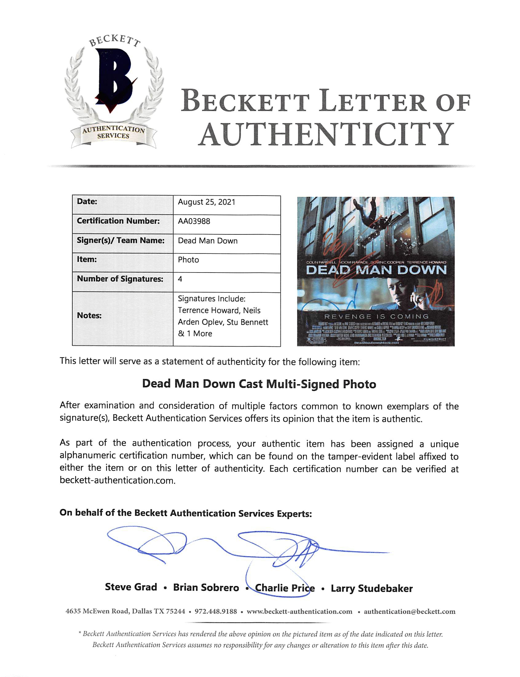 This Autographed 12x18 Photo has been Personally Signed by Terrence Howard, Neils Arden Oplev, Stu Bennett & 1 More of Dead Man Down. This item is 100% Authentic to include a Certificate of Authenticity (COA) / hologram by Beckett Authentication Services. The authenticity can be verified on Beckett Authentication Services website.