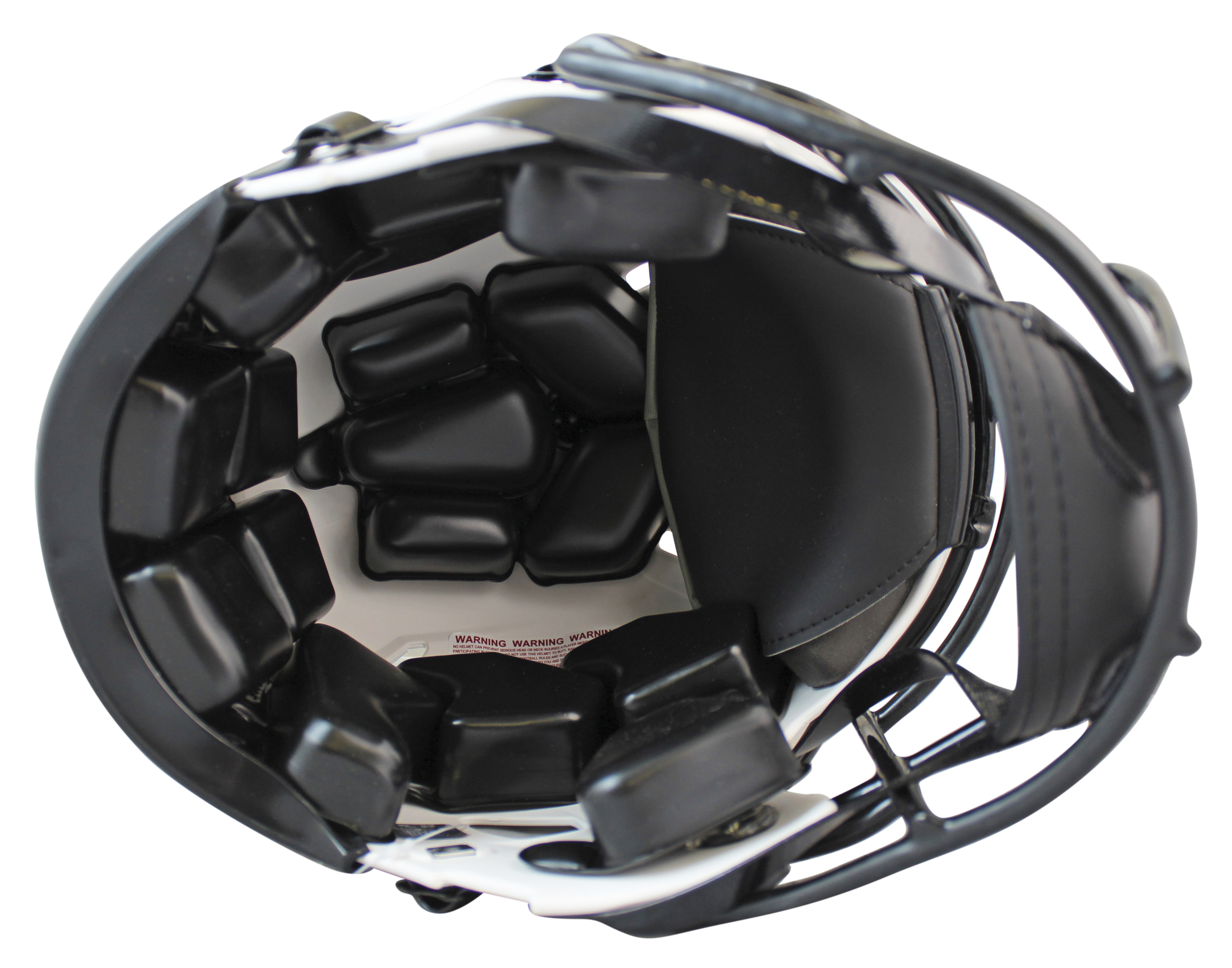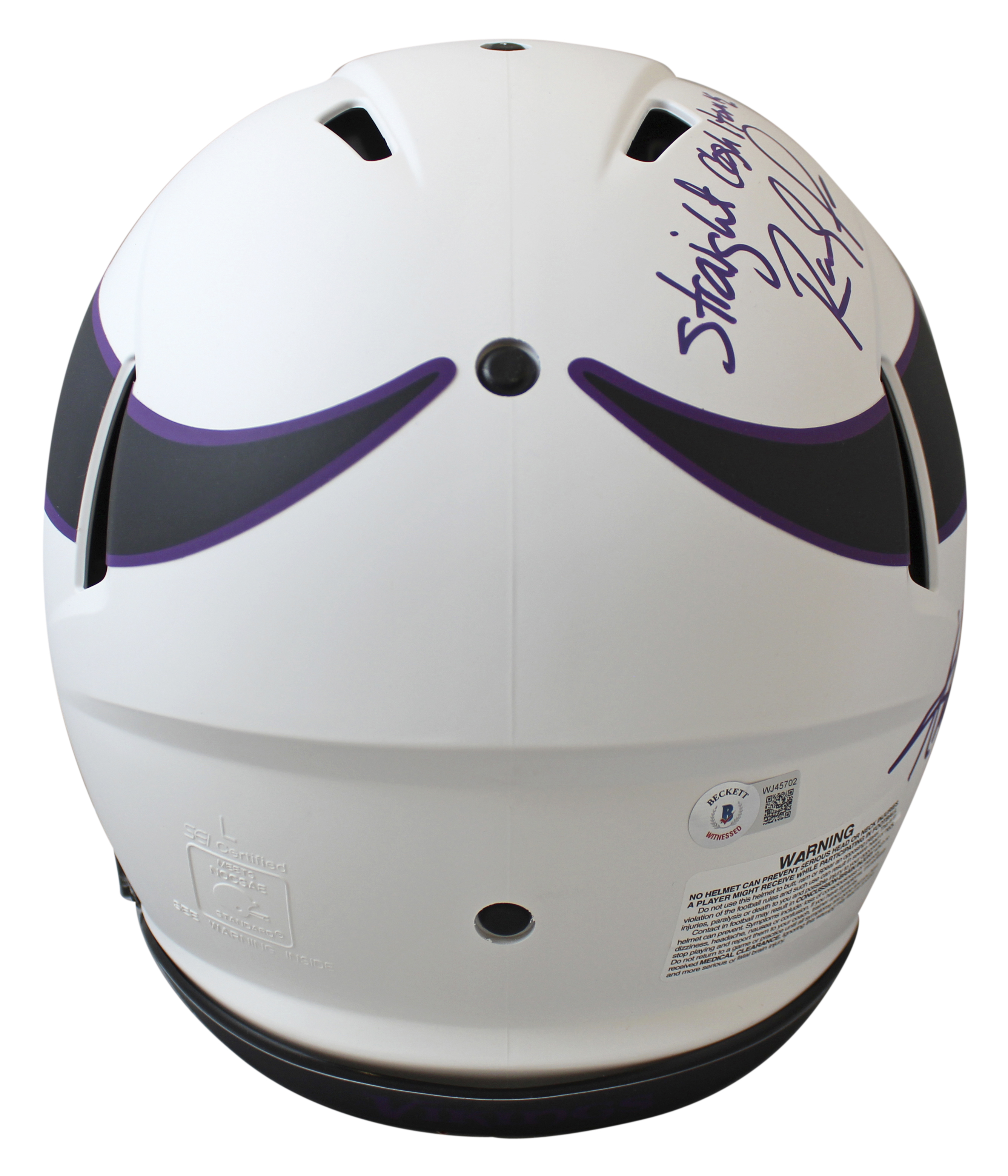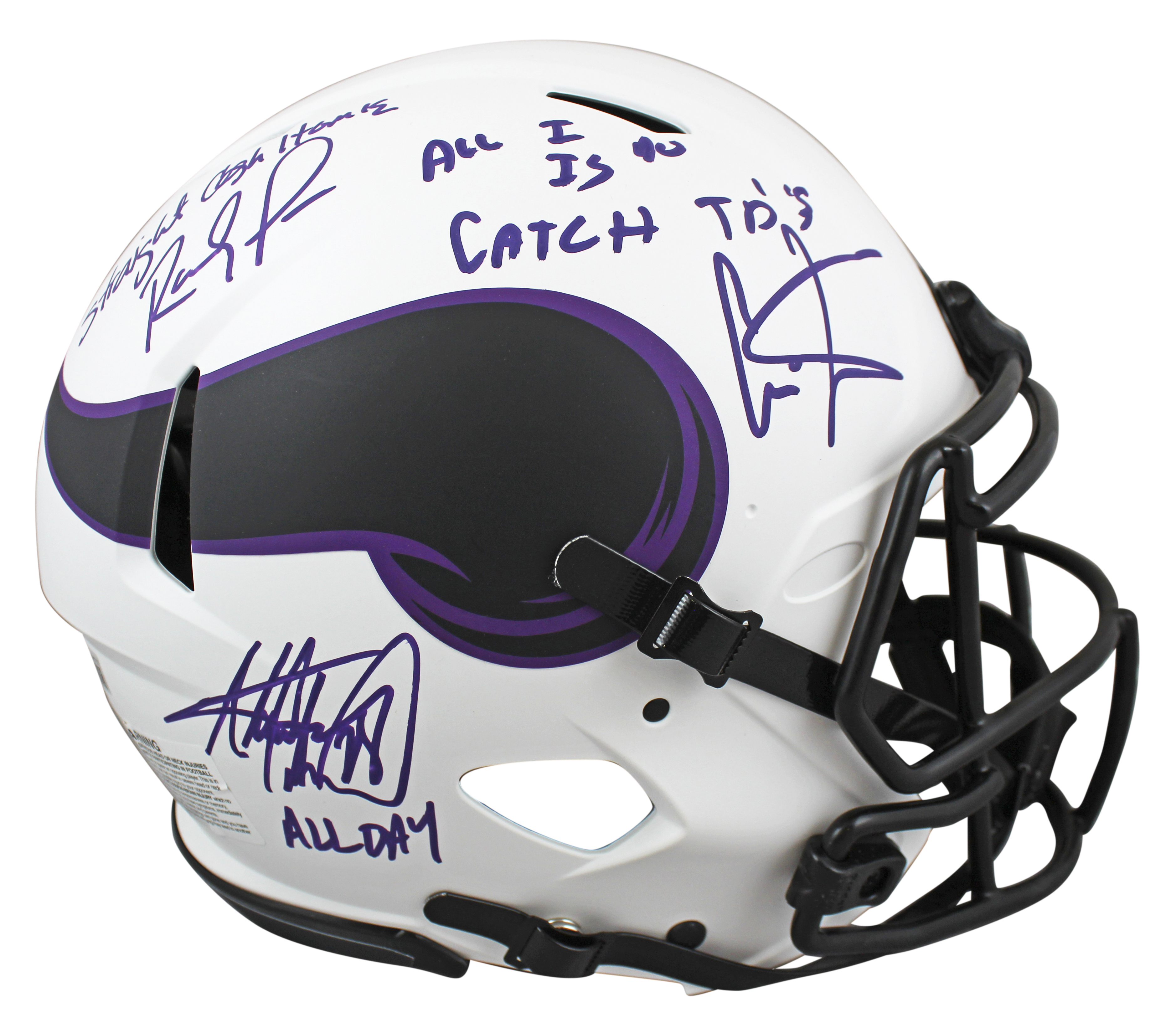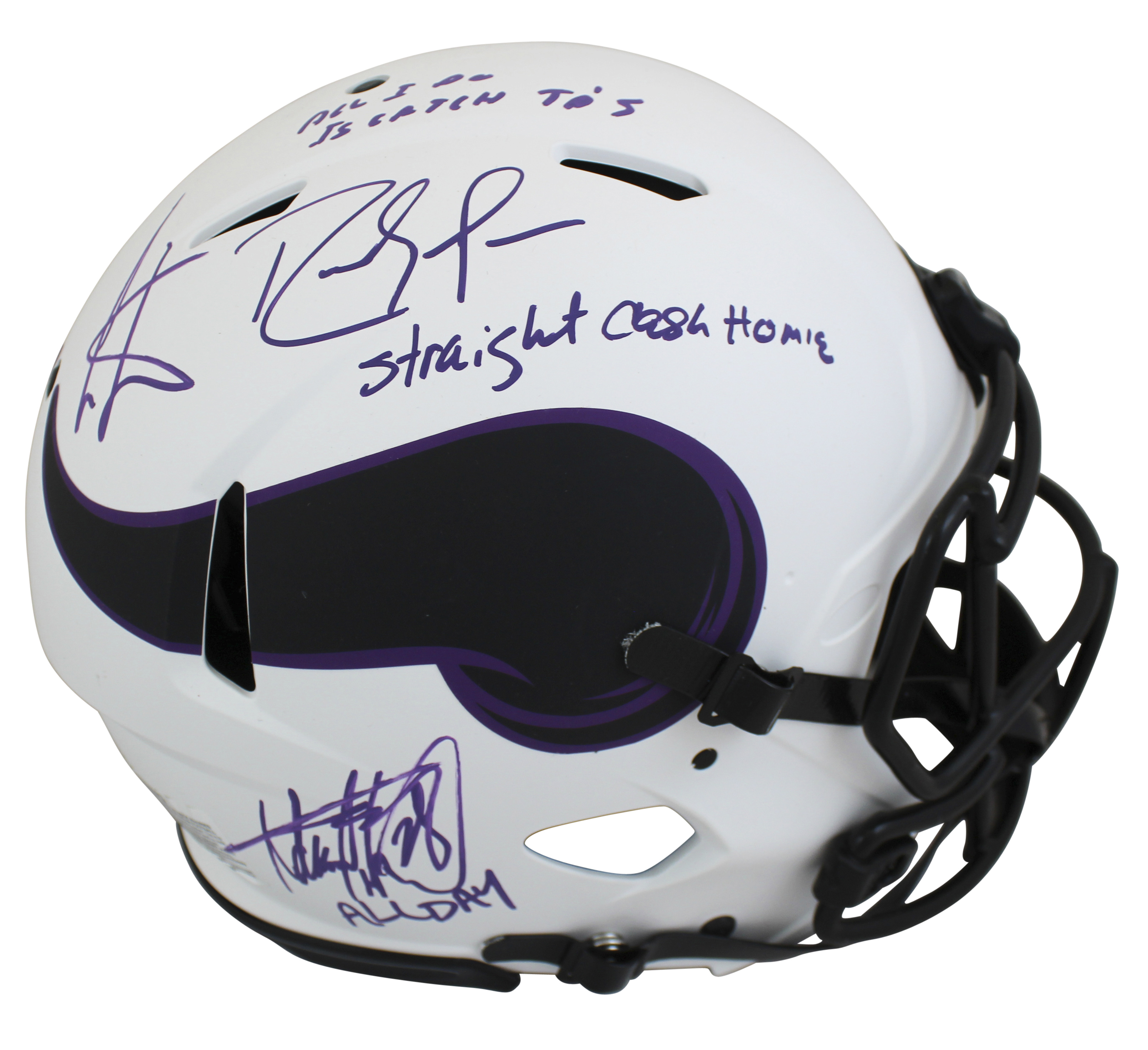 This Autographed Alternate Lunar Riddell Authentic Full Size Speed Proline Helmet with the inscription of "Straight Cash Homie (Moss), All I Do Is Catch TDs (Carter), All Day (Peterson)" has been Personally Signed by Randy Moss, Cris Carter & Adrian Peterson of the Minnesota Vikings. TThis item is 100% Authentic to include a Certificate of Authenticity (COA) / hologram by Beckett Authentication Services. This is a BAS Witnessed Protection Program item which means a Beckett Authentication Service representative was present when this item was being signed. We conducted an autograph signing with Randy Moss, Cris Carter & Adrian Peterson where multiples of the same item were signed. While the photographs are representative of this item, the size, placement and strength of the signature may vary. Each item is hand signed, therefore, each autograph is unique. This item can be verified through BAS Witnessed