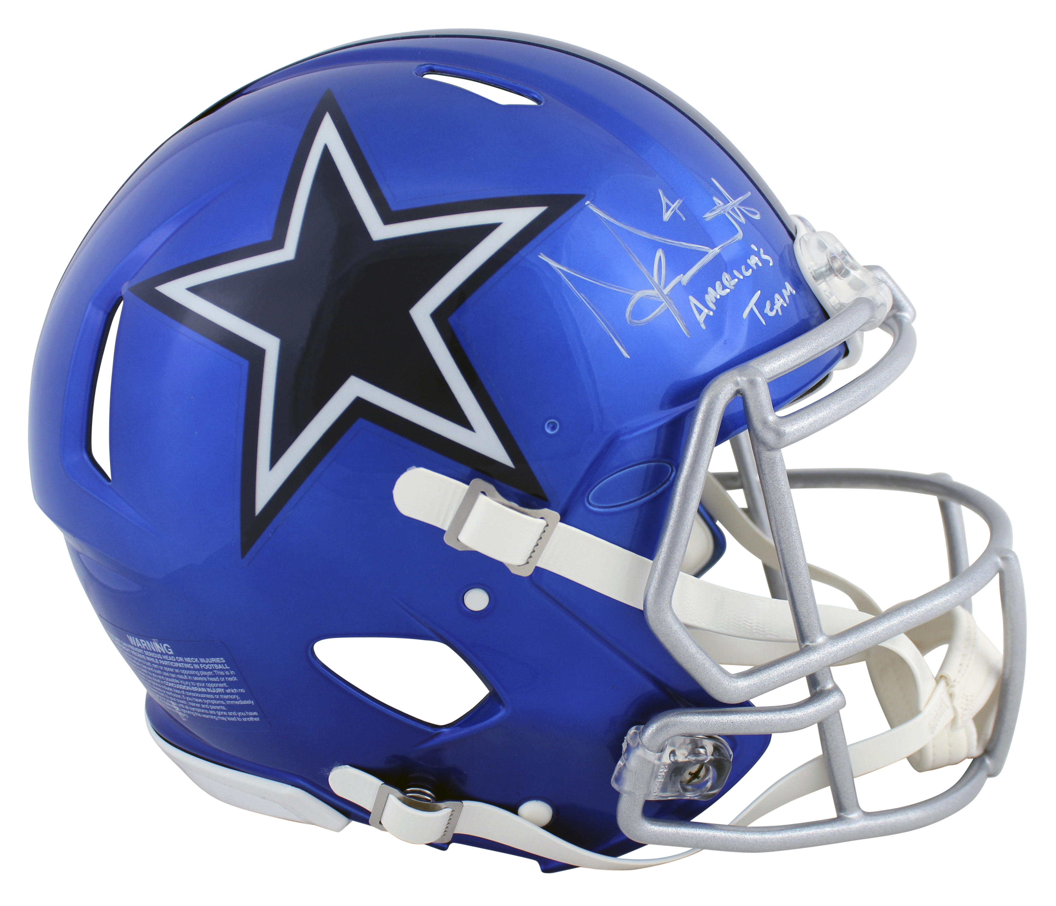 This Autographed Alternate Flash Riddell Authentic Full Size Speed Proline Helmet with the inscription of "America's Team" has been Personally Signed by Dak Prescott of the Dallas Cowboys. This item is 100% Authentic to include a hologram by Beckett Authentication Services. This item will come with the new Beckett Authentication hologram that has a scannable QR code rather than the traditional COA. If you would like to have a COA, you are welcome to reach out to Beckett for a printed certification once you receive your item. This is a BAS Witnessed Protection Program item which means a Beckett Authentication Service representative was present when this item was being signed. We conducted an autograph signing with Dak Prescott where multiples of the same item were signed. While the photographs are representative of this item, the size, placement and strength of the signature may vary. Each item is hand signed, therefore, each autograph is unique. This item can be verified through BAS Witnessed.