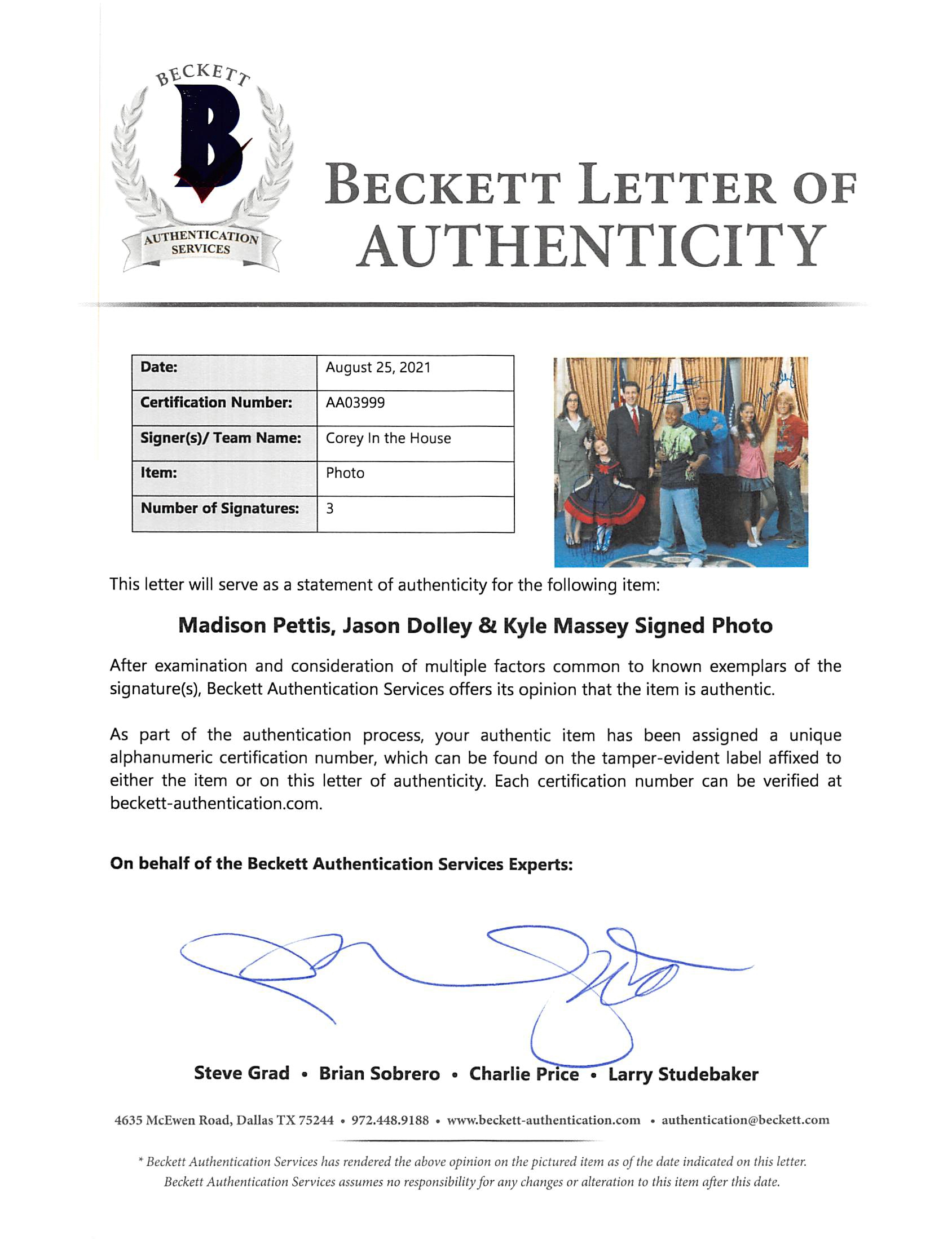 This Autographed 11x14 Photo has been Personally Signed by Madison Pettis, Jason Dolley & Kyle Massey of Corey In The House. This item is 100% Authentic to include a Certificate of Authenticity (COA) / hologram by Beckett Authentication Services. The authenticity can be verified on Beckett Authentication Services website.