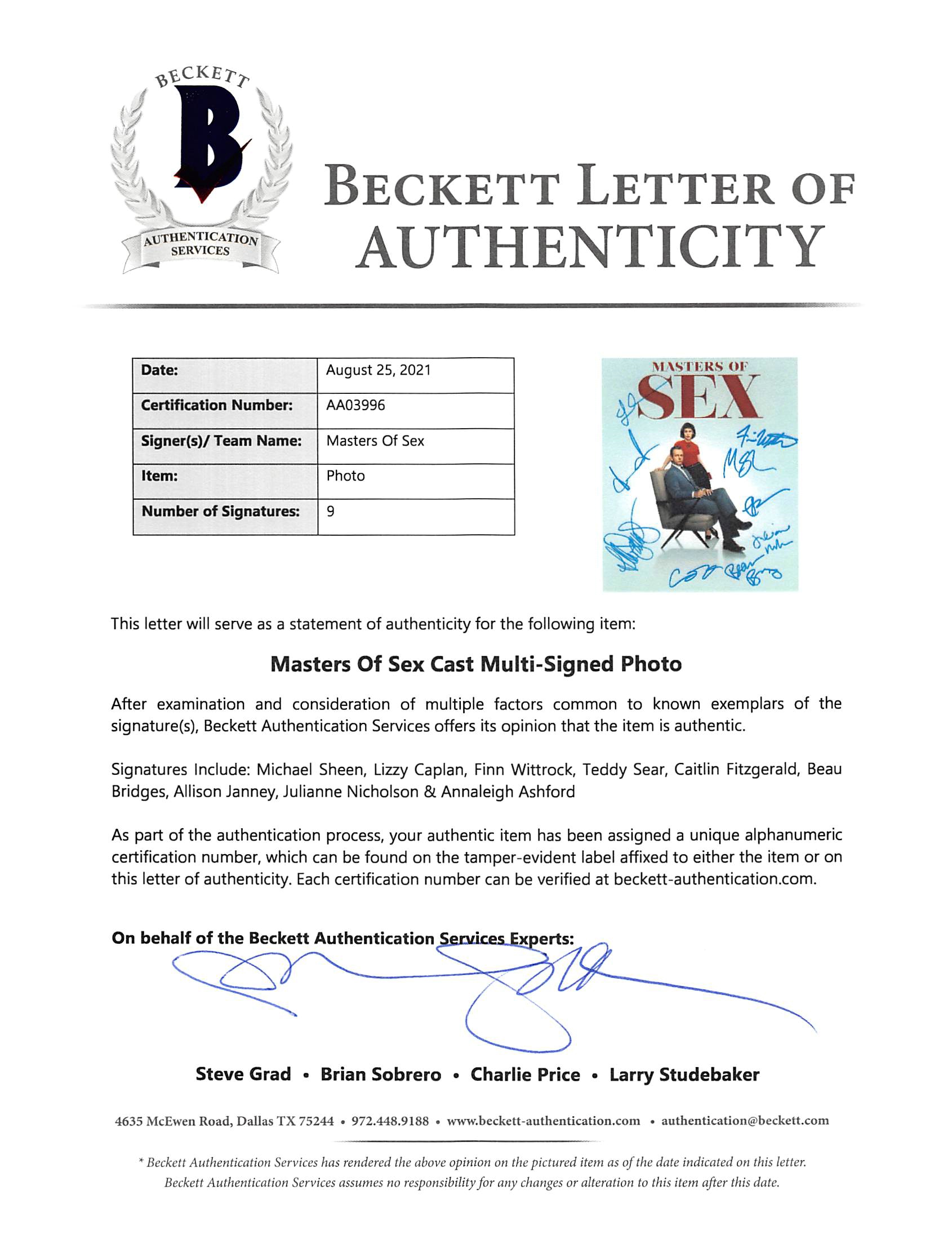 This Autographed 11x14 Photo has been Personally Signed by Michael Sheen, Lizzy Caplan, Finn Wittrock, Teddy Sear, Caitlin Fitzgerald, Beau Bridges, Allison Janney, Julianne Nicholson & Annaleigh Ashford of Masters of Sex. This item is 100% Authentic to include a Certificate of Authenticity (COA) / hologram by Beckett Authentication Services. The authenticity can be verified on Beckett Authentication Services website.