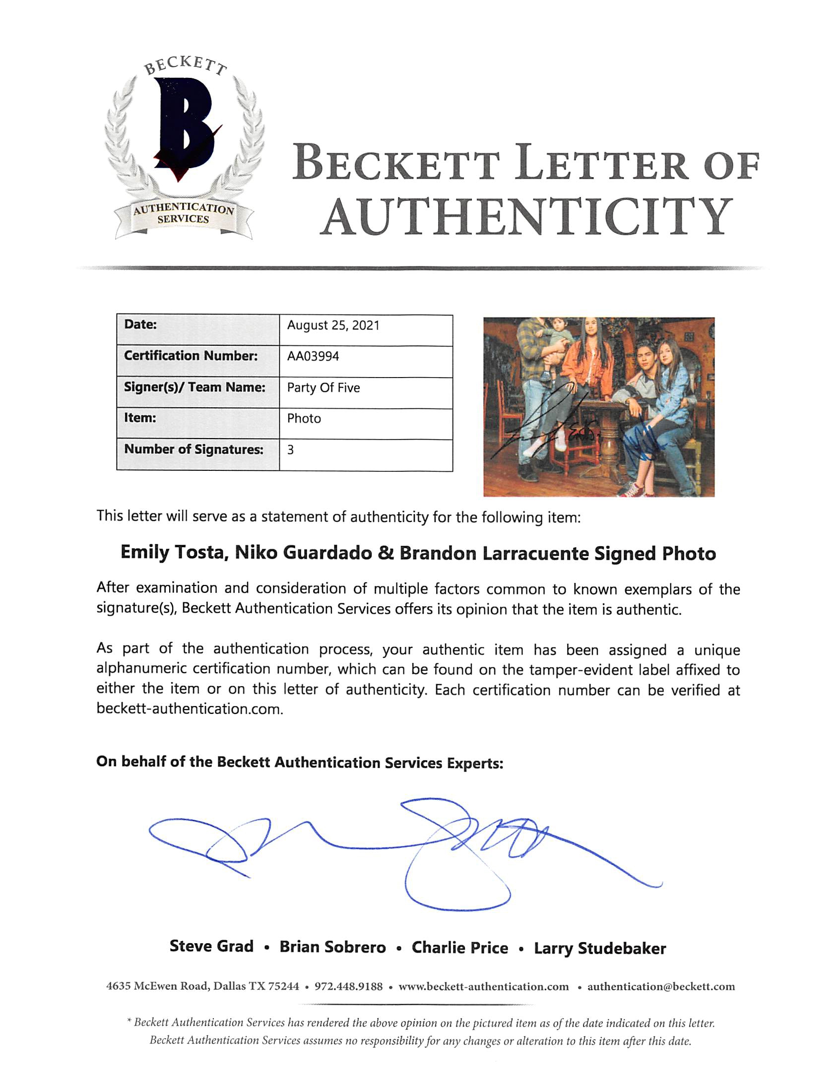This Autographed 8x10 Photo has been Personally Signed by Emily Tosta, Niko Guardado & Brandon Larracuente of Party of Five. This item is 100% Authentic to include a Certificate of Authenticity (COA) / hologram by Beckett Authentication Services. The authenticity can be verified on Beckett Authentication Services website.