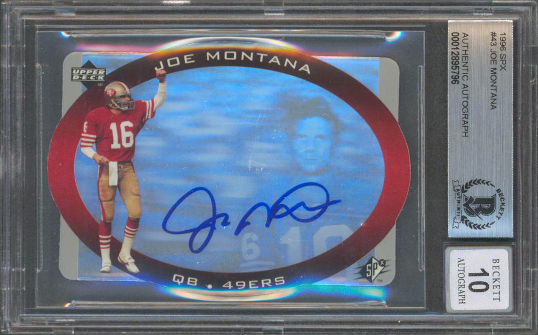 This Autographed Auto Graded Gem Mint 10! 1996 SPX #43 Card has been Personally Signed by Joe Montana of the San Francisco 49ers. This item is 100% Authentic, it comes slabbed and authenticated by Beckett Authentication Services. We conducted an autograph signing with where multiples of the same item were signed. While the photographs in this listing are representative of this item, the size, placement and strength of the signature may vary. Each item is hand signed, therefore, each autograph is unique.