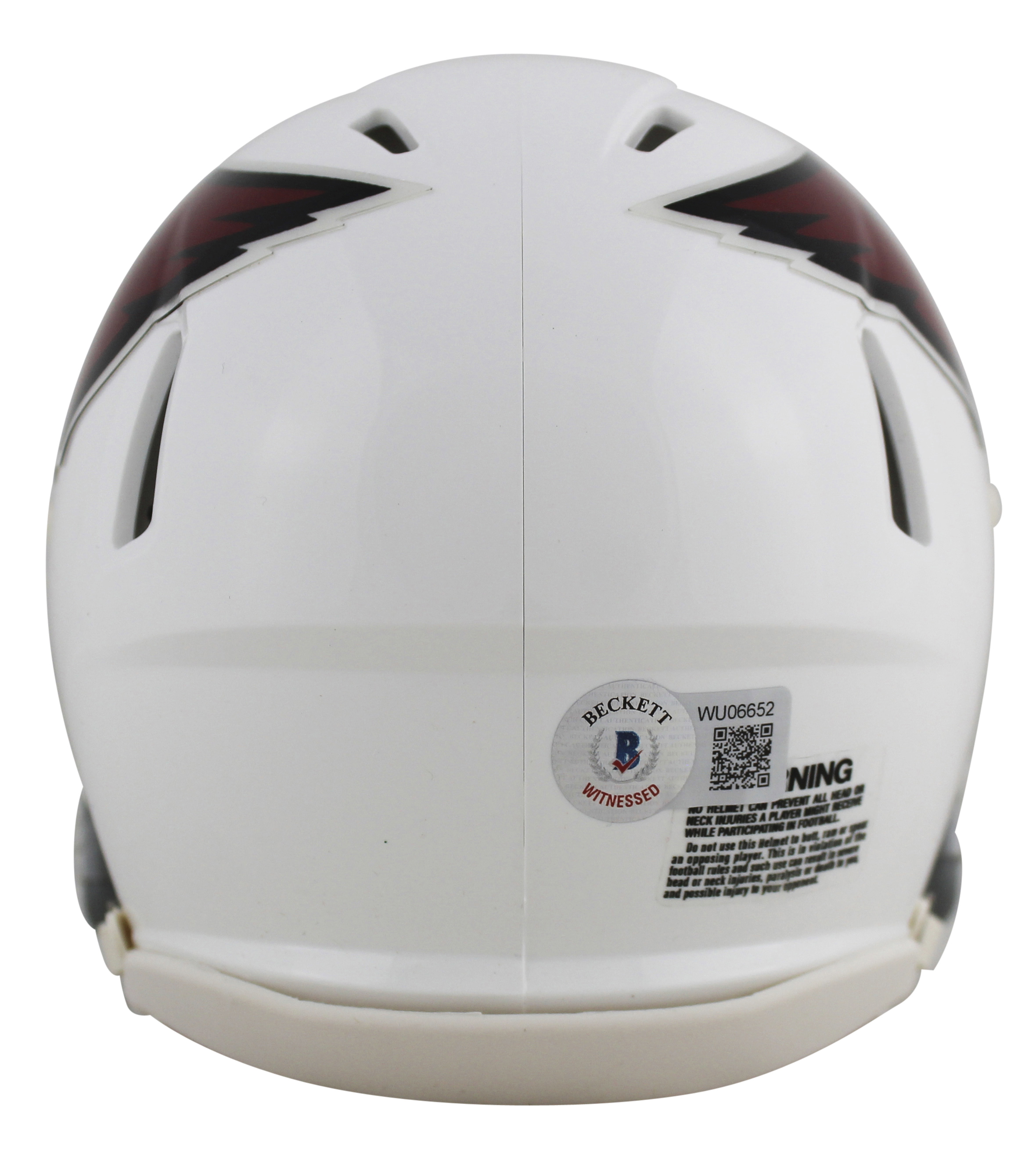 This Autographed Mini Helmet has been Personally Signed by Kurt Warner of the Arizona Cardinals. This item is 100% Authentic to include a hologram by Beckett Authentication Services. This item will come with the new Beckett Authentication hologram that has a scannable QR code rather than the traditional COA. If you would like to have a COA, you are welcome to reach out to Beckett for a printed certification once you receive your item. This is a BAS Witnessed Protection Program item which means a Beckett Authentication Service representative was present when this item was being signed. We conducted an autograph signing with Kurt Warner where multiples of the same item were signed. While the photographs are representative of this item, the size, placement and strength of the signature may vary. Each item is hand signed, therefore, each autograph is unique. This item can be verified through BAS Witnessed.